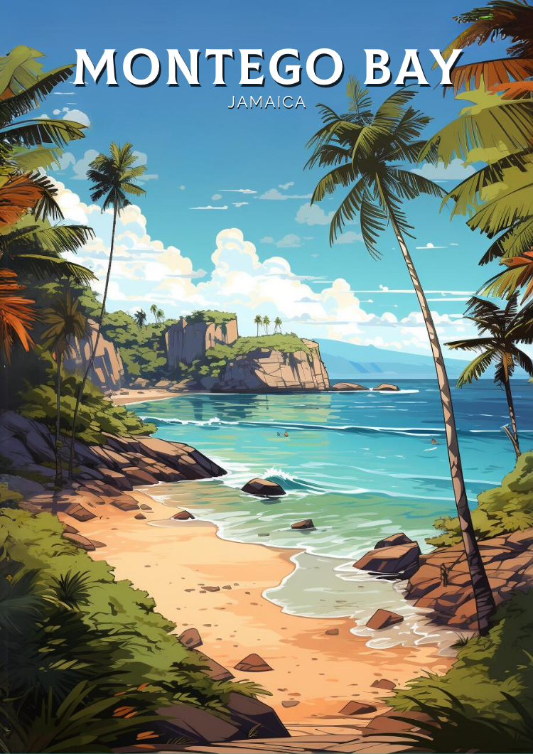 Découvrez la beauté vibrante des Caraïbes avec notre affiche de voyage de Montego Bay . Cette œuvre jamaïcaine met en valeur les eaux turquoise, les plages de sable fin et la culture dynamique de Montego Bay. Elle est idéale pour les passionnés de voyages, les amoureux d'escapades tropicales et les amateurs d'art mural coloré. Apportez une touche de paradis insulaire à votre maison, votre bureau ou votre mur de galerie.