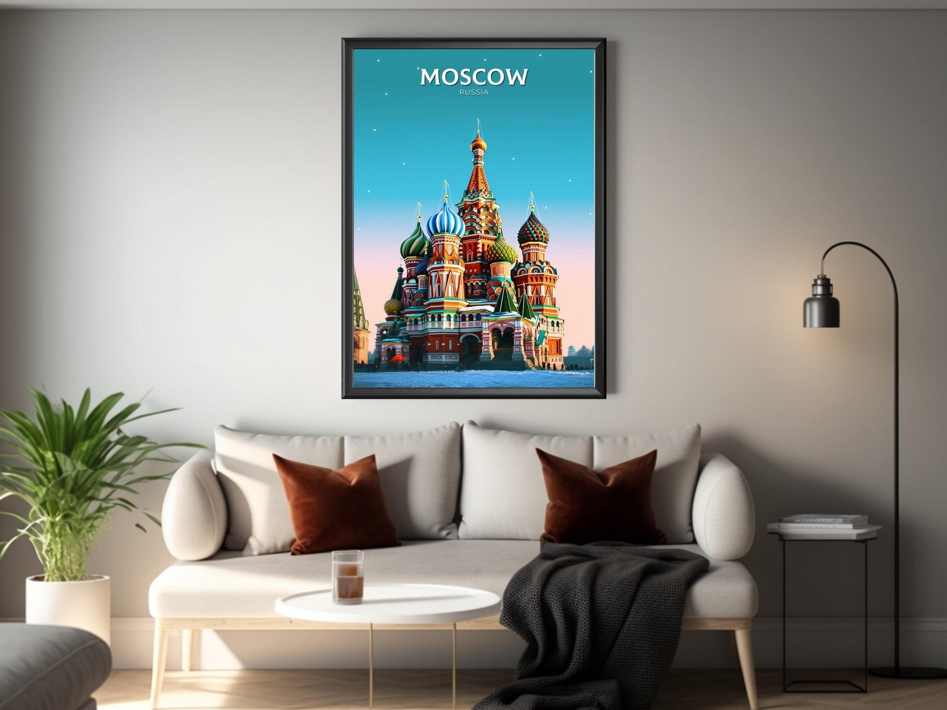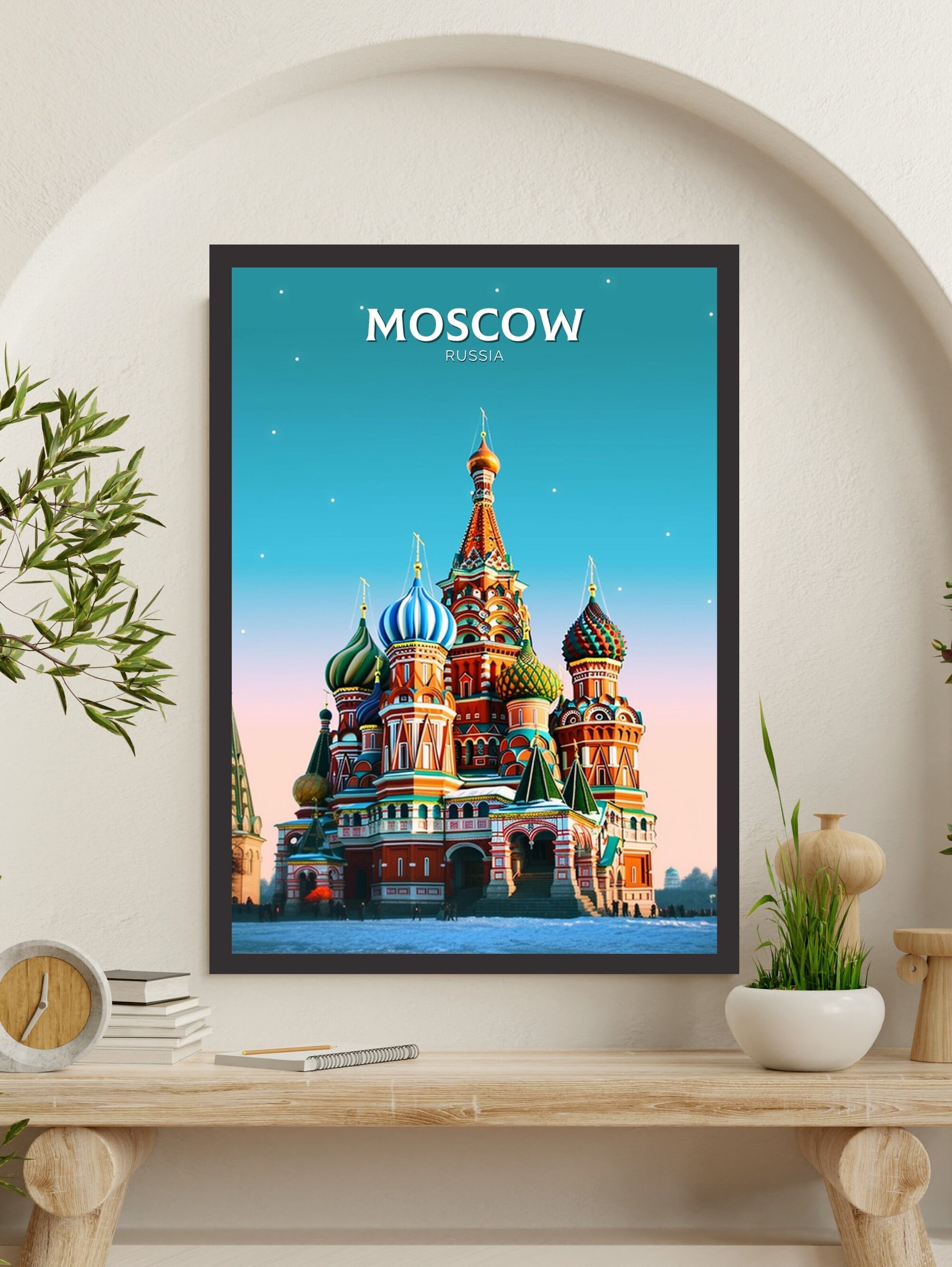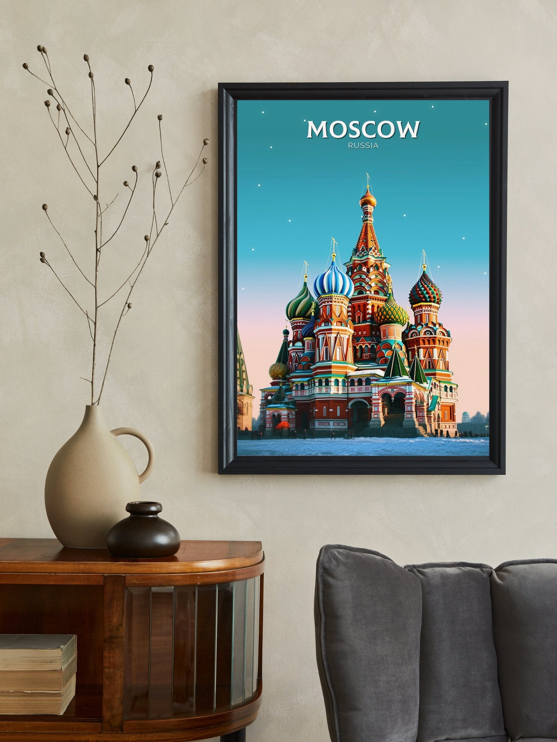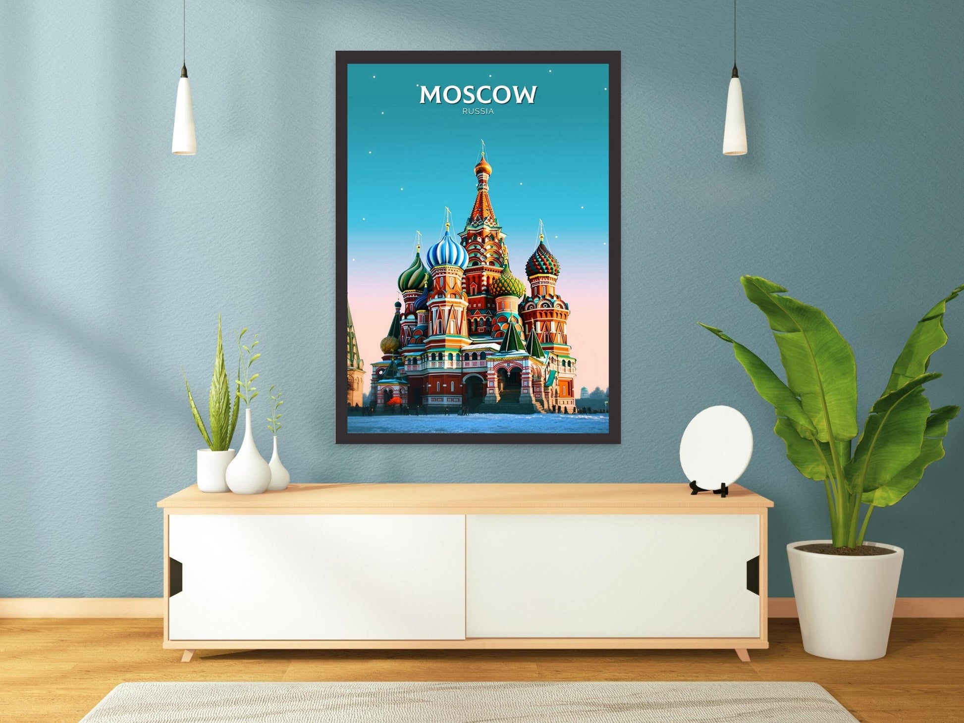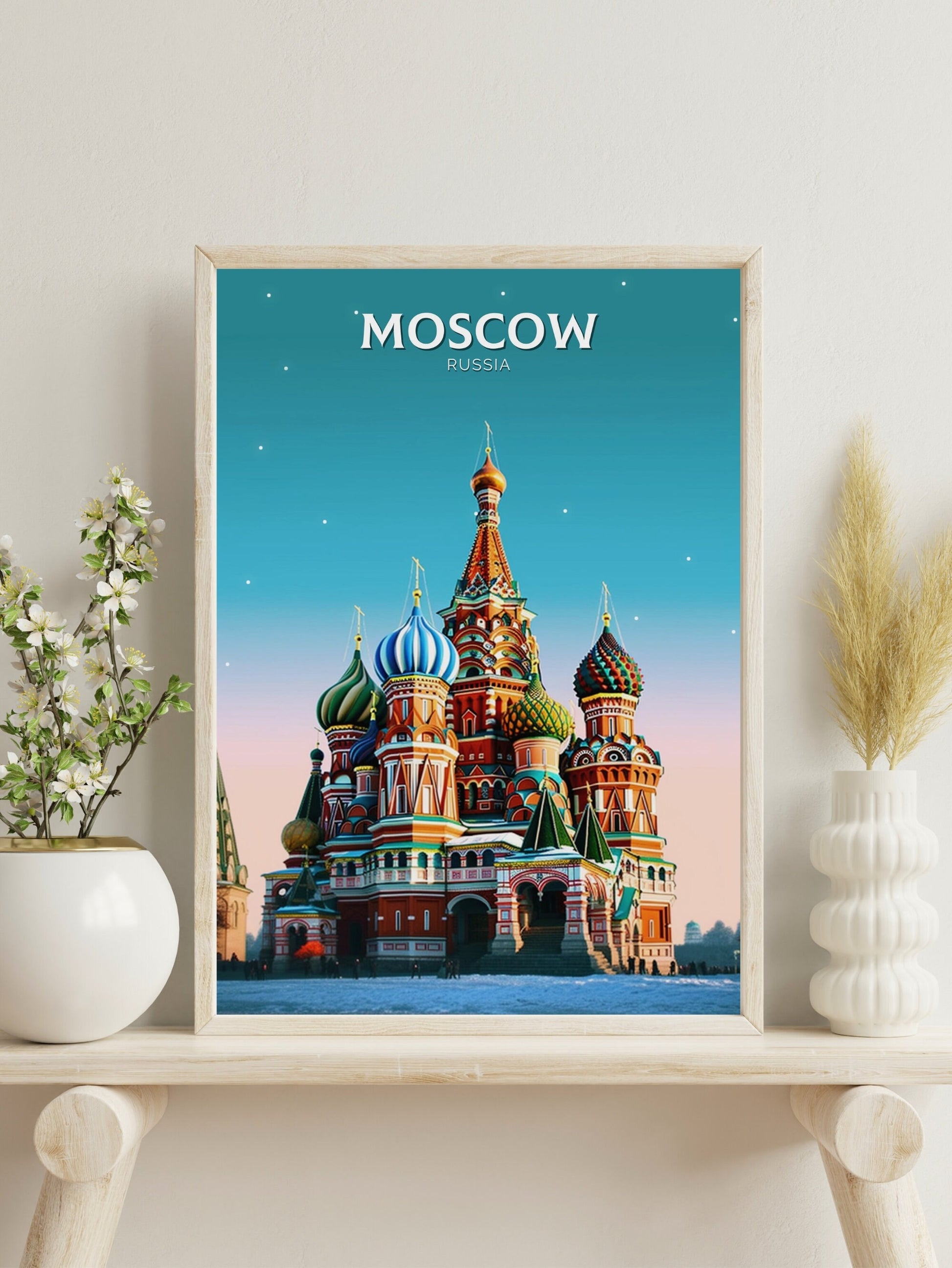 Célébrez la beauté emblématique de la capitale russe avec cette affiche de voyage de Moscou , une œuvre d'art russe éclatante mettant en scène la majestueuse cathédrale Saint-Basile, le Kremlin et le paysage urbain dynamique. Cette affiche capture la riche histoire, les merveilles architecturales et le dynamisme culturel de Moscou avec un détail saisissant.