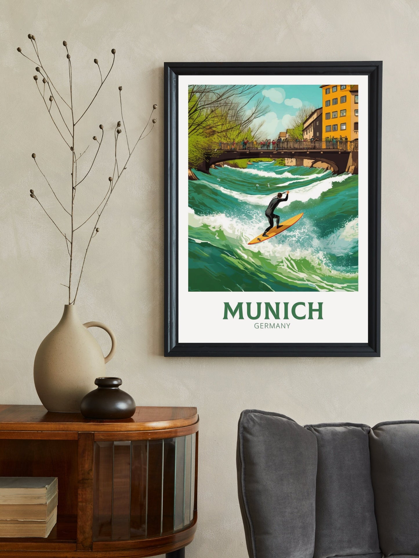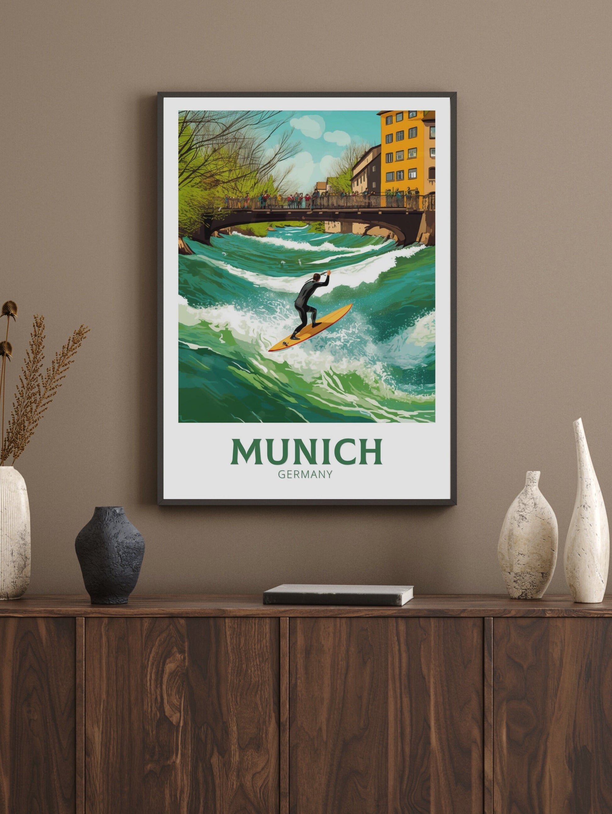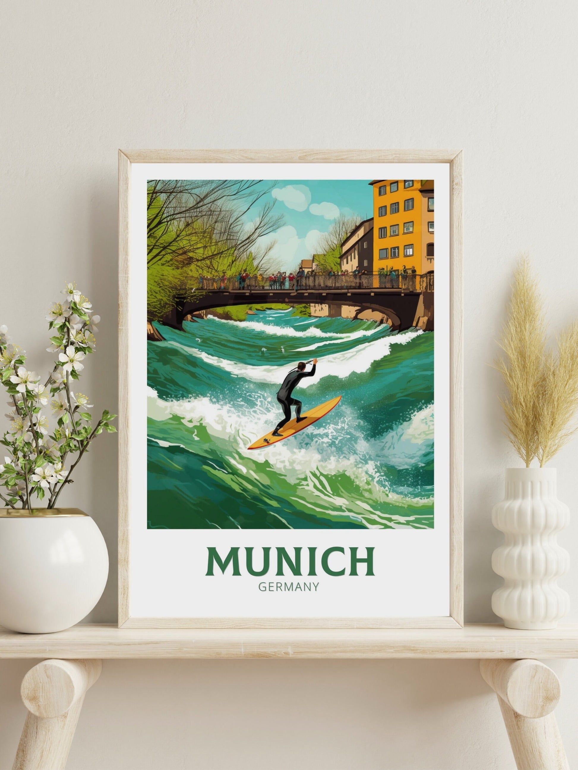 Célébrez la culture vibrante et la riche histoire de la Bavière avec cette affiche de voyage de Munich , une superbe œuvre d'art allemande mettant en valeur les monuments emblématiques de Munich, tels que la Frauenkirche et la Marienplatz. Cette affiche capture parfaitement le charme et l'énergie de la troisième plus grande ville d'Allemagne.