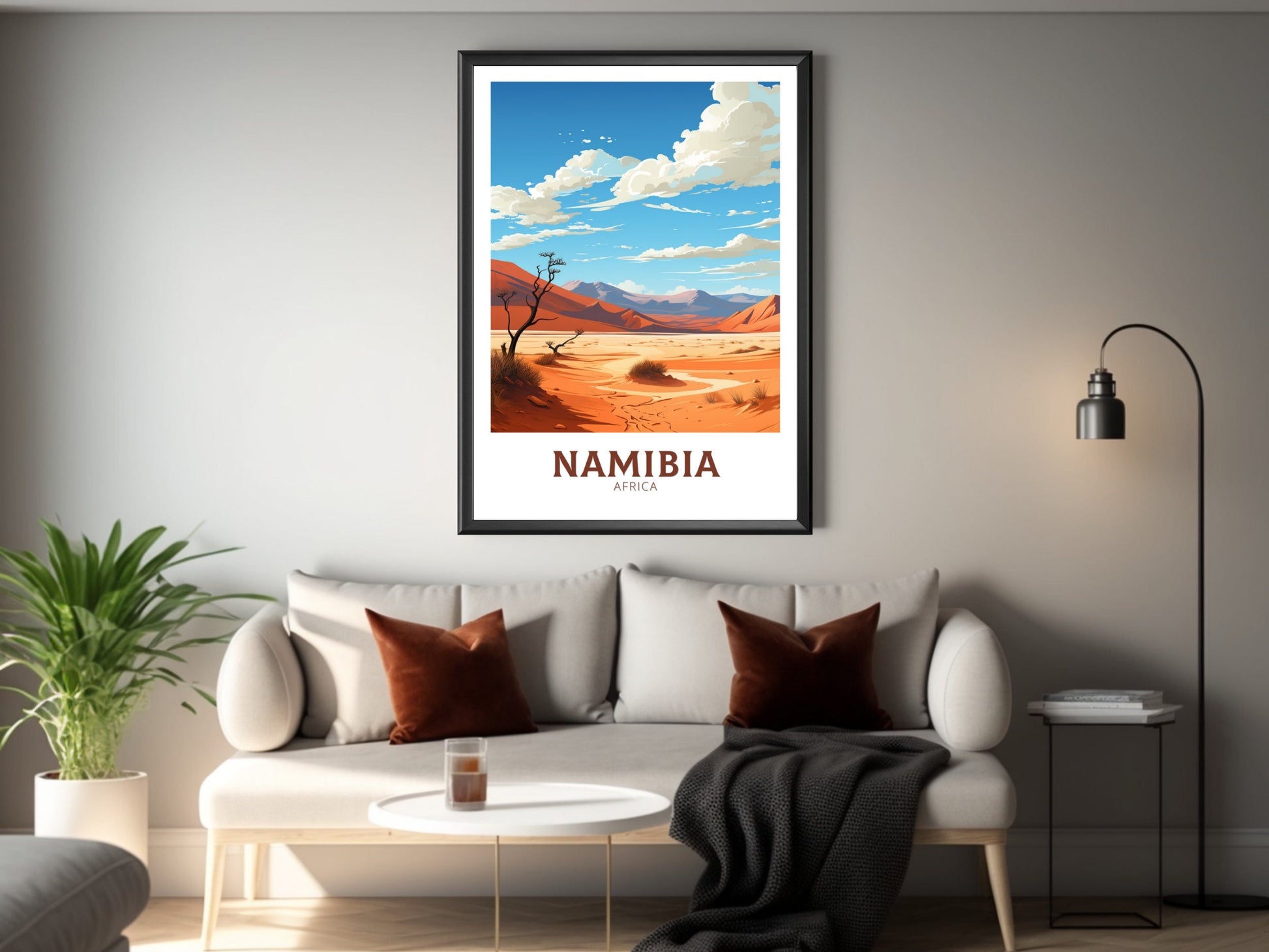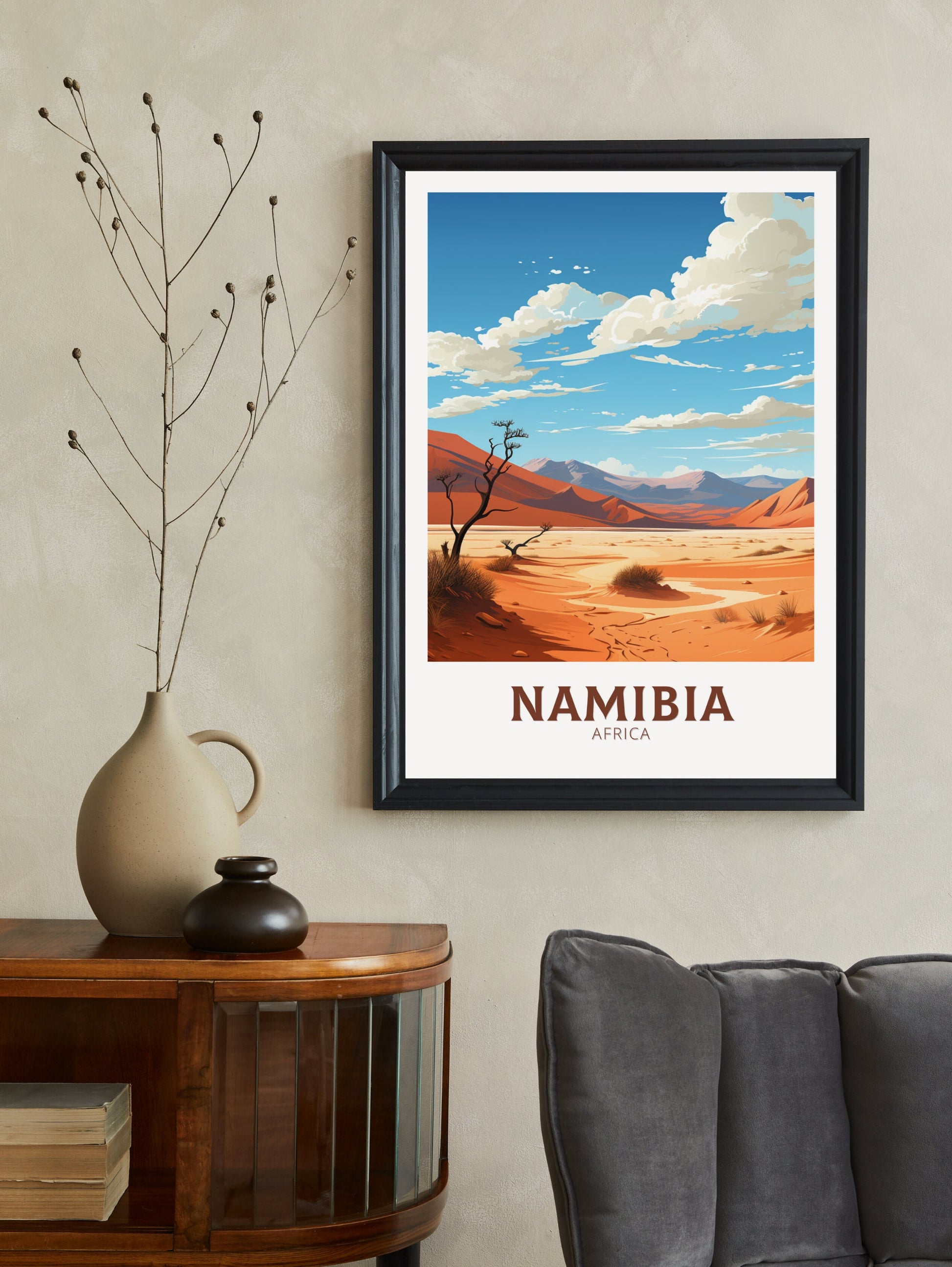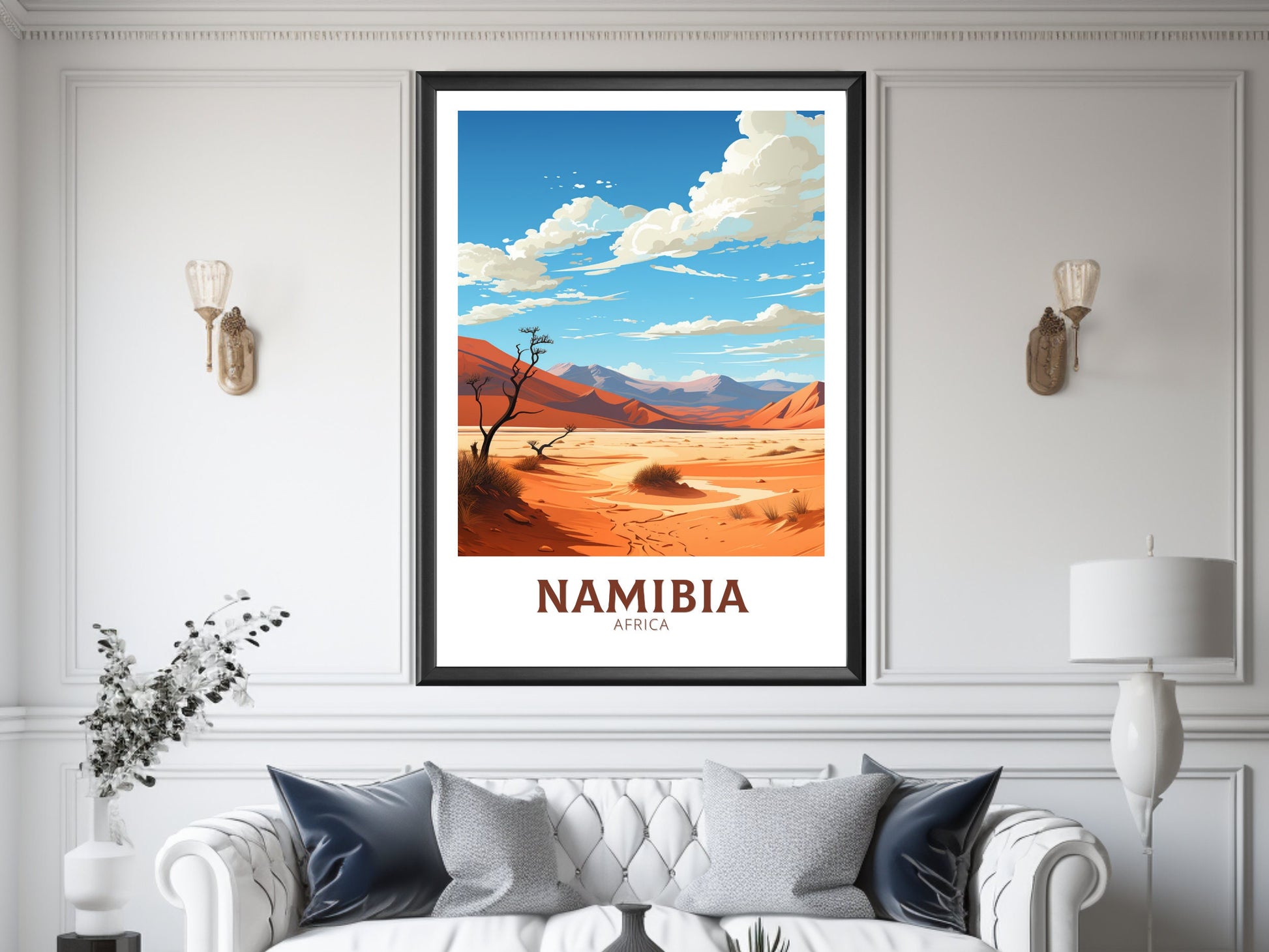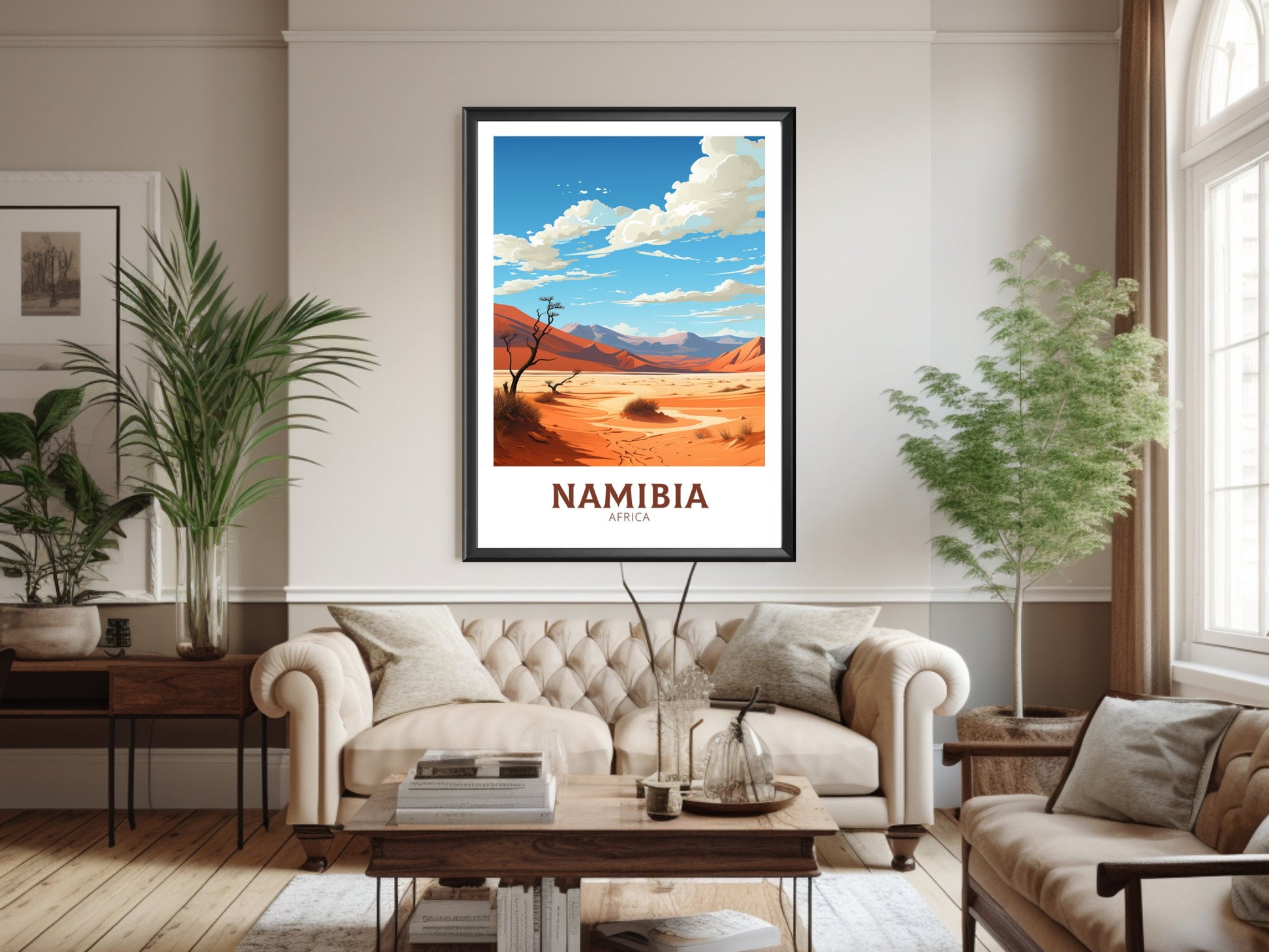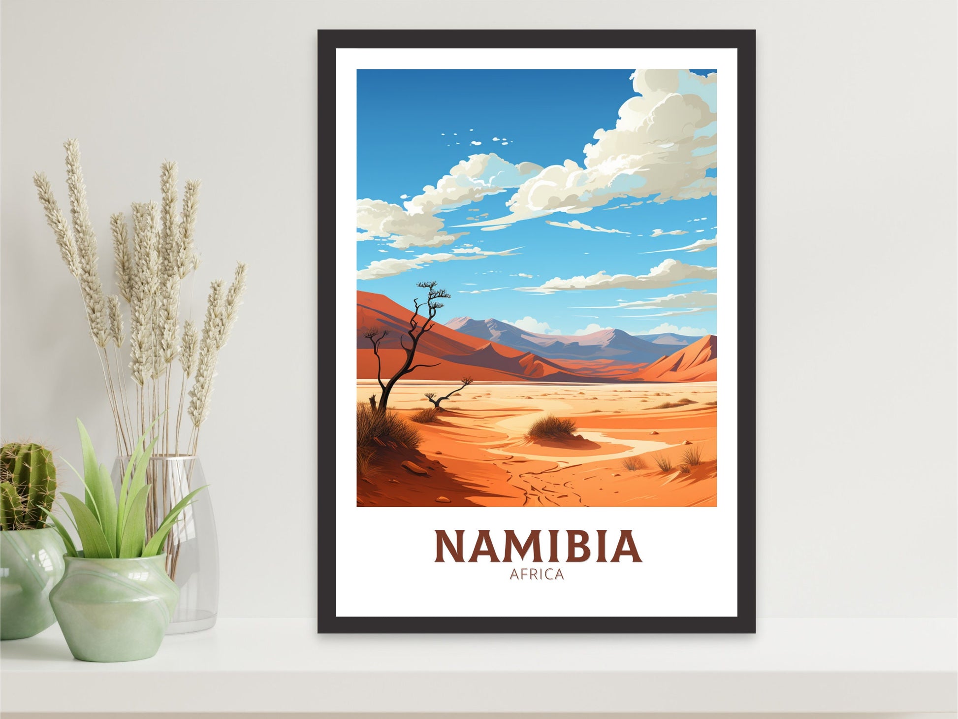 Cette œuvre mêle des oranges chaleureux et des blancs éclatants à l'essence sauvage de la Namibie, évoquant le charme d'un voyage vintage avec une touche de modernité. Imprimée sur un papier de qualité supérieure, elle offre un éclat durable et un fini lisse, ce qui en fait un cadeau idéal pour les aventuriers ou les collectionneurs d'art. Cette affiche de la Namibie apporte une touche de nostalgie du désert à tous vos murs.