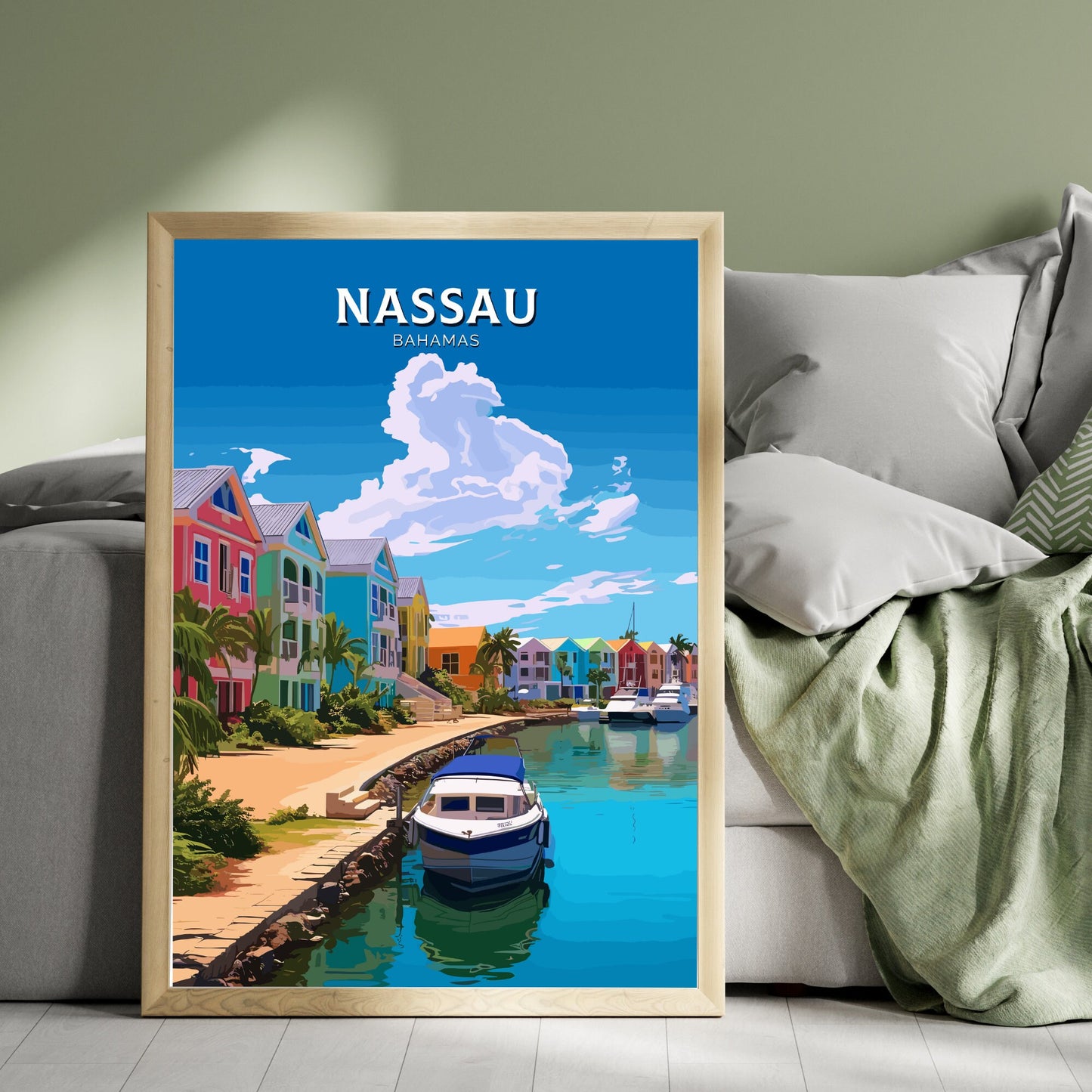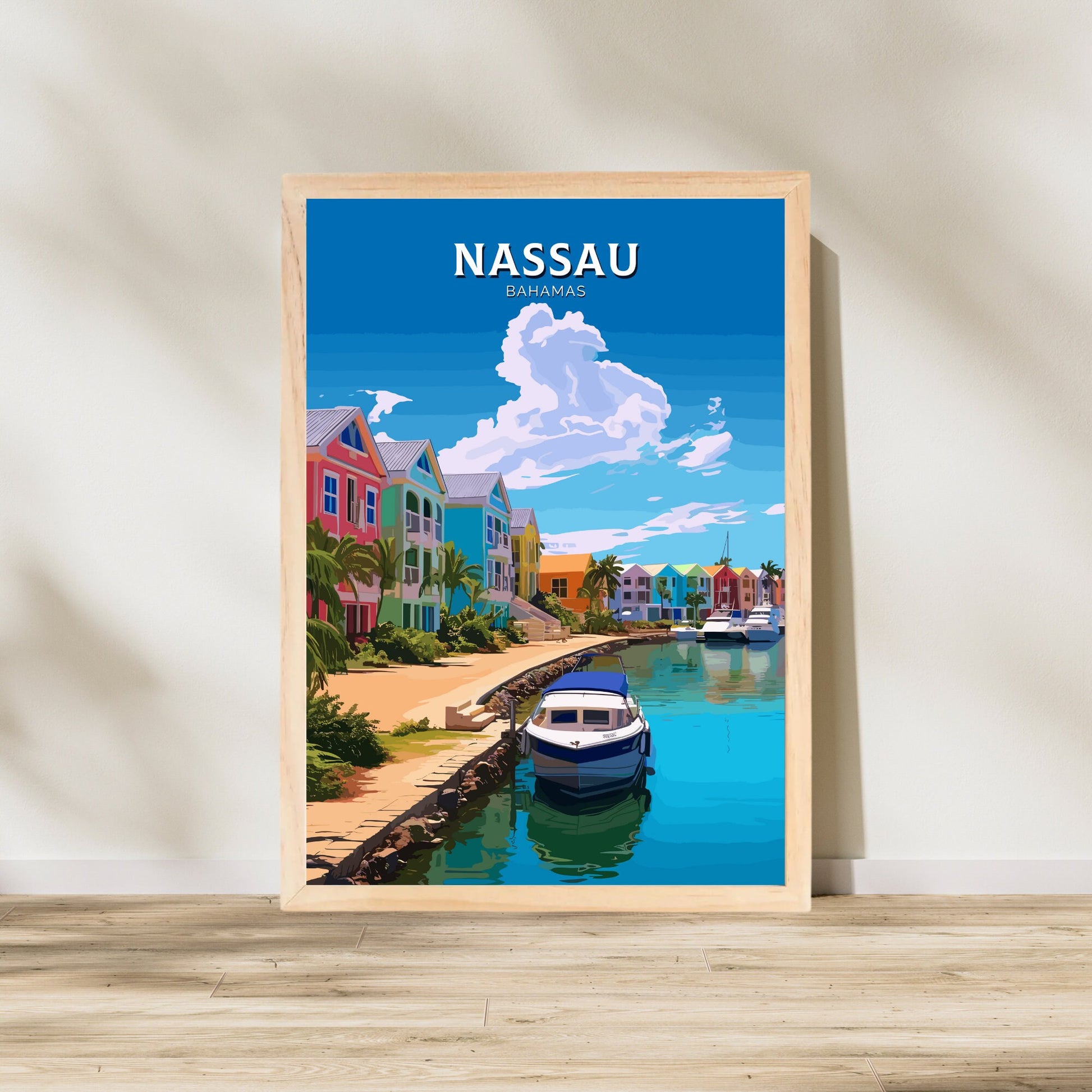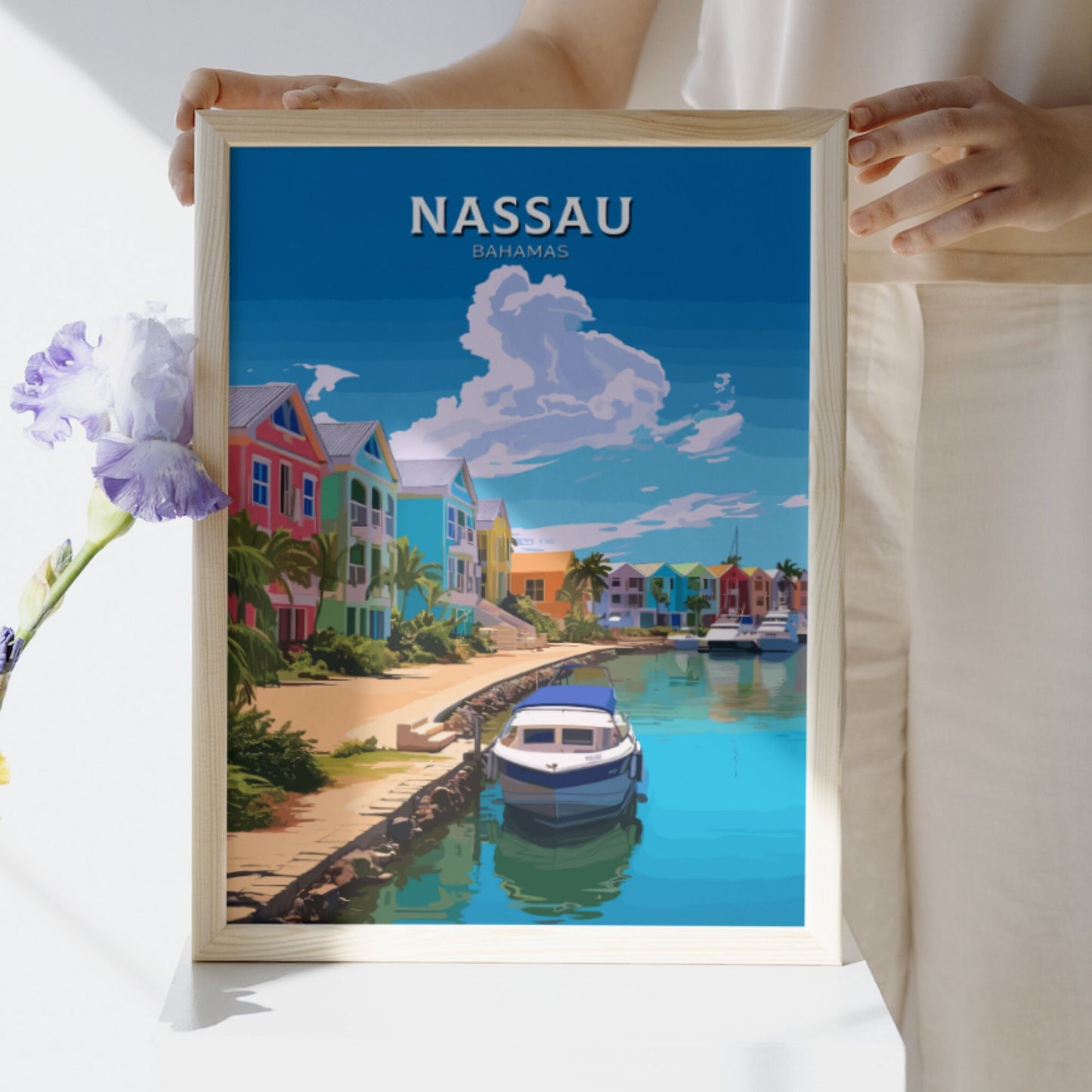 Disponible en téléchargement numérique et en tirage physique premium , cette affiche de voyage de Nassau est disponible dans une large gamme de formats, des formats standard de la série A aux grands formats 76 x 102 cm. Imprimée sur un papier de haute qualité aux couleurs vives et aux détails précis, elle constitue une décoration murale saisissante ou un cadeau attentionné pour tous ceux qui sont inspirés par la beauté des Bahamas.