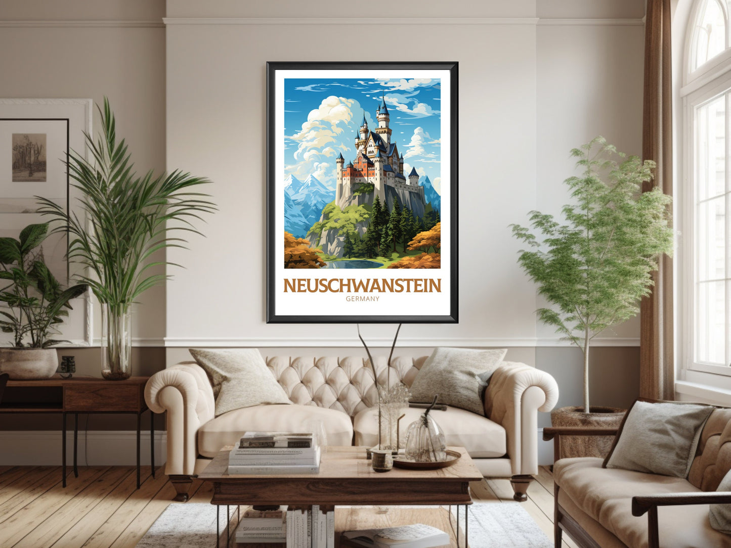Plongez dans un conte de fées avec cette affiche de voyage de Neuschwanstein , une superbe œuvre d'art allemande représentant l'emblématique château de Neuschwanstein, niché dans les Alpes bavaroises. Inspiré du Château de la Belle au bois dormant de Disney, ce poster met en valeur la beauté majestueuse et l'architecture romantique qui font de Neuschwanstein l'un des monuments les plus appréciés d'Allemagne.