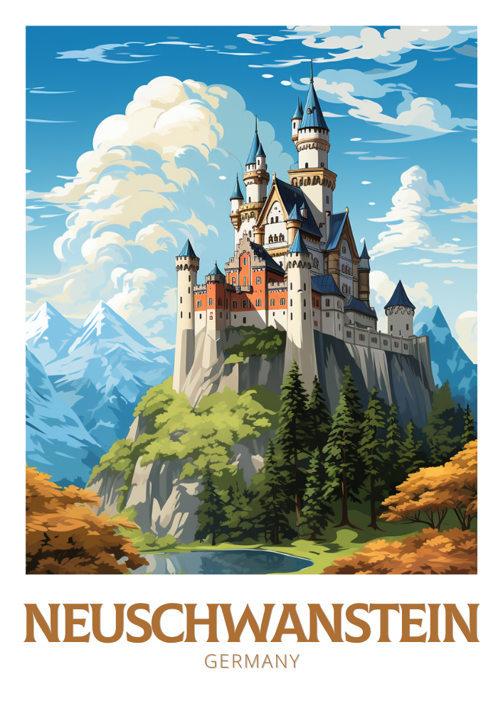 Imprimée sur du papier de qualité supérieure avec des encres éclatantes et résistantes à la décoloration, l' affiche de voyage de Neuschwanstein est idéale pour ajouter une touche de magie et d'héritage allemand à votre décoration intérieure ou professionnelle. Célébrez le charme enchanteur du château de Neuschwanstein avec cette magnifique affiche de voyage.