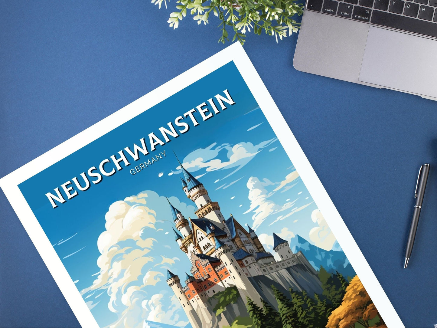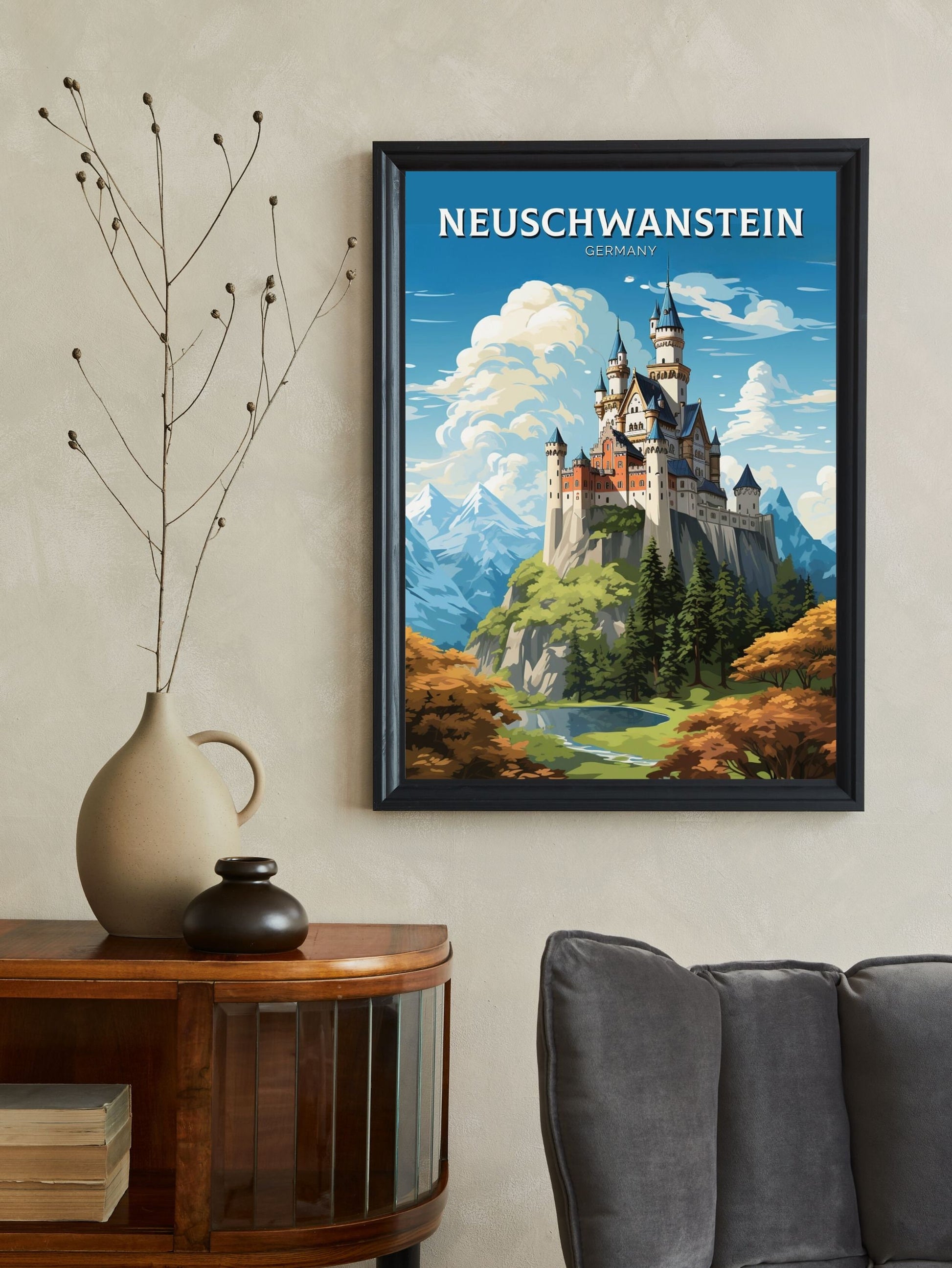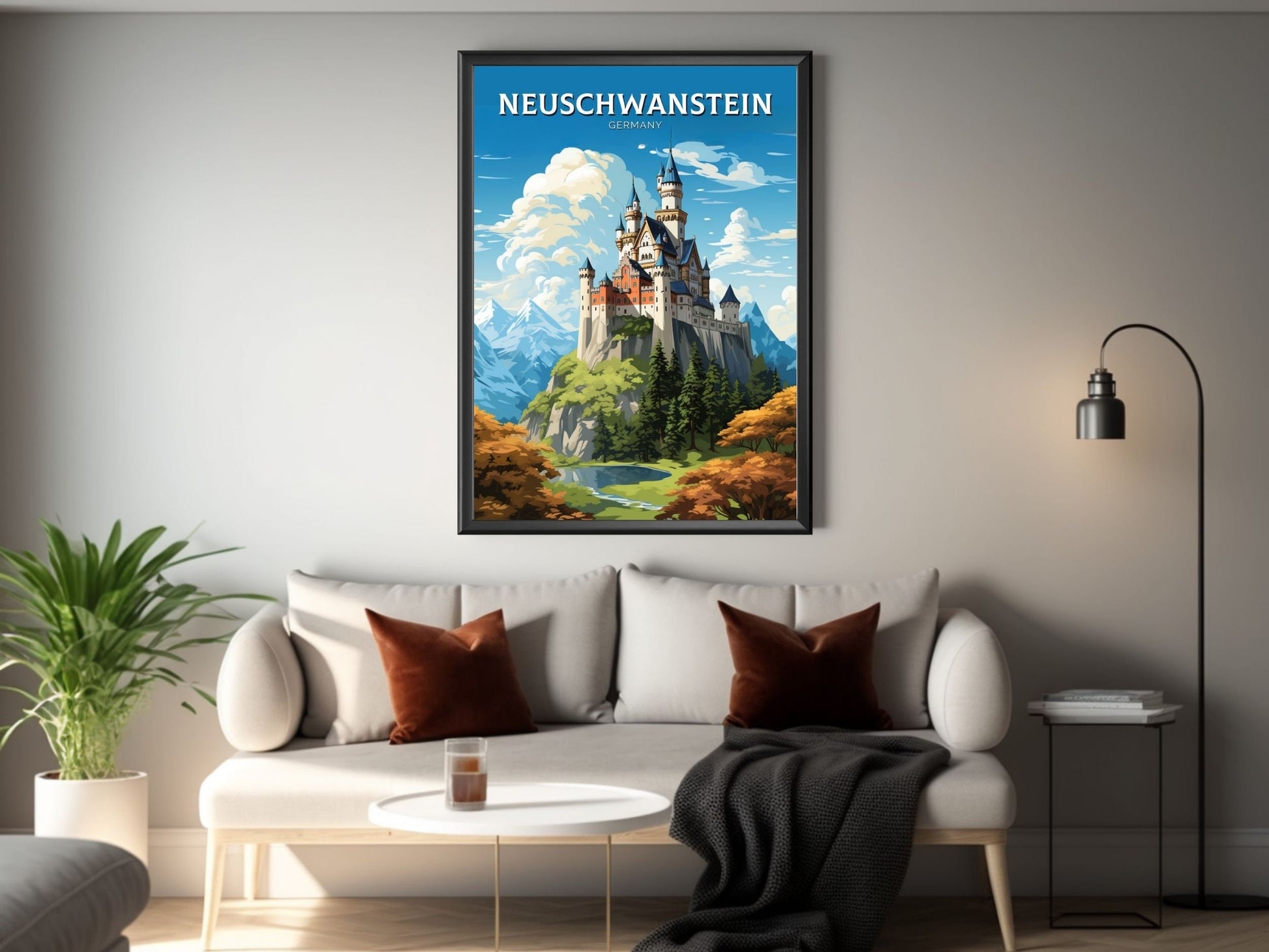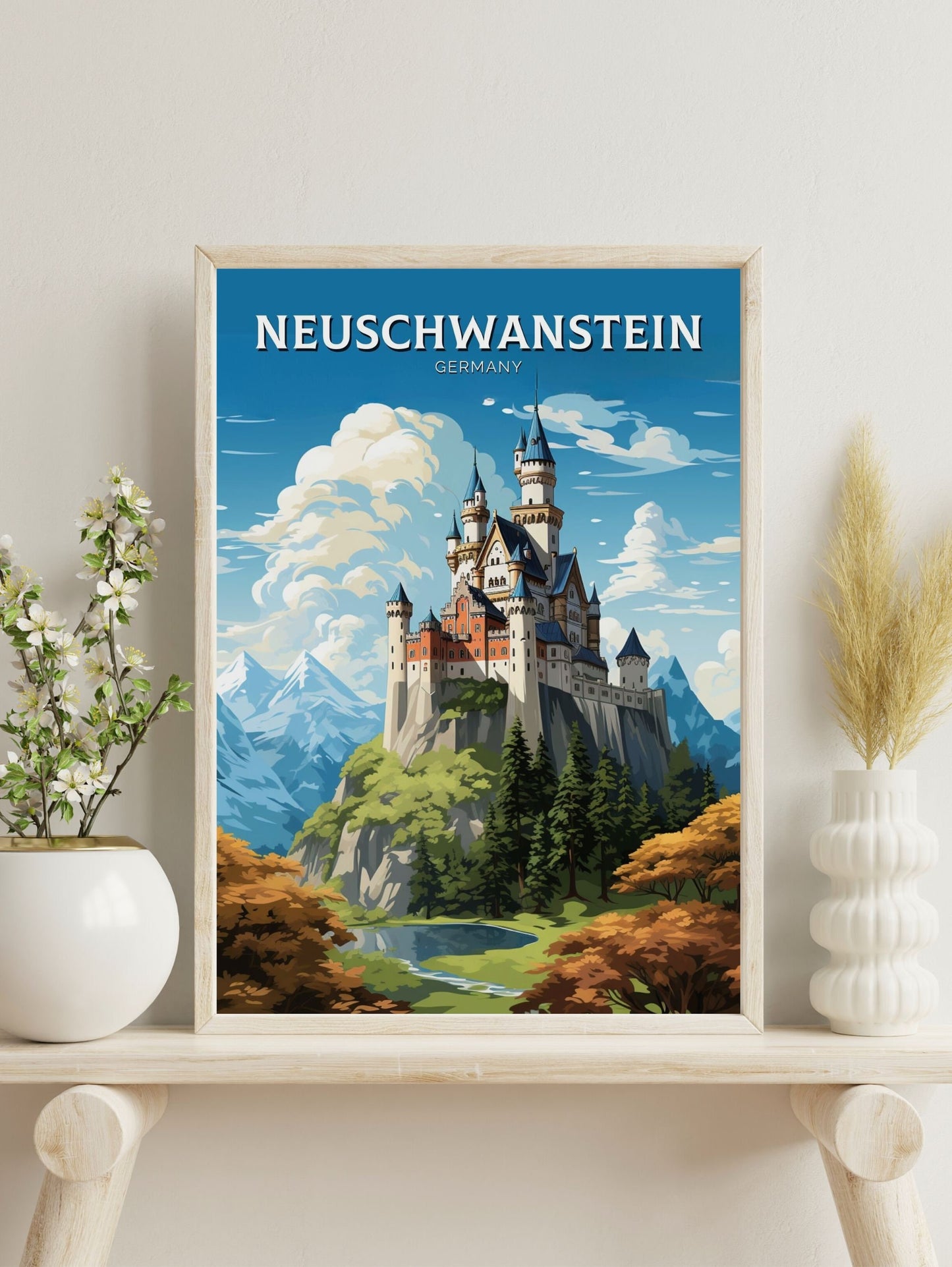Imprimée sur du papier de haute qualité avec des encres vibrantes et résistantes à la décoloration, l' affiche de voyage de Neuschwanstein est idéale pour tout espace en quête d'une touche de romantisme et d'héritage allemand. Célébrez le charme intemporel du château de Neuschwanstein avec cette captivante affiche de voyage.