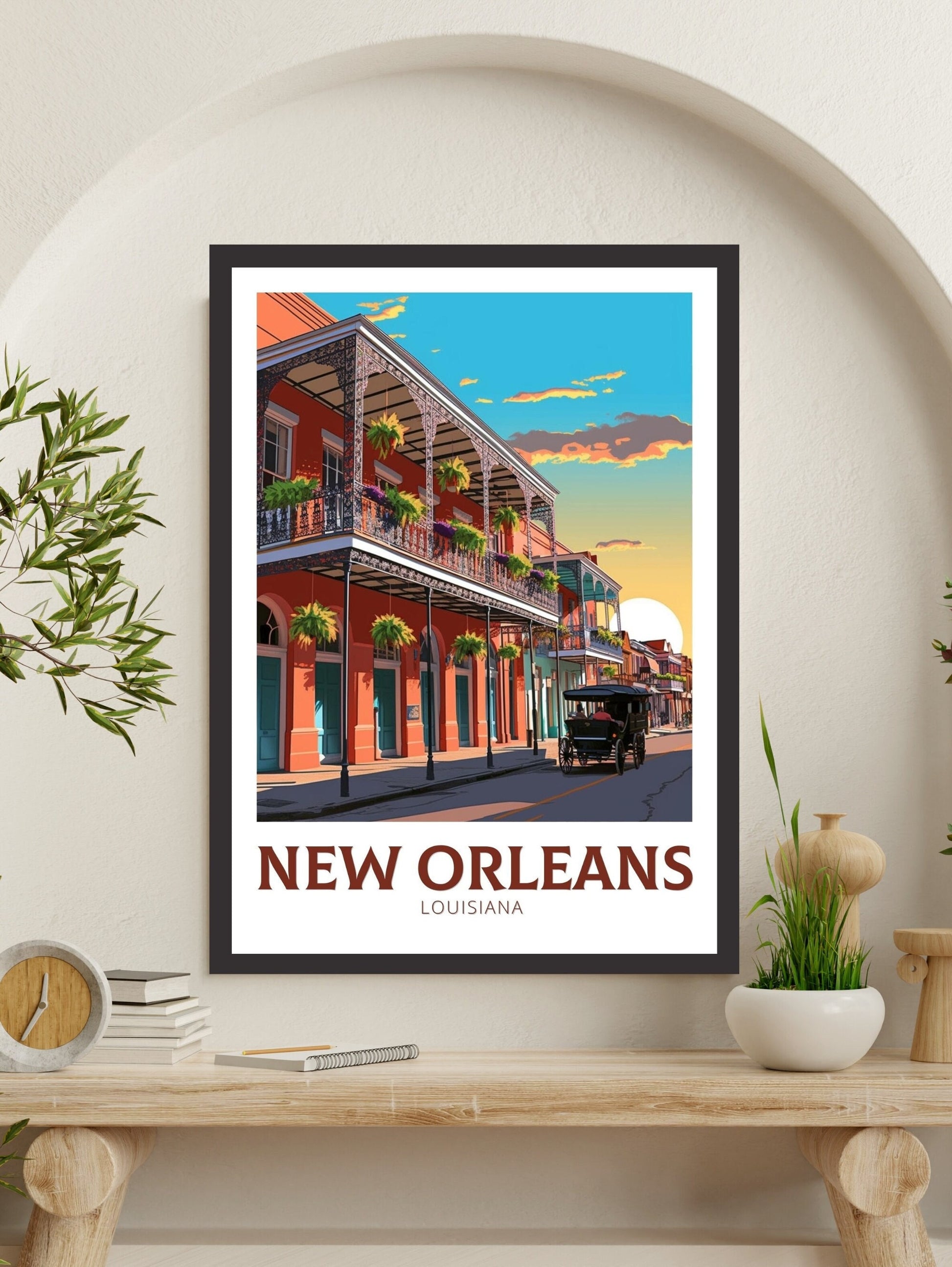 Célébrez l'esprit dynamique de la « Cité du Croissant » avec notre affiche de voyage de La Nouvelle-Orléans . Cette œuvre d'art louisianaise capture la culture vibrante de la ville, les rues colorées du Quartier français et le rythme du jazz qui y règne. C'est un choix idéal pour les mélomanes, les passionnés de voyages et tous ceux qui s'inspirent du charme unique de La Nouvelle-Orléans. Apportez une touche d'énergie et de style sudiste à votre maison, votre bureau ou votre mur de galerie.