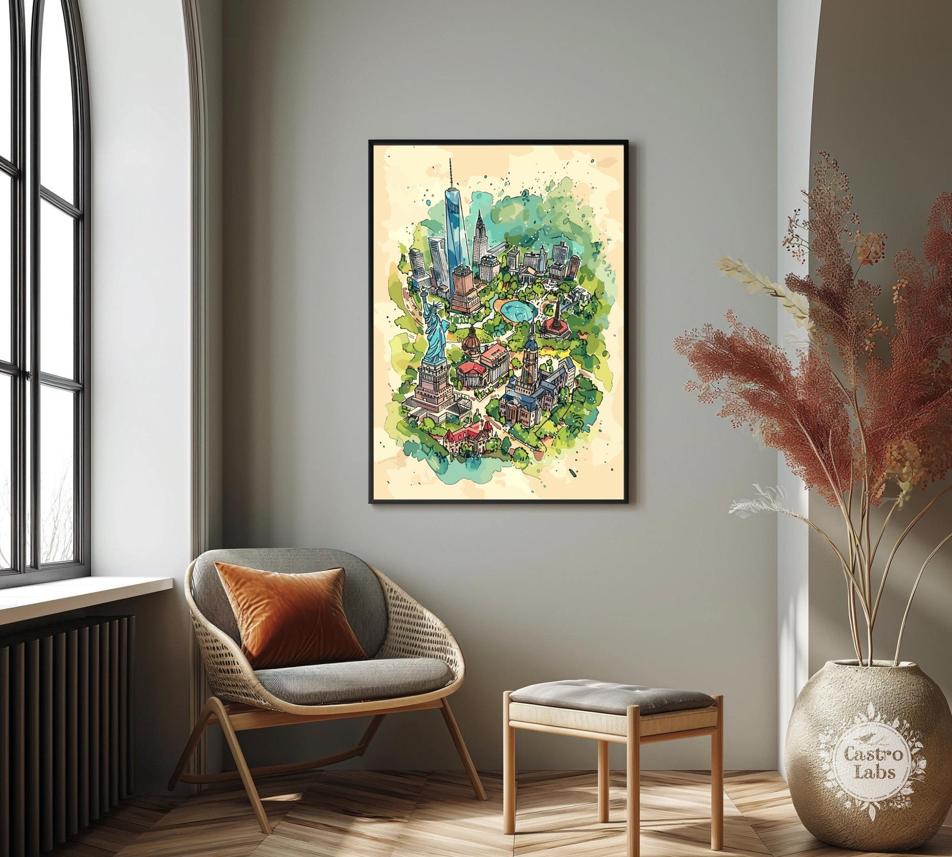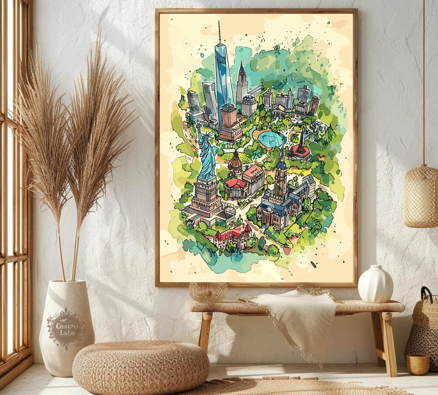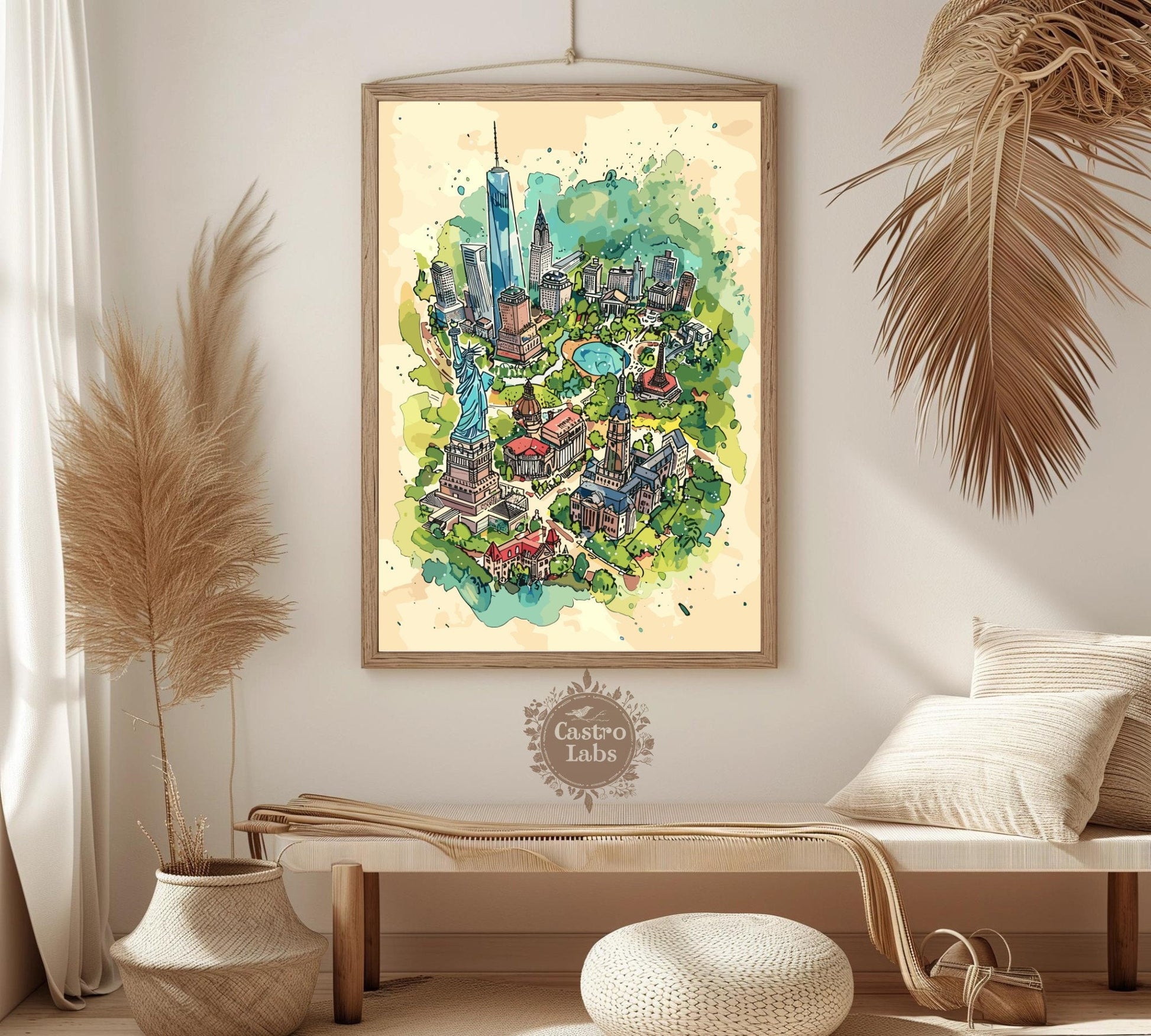Découvrez la Grosse Pomme avec style grâce à notre carte des attractions de New York . Cette affiche de voyage met en valeur les monuments les plus emblématiques de la ville, de la Statue de la Liberté à l'Empire State Building, en passant par Central Park et Times Square. C'est l'œuvre idéale pour les voyageurs, les amoureux de la ville et tous ceux qui s'inspirent de l'énergie new-yorkaise. Une façon originale de mettre en valeur le charme et l'effervescence de l'une des villes les plus célèbres au monde.
