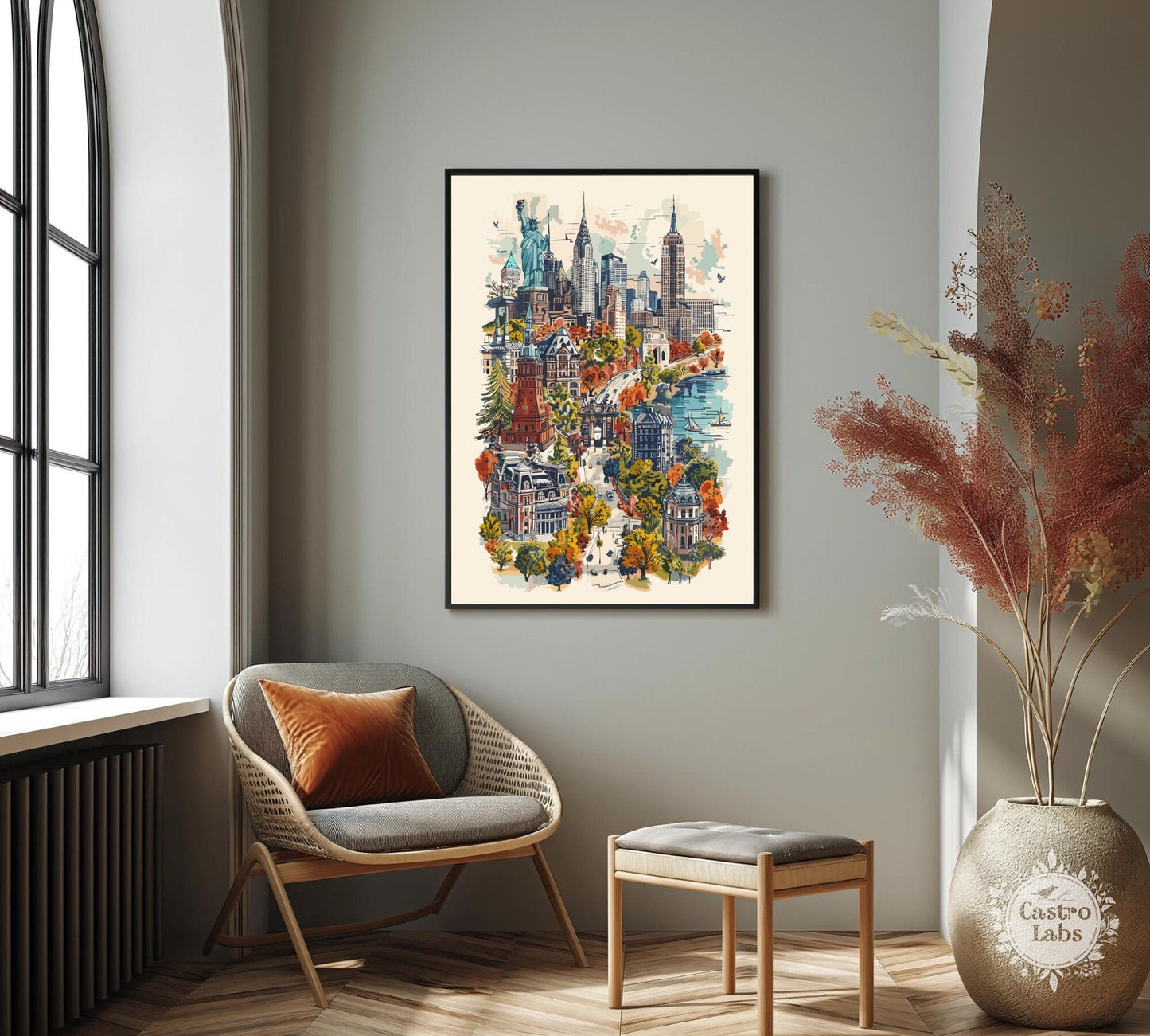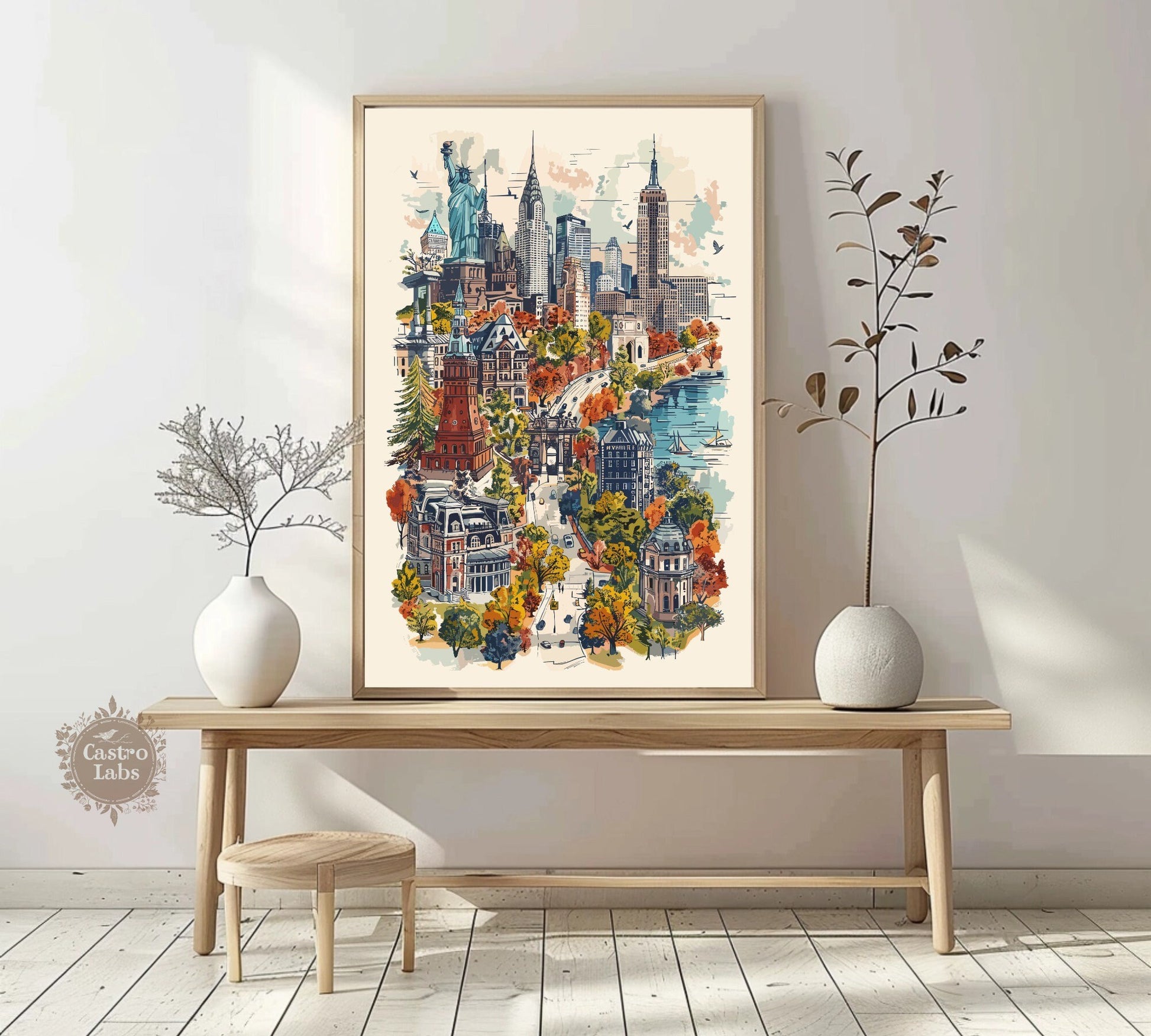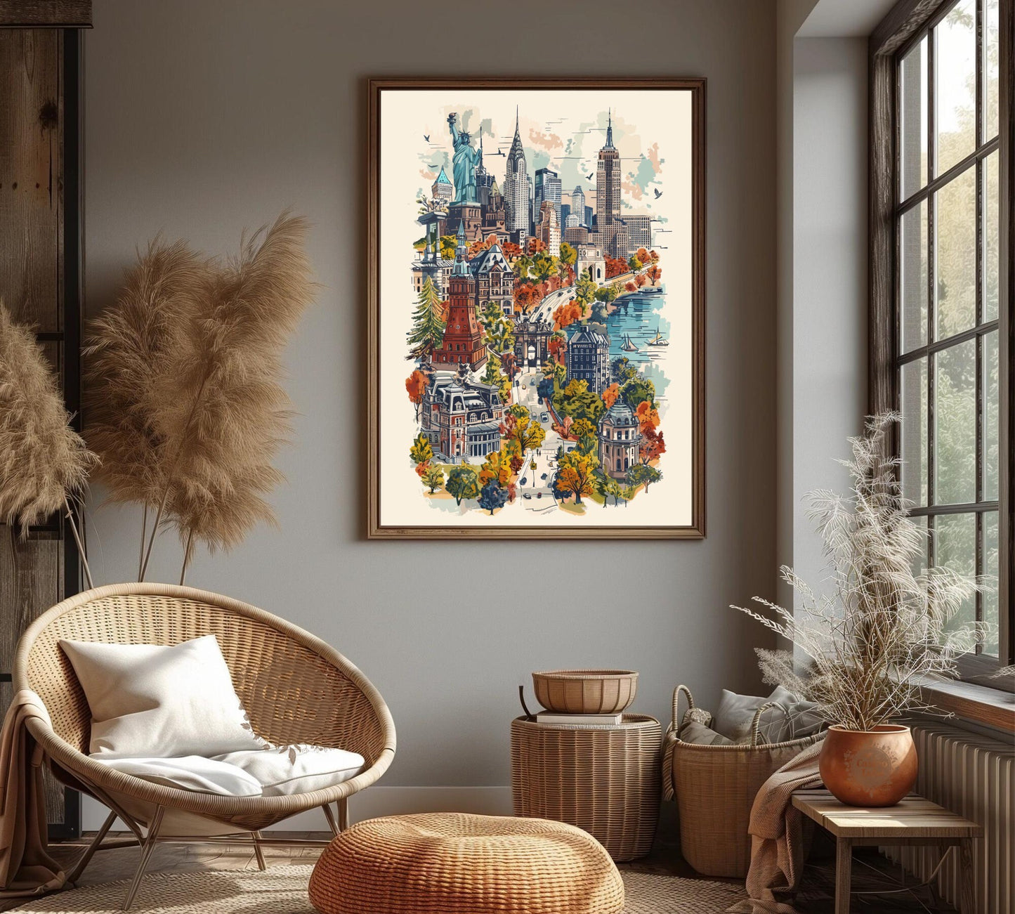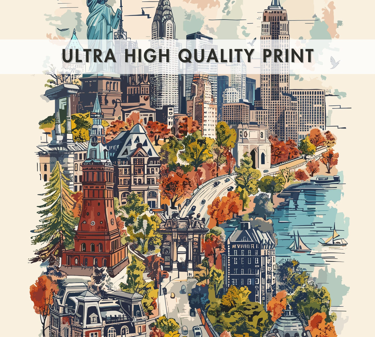 Disponible en téléchargement numérique et en tirage physique premium , cette affiche de la carte des attractions de New York est disponible en plusieurs formats, des formats de série A aux grands tirages 30 x 40 pouces. Avec ses détails nets et ses couleurs vives, elle constitue un ajout remarquable à votre collection d'art mural ou un cadeau attentionné pour les fans de la Grosse Pomme.