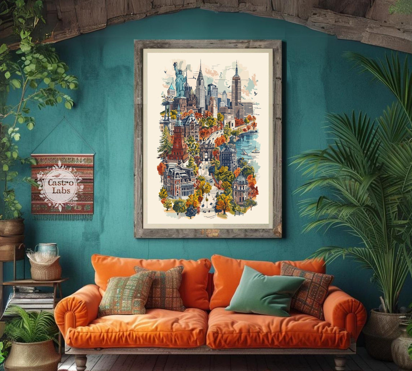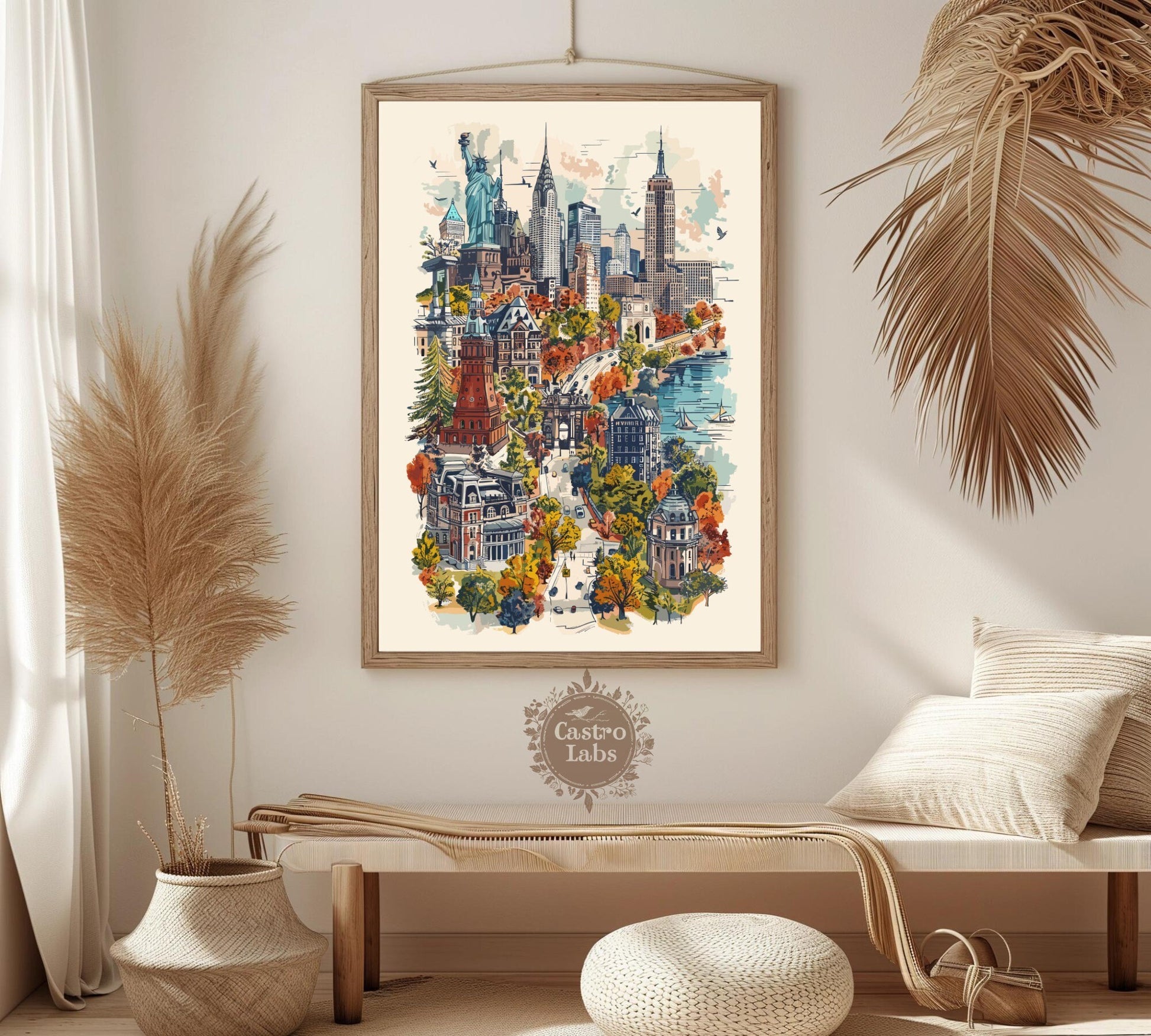 Explorez la ville qui ne dort jamais avec notre affiche touristique de New York . Ce poster met en valeur les monuments les plus emblématiques de la ville, comme la Statue de la Liberté, l'Empire State Building, Central Park et Times Square. Idéal pour les voyageurs, les amoureux de la ville et tous ceux qui souhaitent intégrer l'effervescence de New York à leur décoration intérieure.