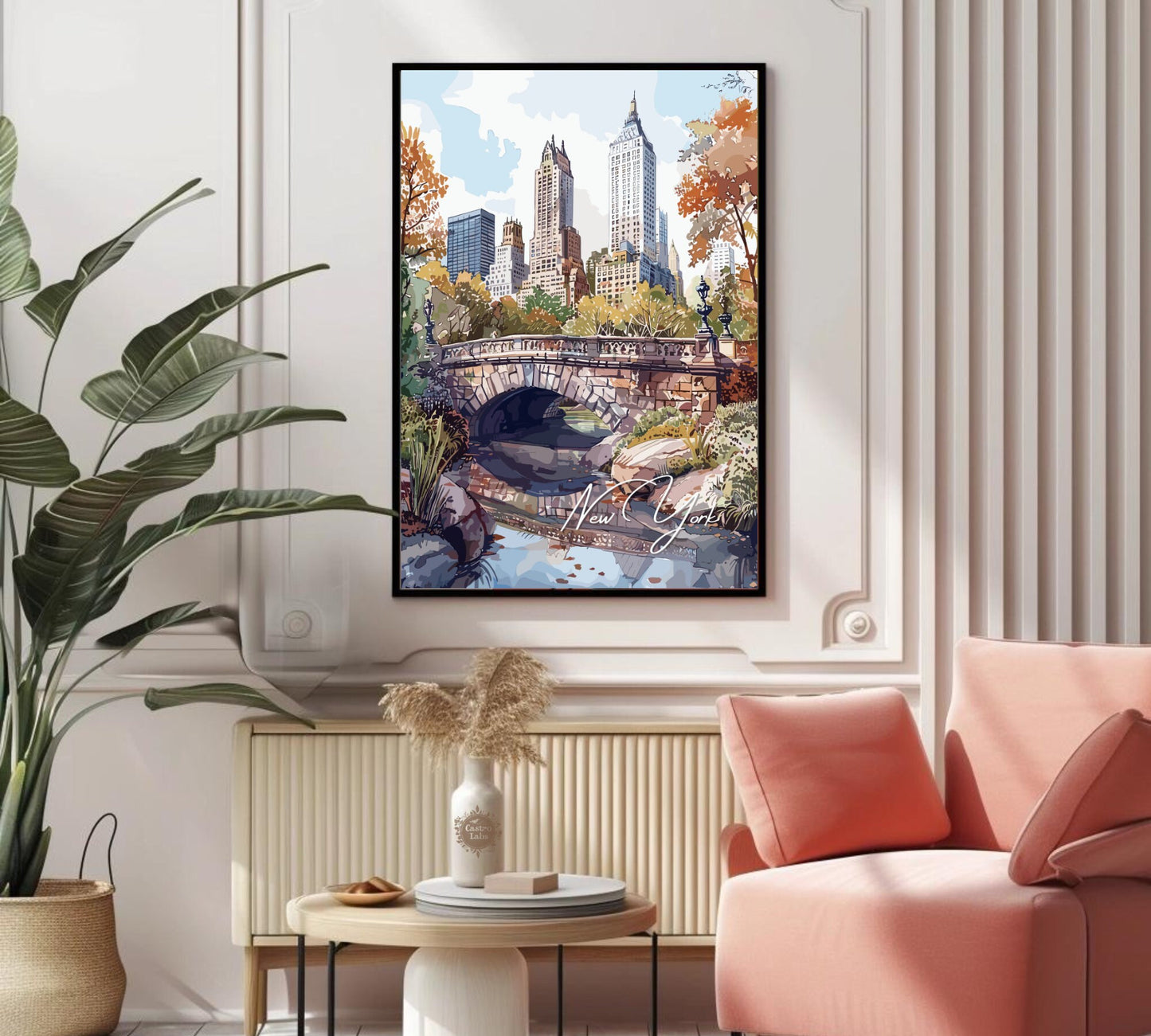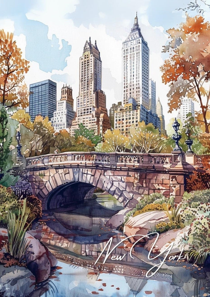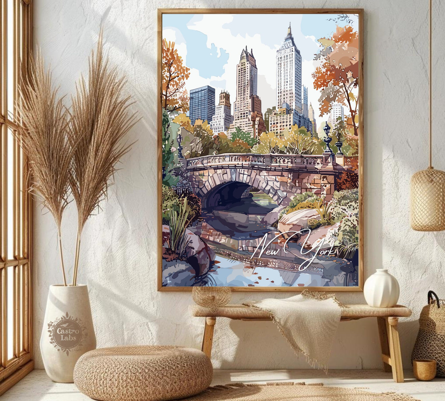 Capturez la beauté sereine du monument le plus emblématique de Manhattan avec notre affiche de voyage New York à l'aquarelle . Cette œuvre d'art de Central Park met en valeur les sentiers sinueux, la végétation luxuriante et les ponts historiques dans un style aquarelle délicat, apportant le charme de New York chez vous. Idéal pour les amateurs d'art, les voyageurs et les amoureux de l'élégance intemporelle de New York.