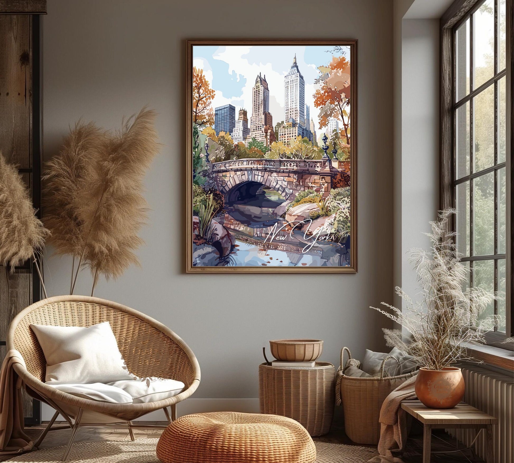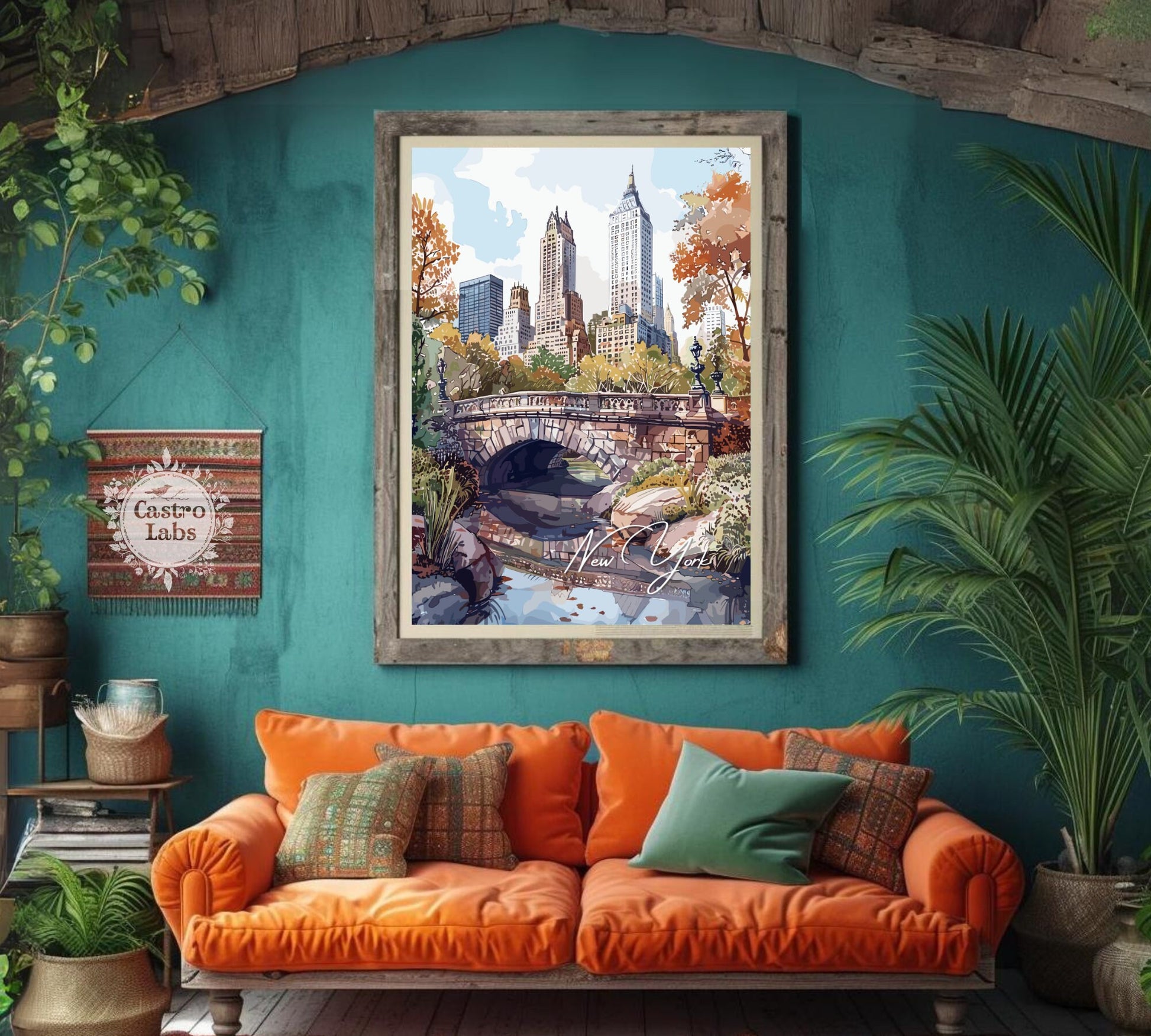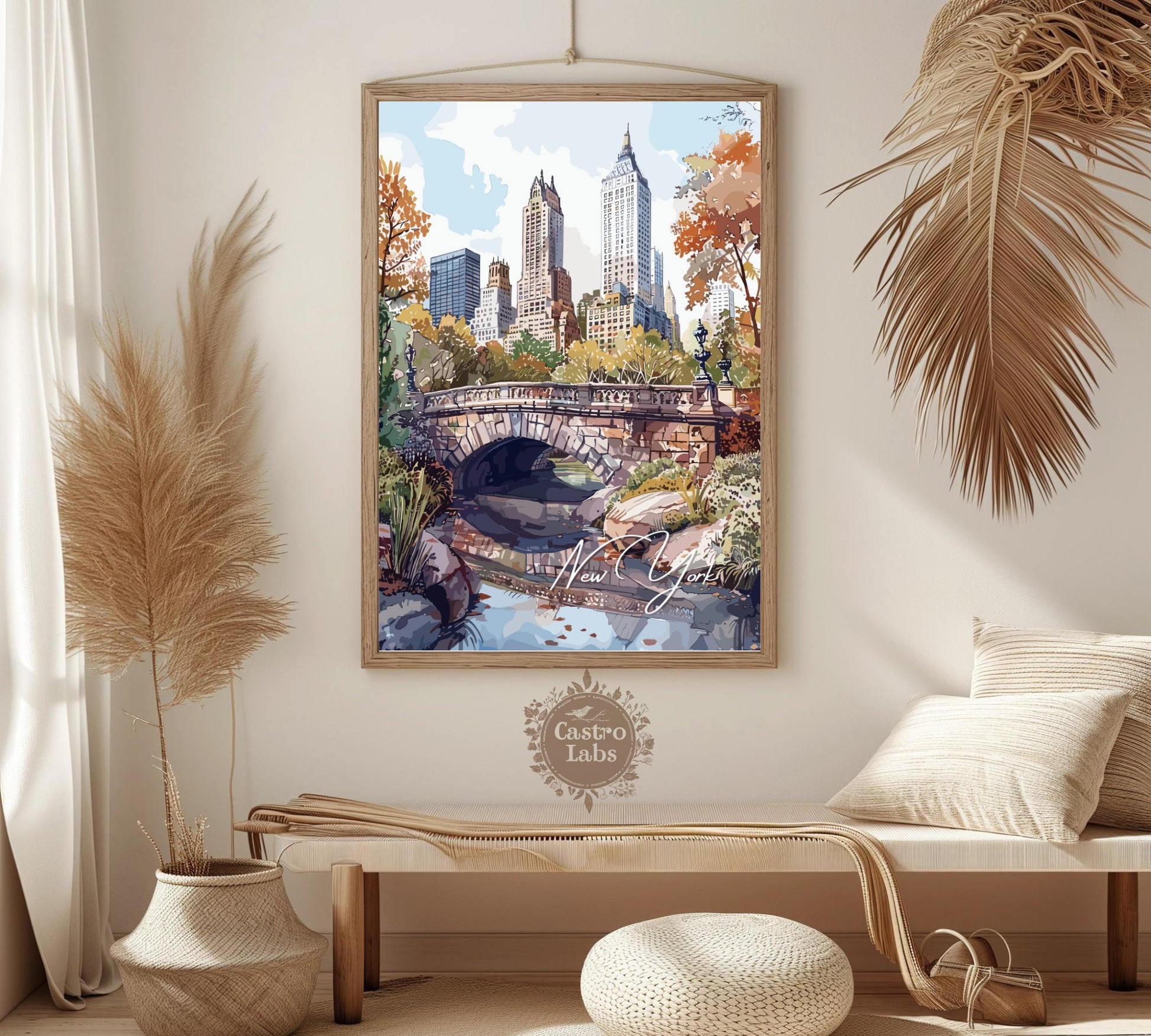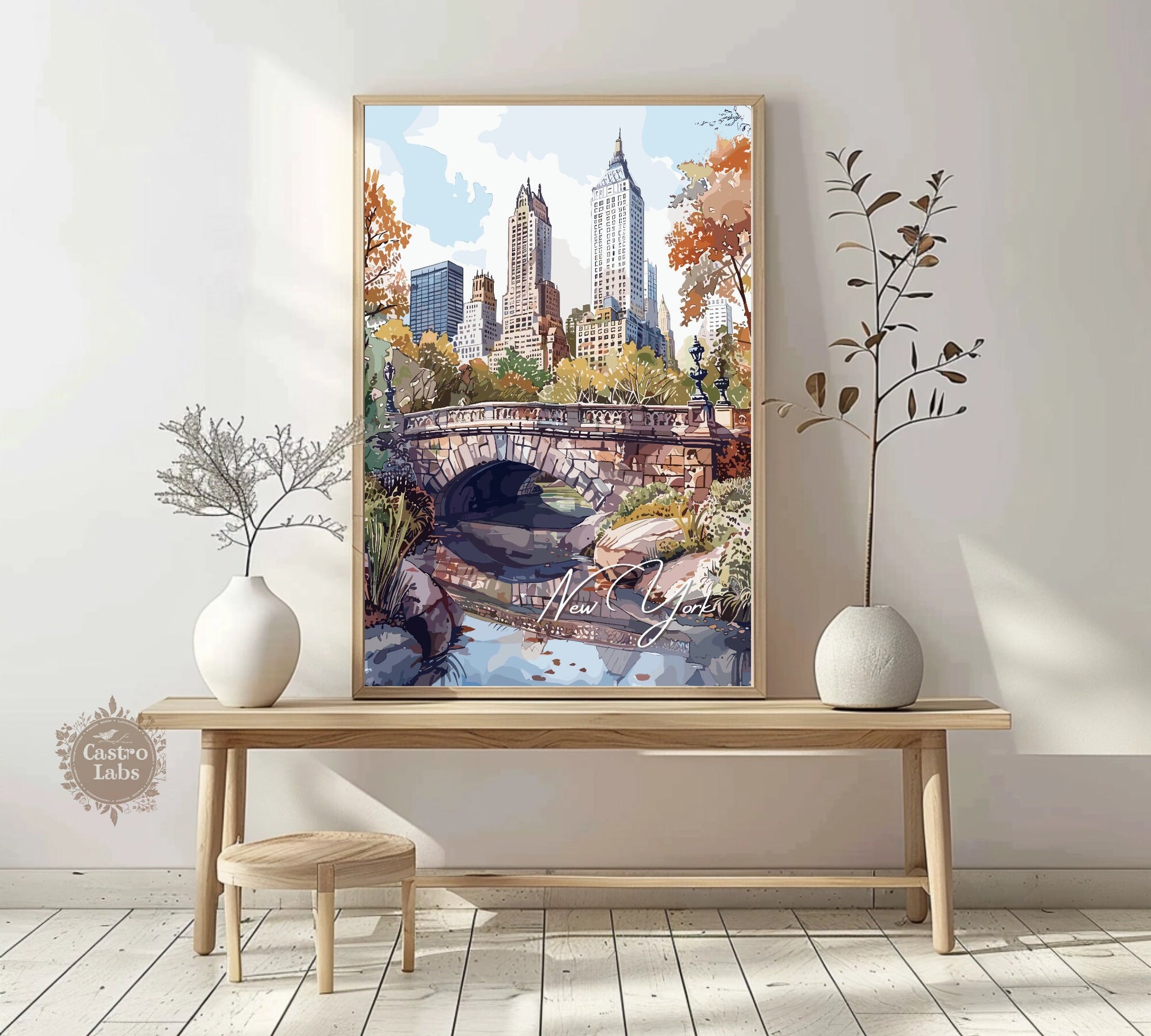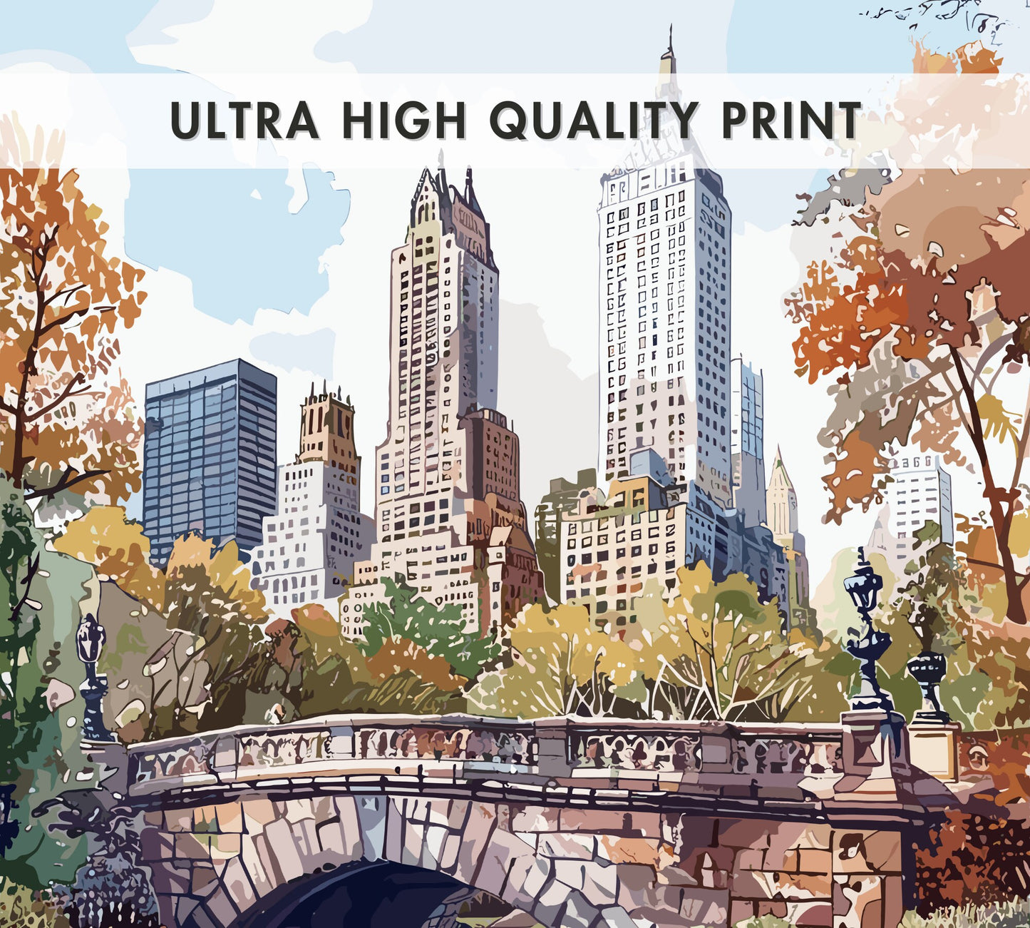 Disponible en téléchargement numérique et en tirage physique premium , cette affiche de voyage aquarelle de New York est disponible en plusieurs formats, des formats standard de la série A aux grands formats 76 x 102 cm. Ses tons vibrants et doux en font un ajout idéal aux espaces de vie, aux bureaux ou aux murs de galeries, et un cadeau attentionné pour les admirateurs de Central Park et des paysages urbains.