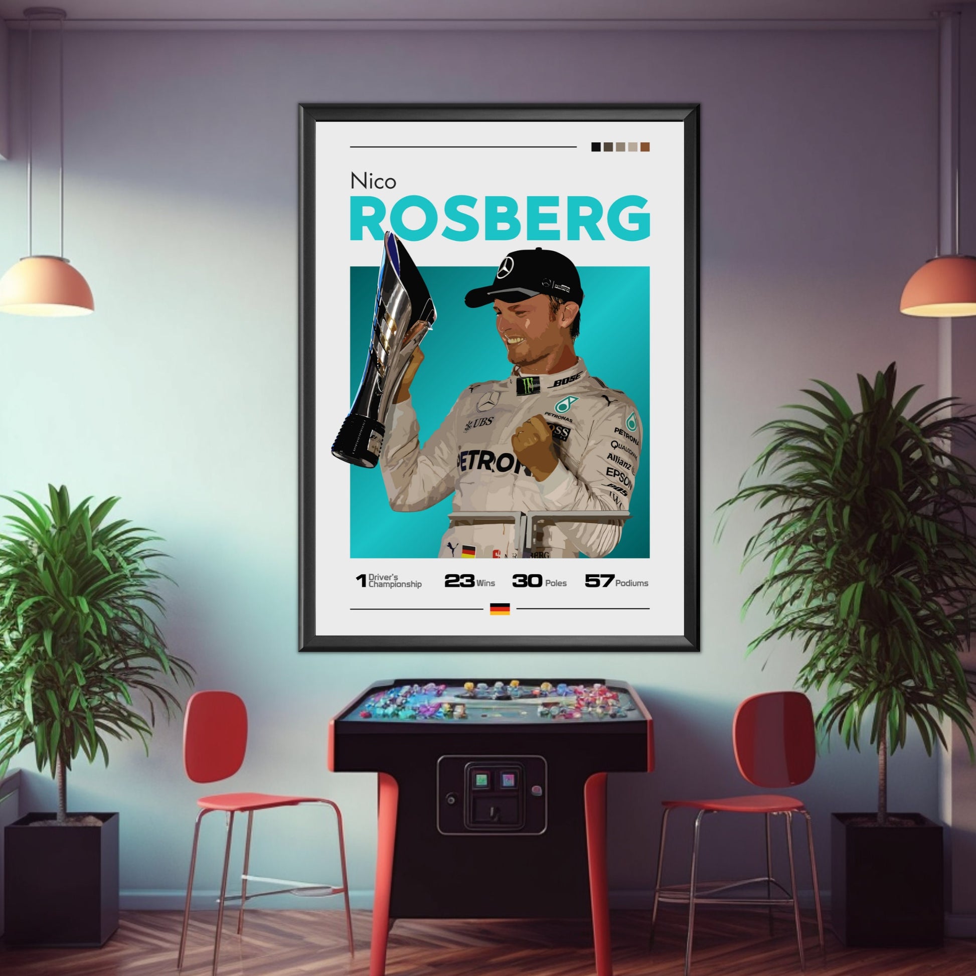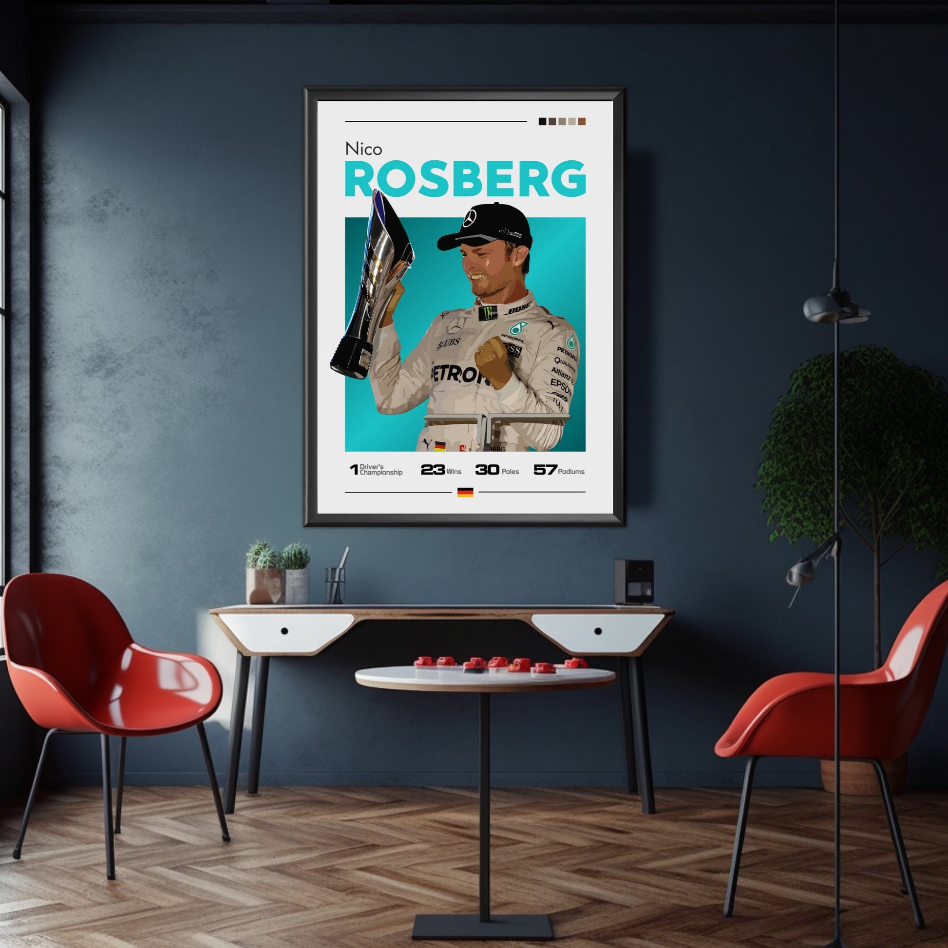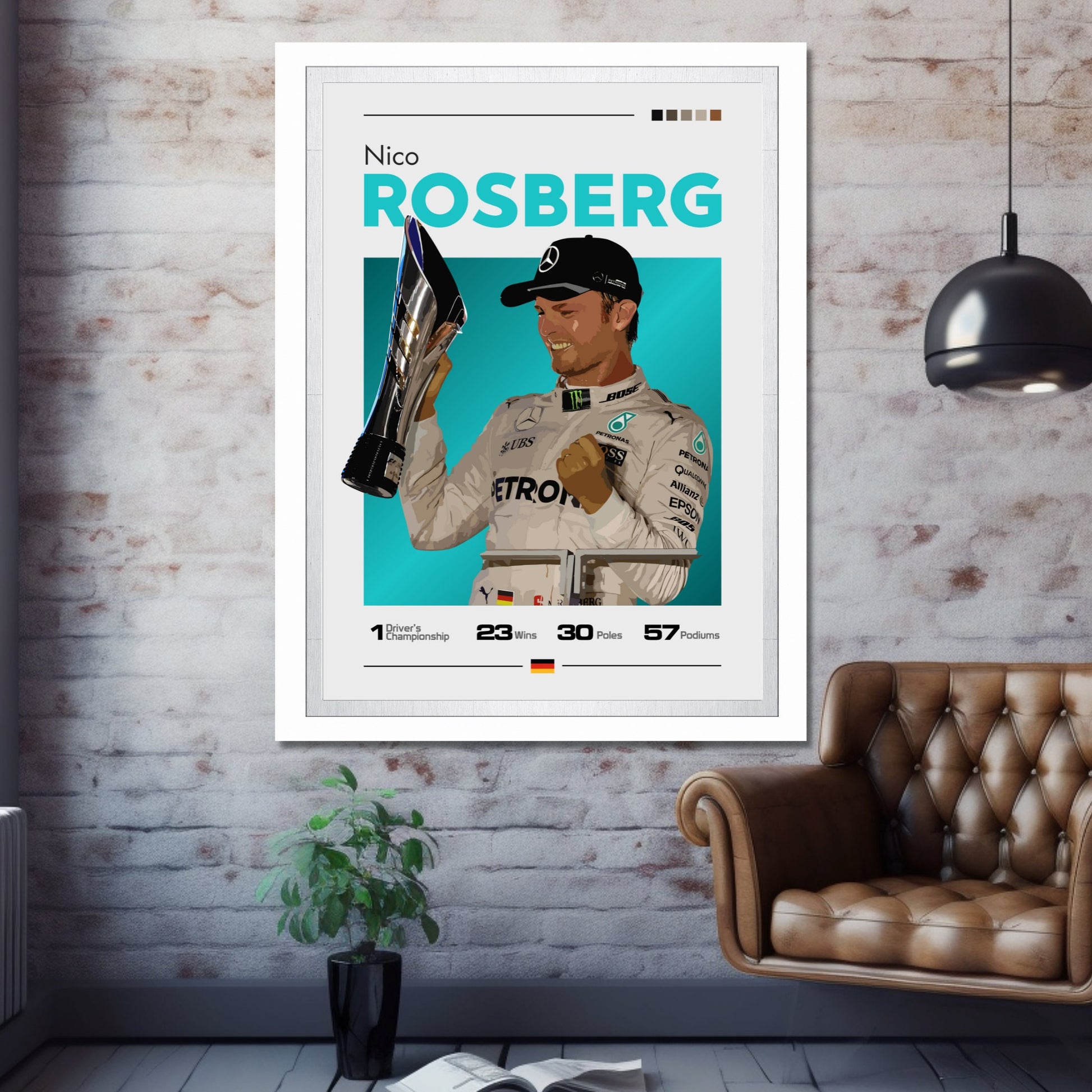 Célébrez la carrière remarquable du champion de Formule 1 Nico Rosberg avec l' affiche Nico Rosberg Mercedes F1 – Champion du monde 2016. Idéale pour les fans de F1, les passionnés de Mercedes et les collectionneurs de sport automobile, cette affiche de haute qualité immortalise Rosberg en action au volant de sa Mercedes F1 championne en 2016. Insufflez la vitesse, la précision et l'excitation de la Formule 1 moderne chez vous, au bureau ou dans un espace dédié à la course automobile grâce à cette œuvre murale saisissante.
