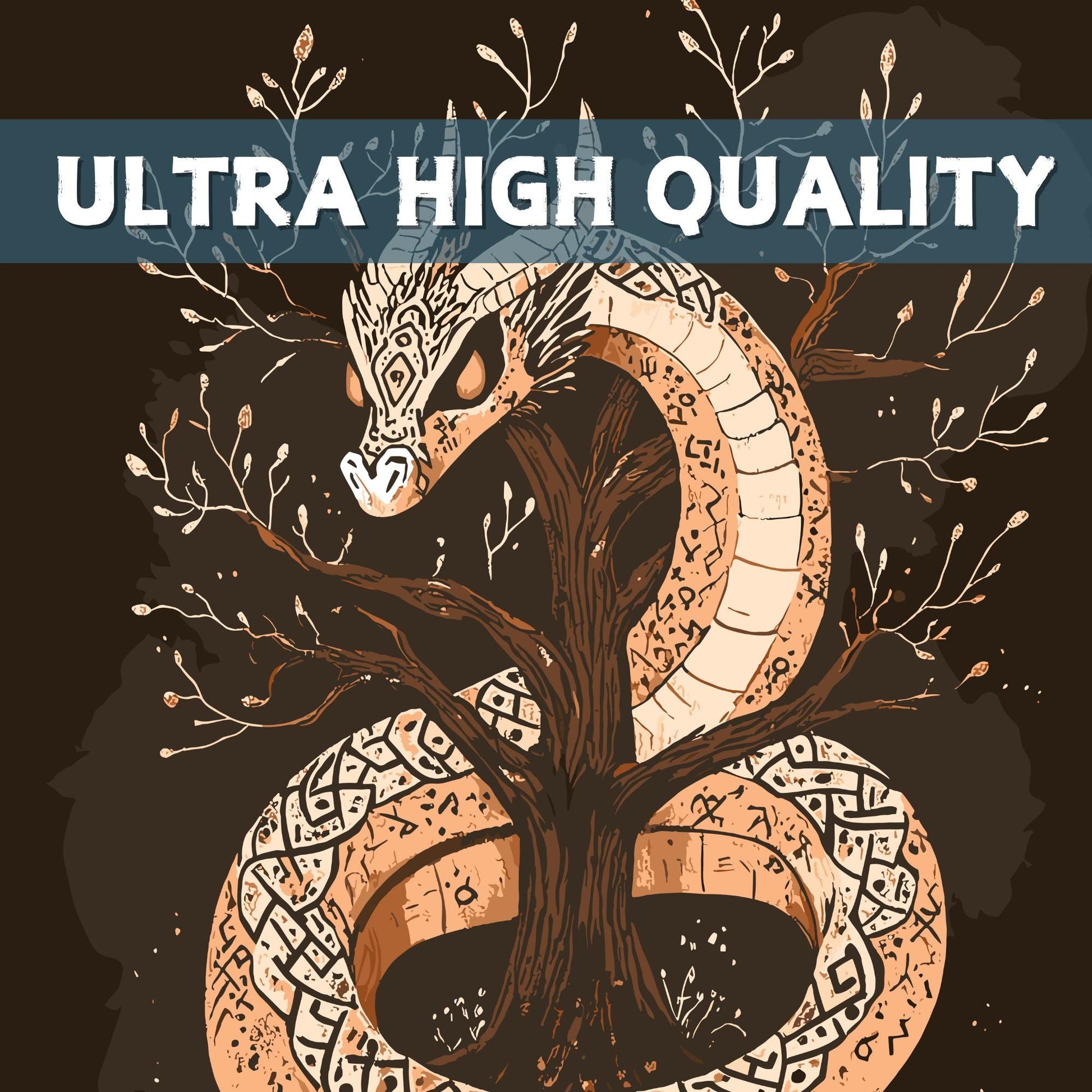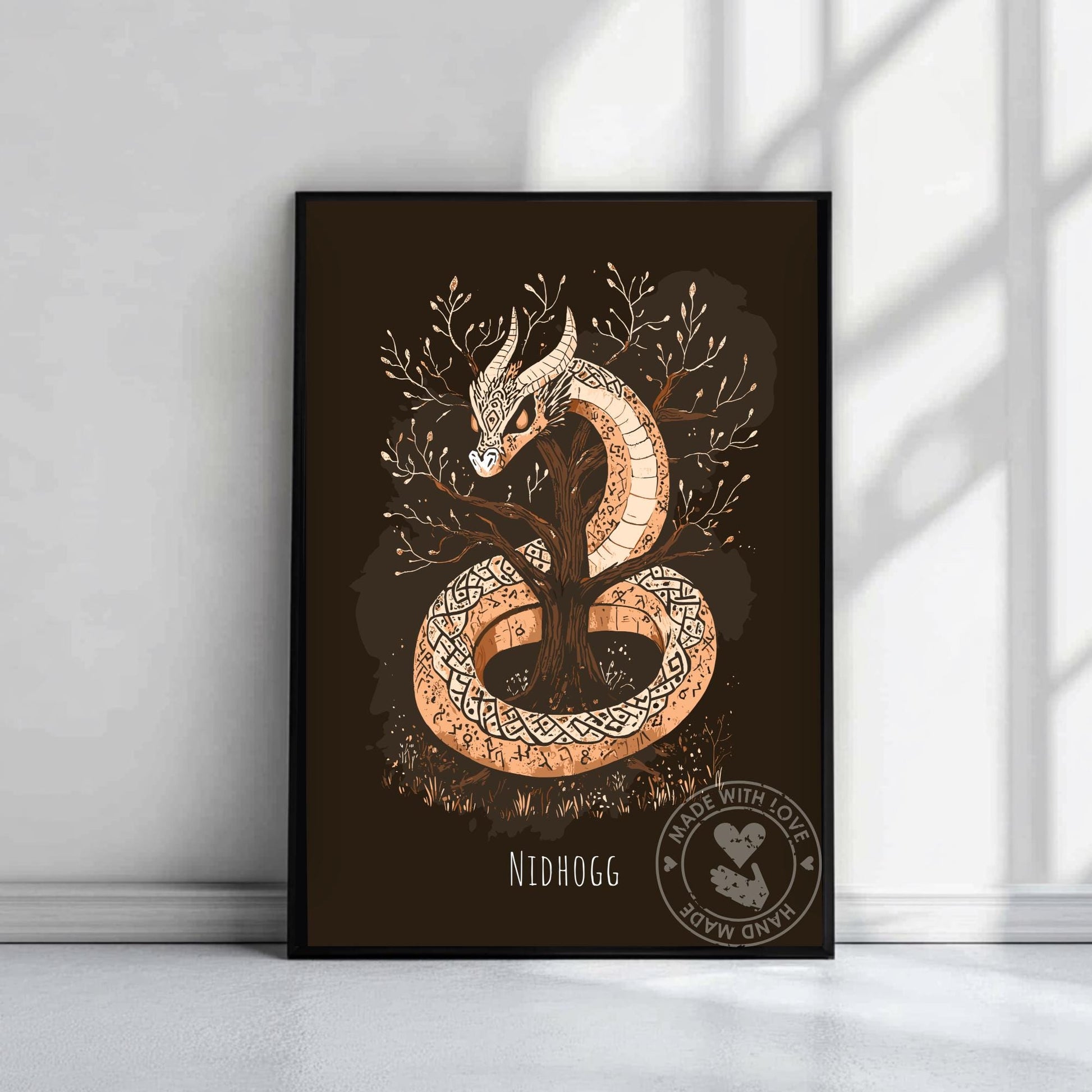 Cette affiche de Nidhogg représente le dragon nordique rongeant les racines d'Yggdrasil, les yeux brillants de menace. Elle capture Nidhogg dans un tourbillon sombre, ancré dans les légendes souterraines du folklore nordique.