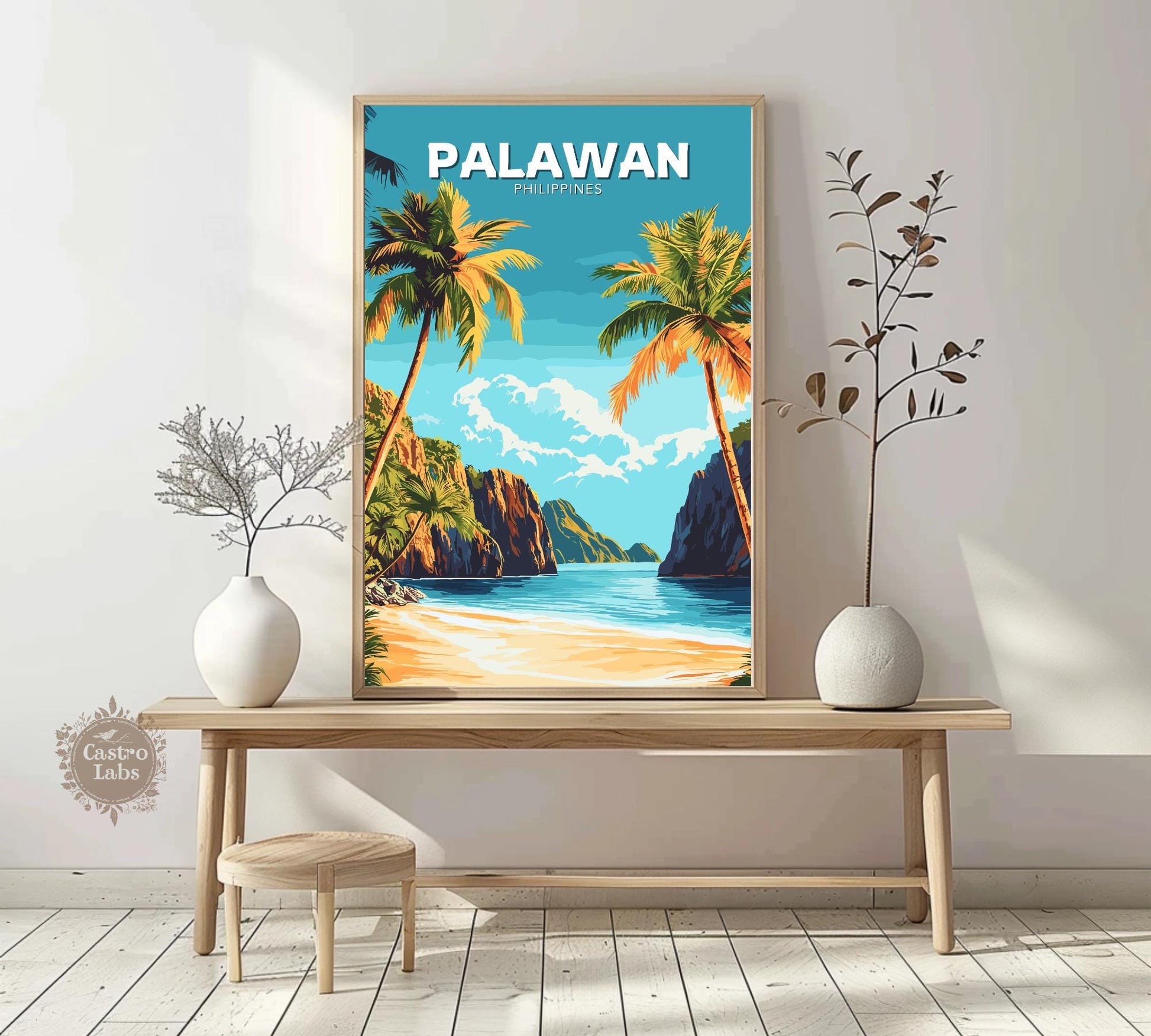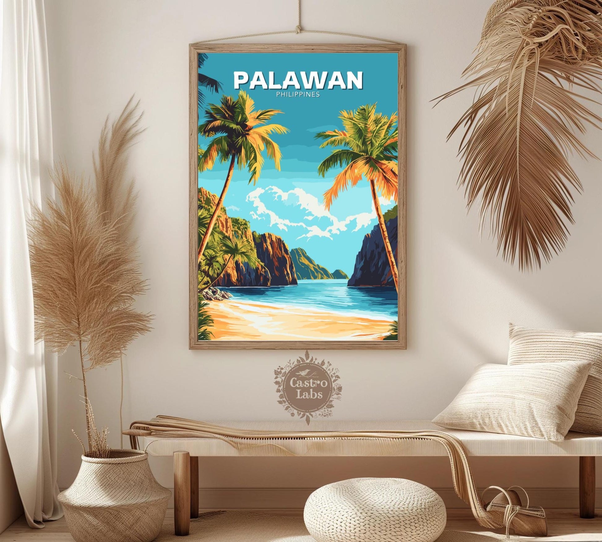 Cette œuvre allie des teintes vives au charme exotique de Palawan, capturant ainsi son essence de joyau insulaire mondial. Imprimée sur un papier de haute qualité, elle offre une brillance durable et une finition soignée, ce qui en fait un cadeau idéal pour les voyageurs ou les amoureux de l'océan. Cette affiche de Palawan insufflera à n'importe quel espace une touche de sérénité tropicale.