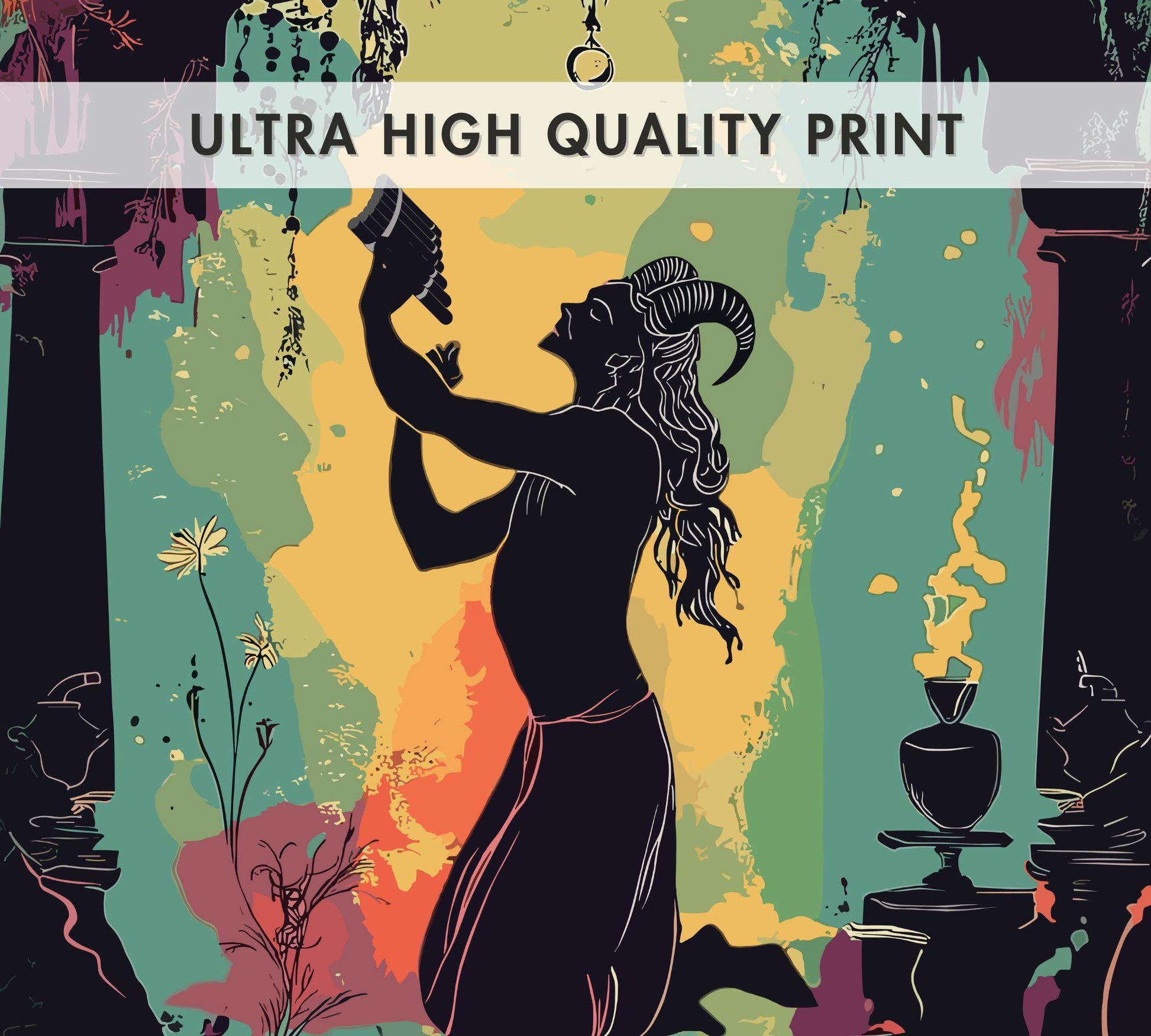 Notre affiche du dieu Pan – une œuvre d'art mythologique grecque – s'intègre harmonieusement à votre intérieur grâce à son design sauvage et rustique. Parfaite pour les passionnés de mythologie et de nature, elle représente Pan, le dieu grec de la nature et des bergers, jouant de la flûte au cœur d'une forêt luxuriante. Que vous soyez passionné par son mythe ou amateur d'art terrestre, cette affiche mythologique de Pan apportera une touche de couleur à votre décoration.
