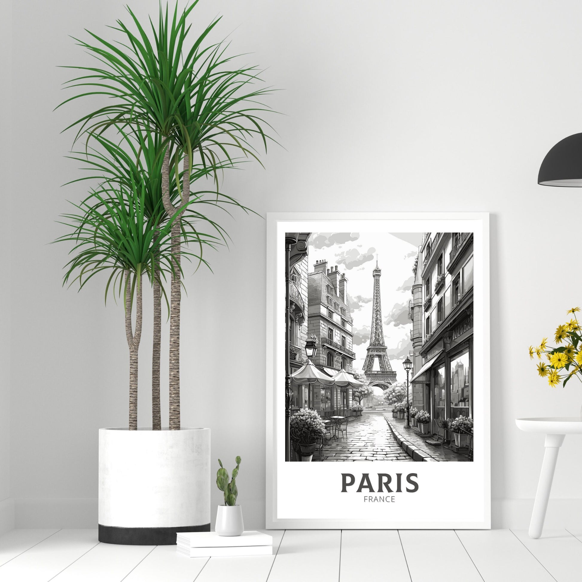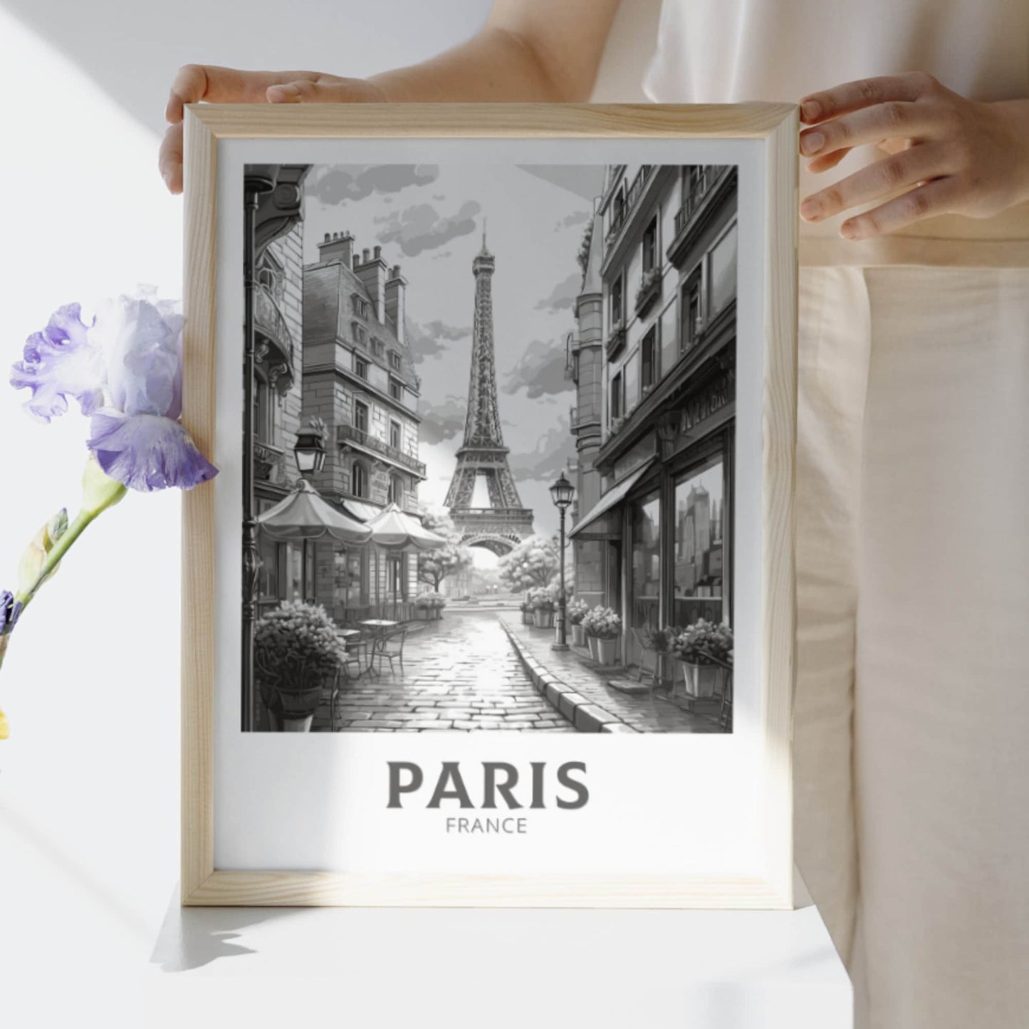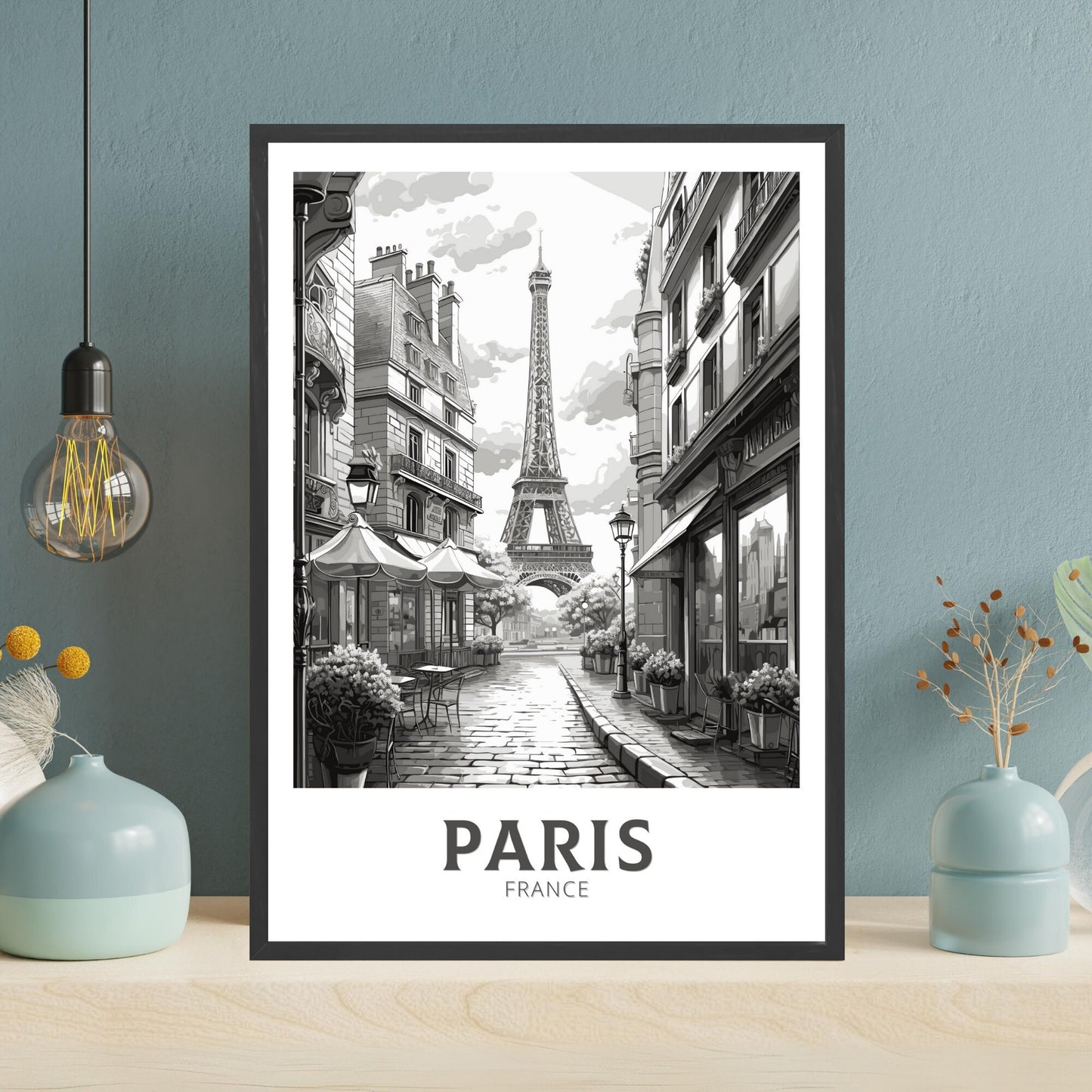 Inspirez le charme intemporel de Paris chez vous avec cette affiche de voyage en noir et blanc. Mettant en vedette les monuments emblématiques et l'architecture élégante de la ville, cette œuvre minimaliste capture l'atmosphère romantique de la capitale française dans une palette monochrome raffinée.