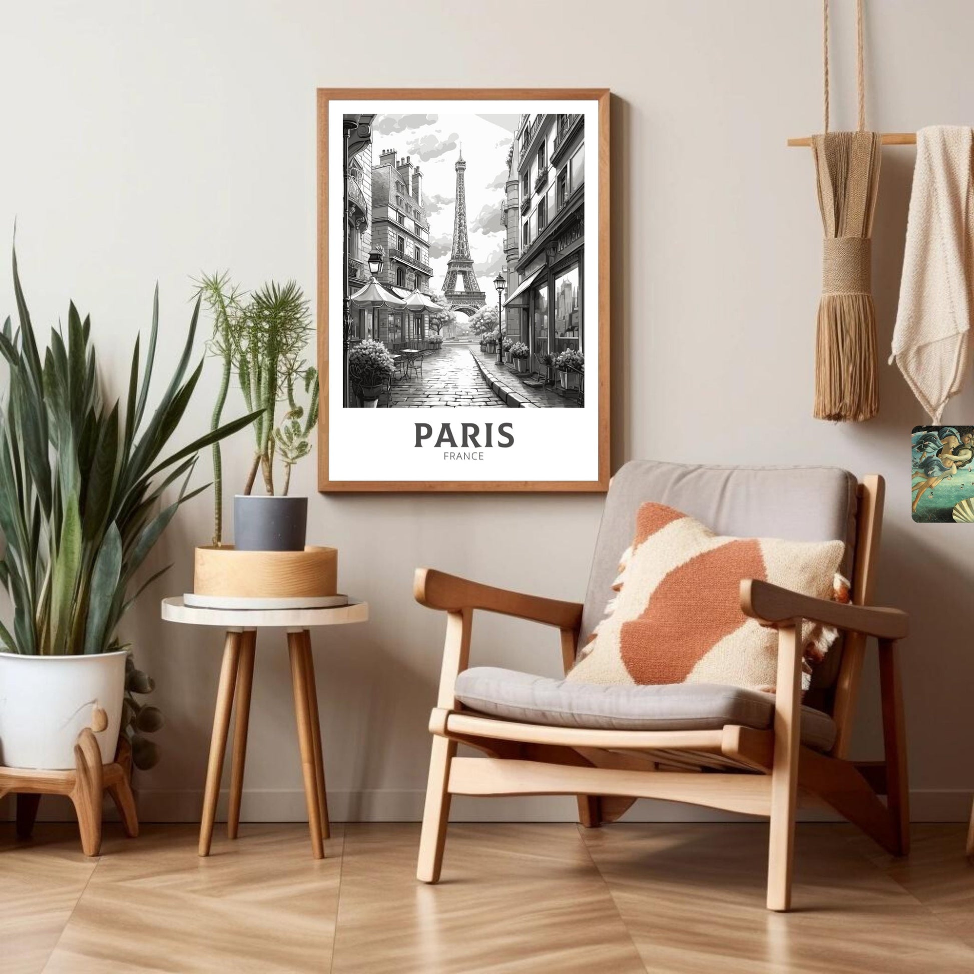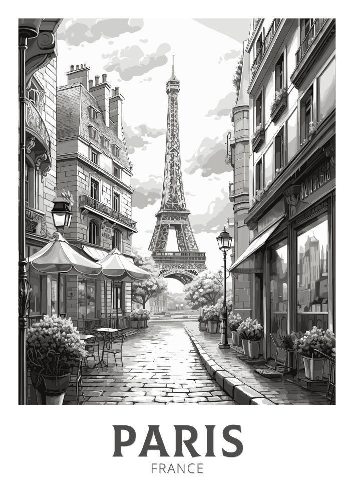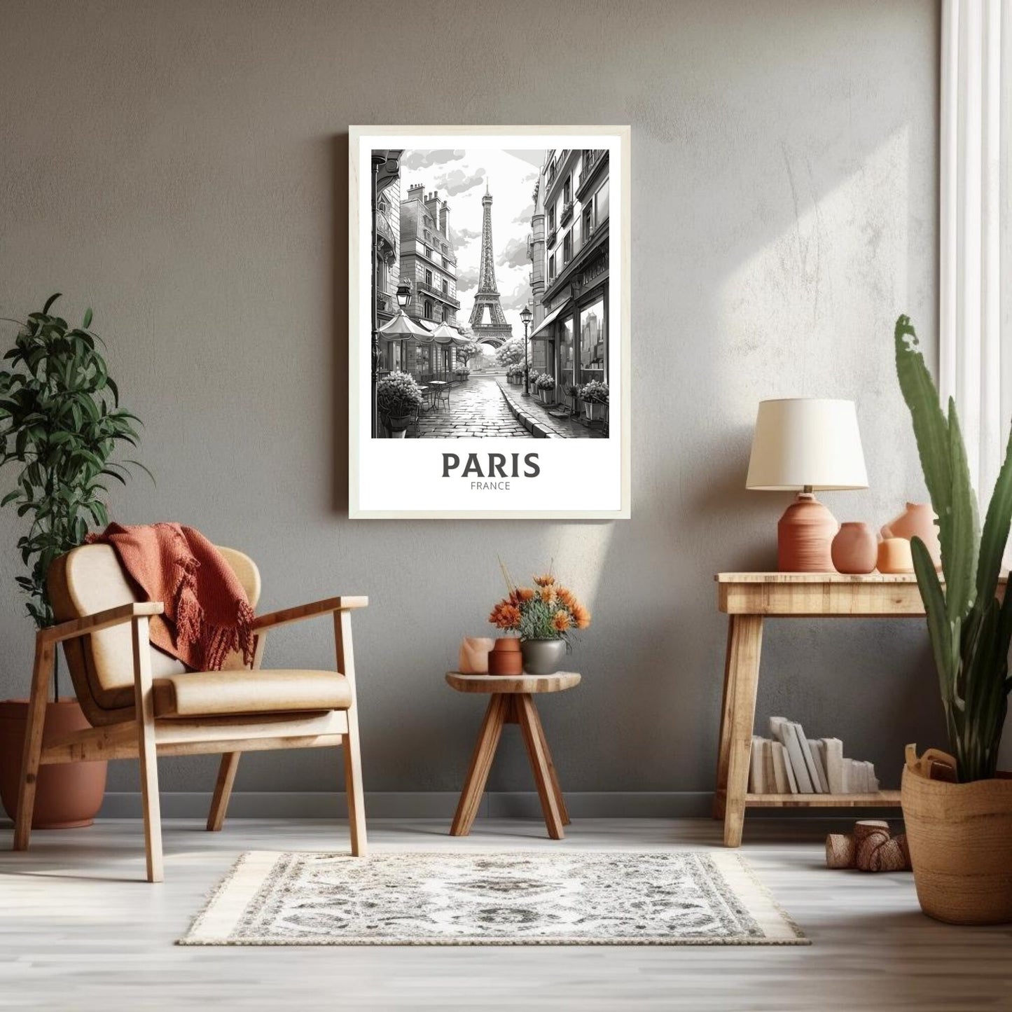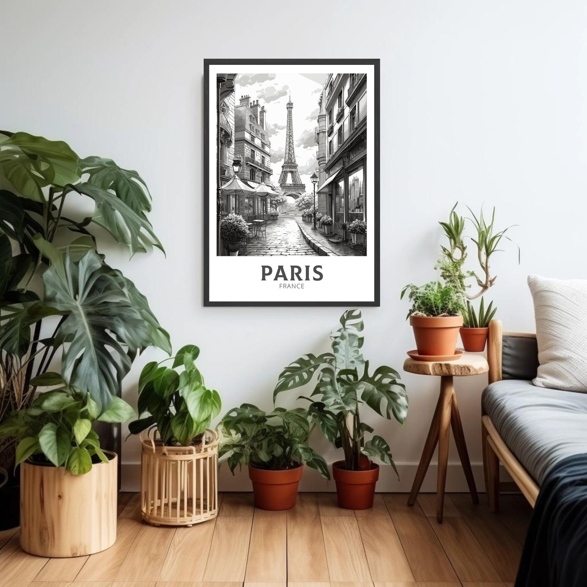 Inspirez le charme intemporel de Paris chez vous avec cette affiche de voyage en noir et blanc. Mettant en vedette les monuments emblématiques et l'architecture élégante de la ville, cette œuvre minimaliste capture l'atmosphère romantique de la capitale française dans une palette monochrome raffinée.