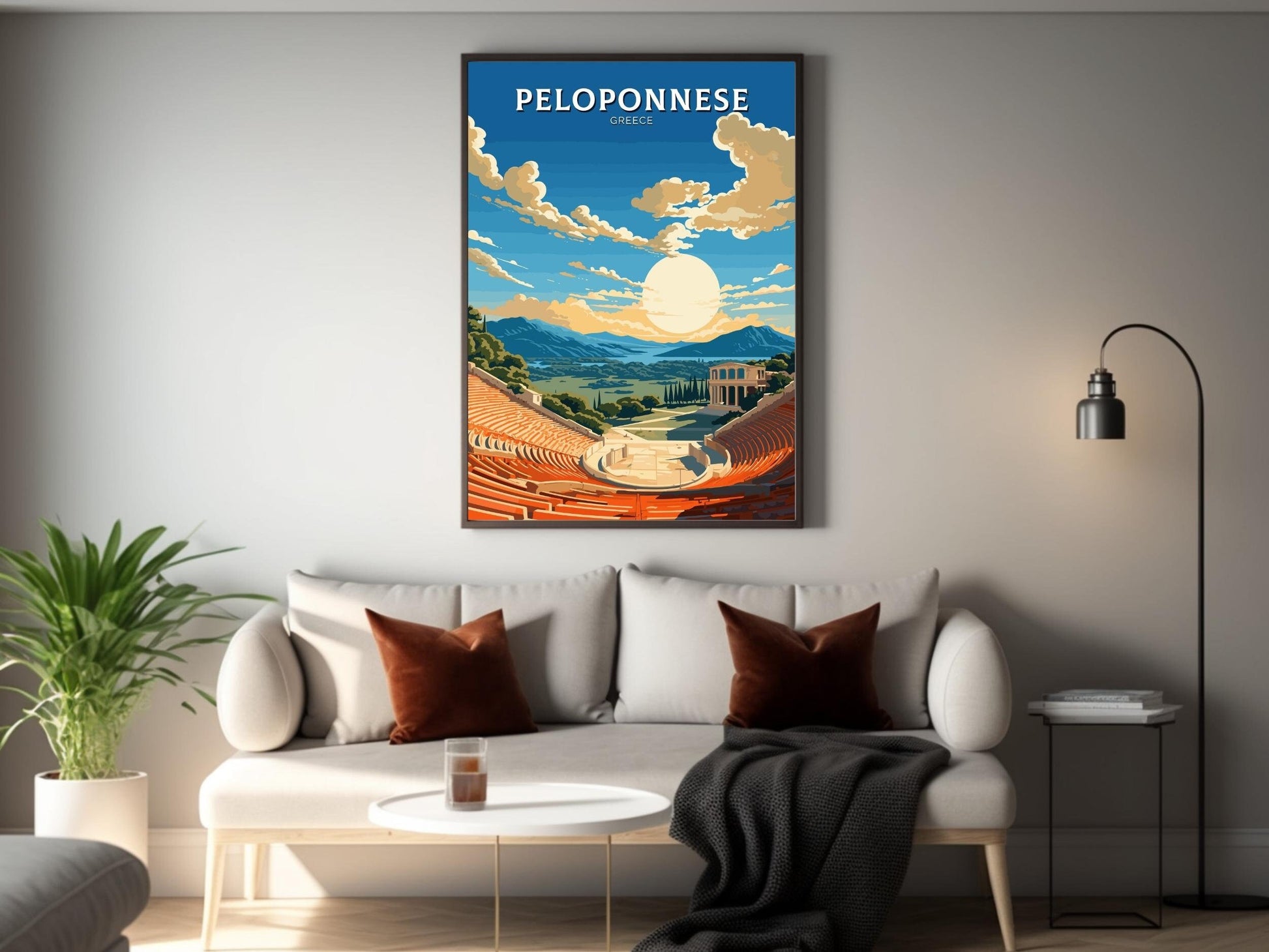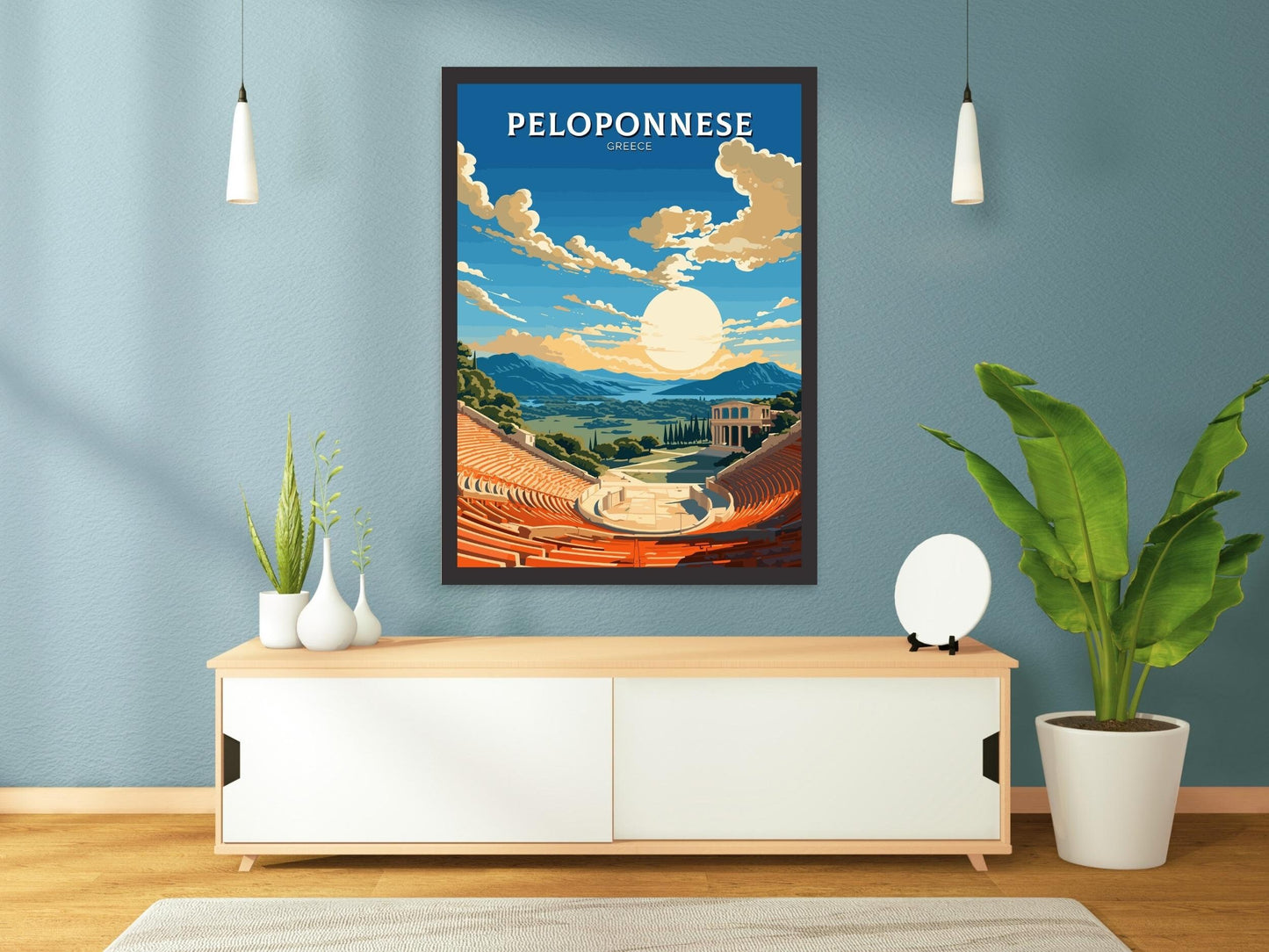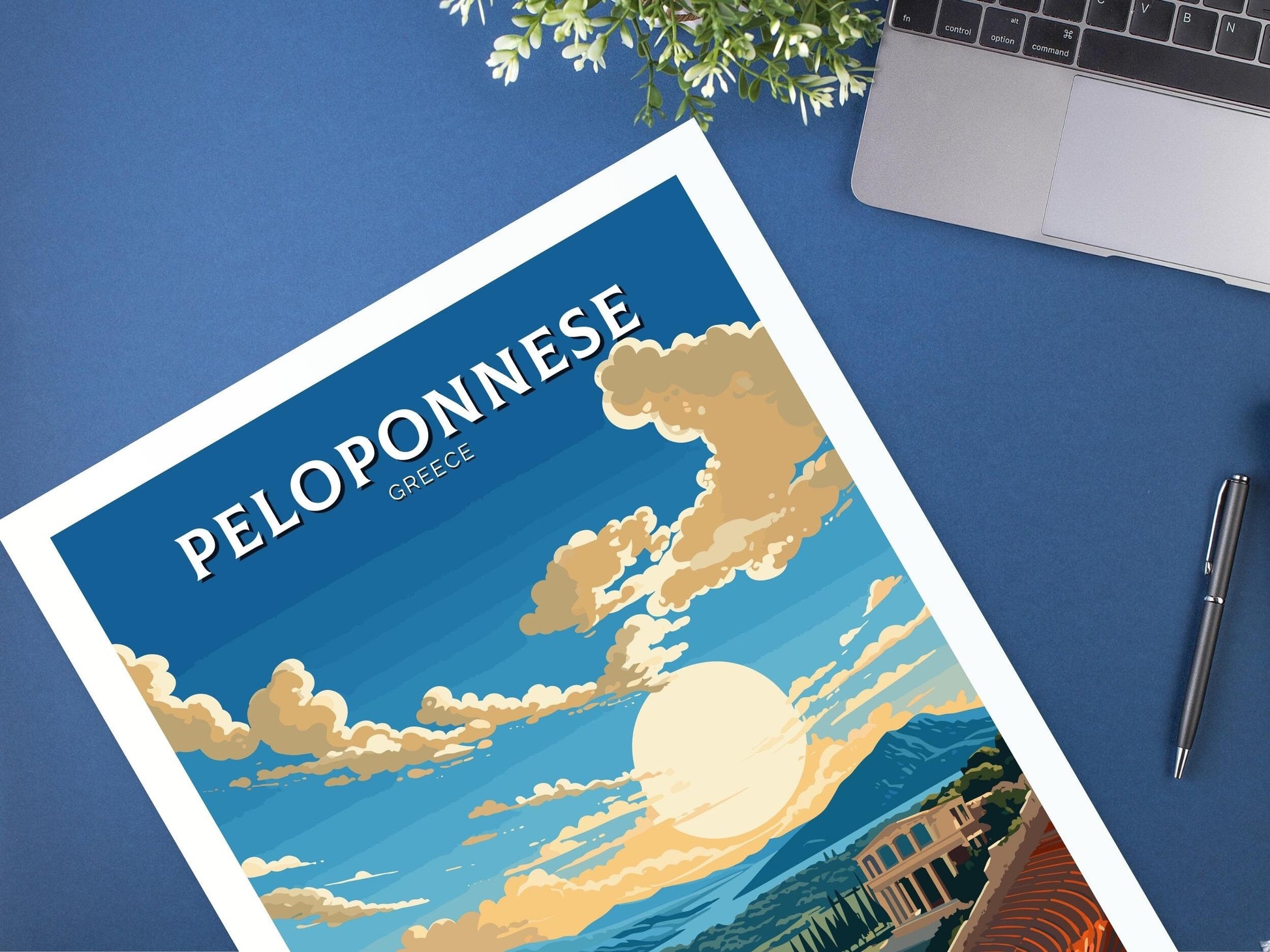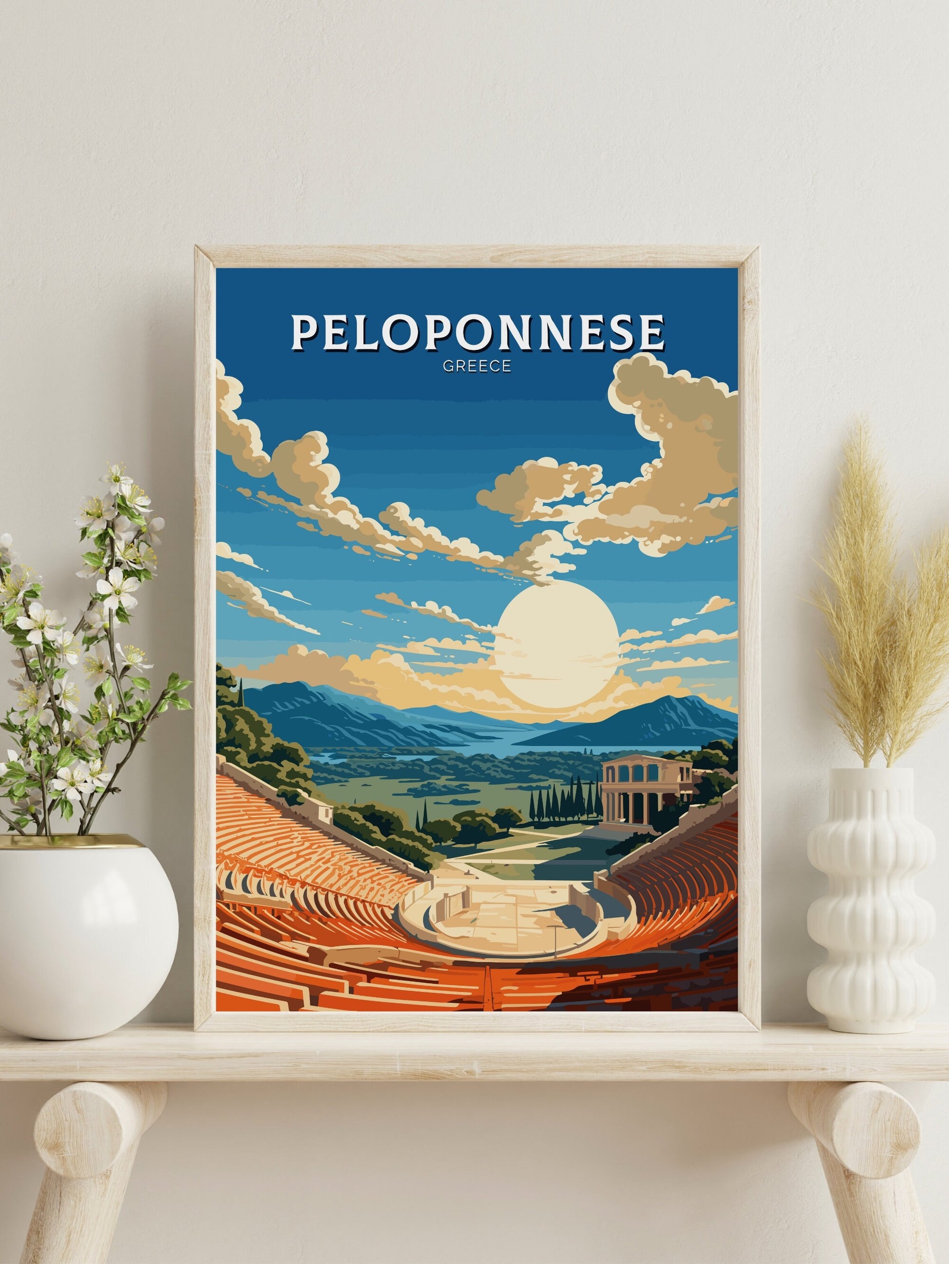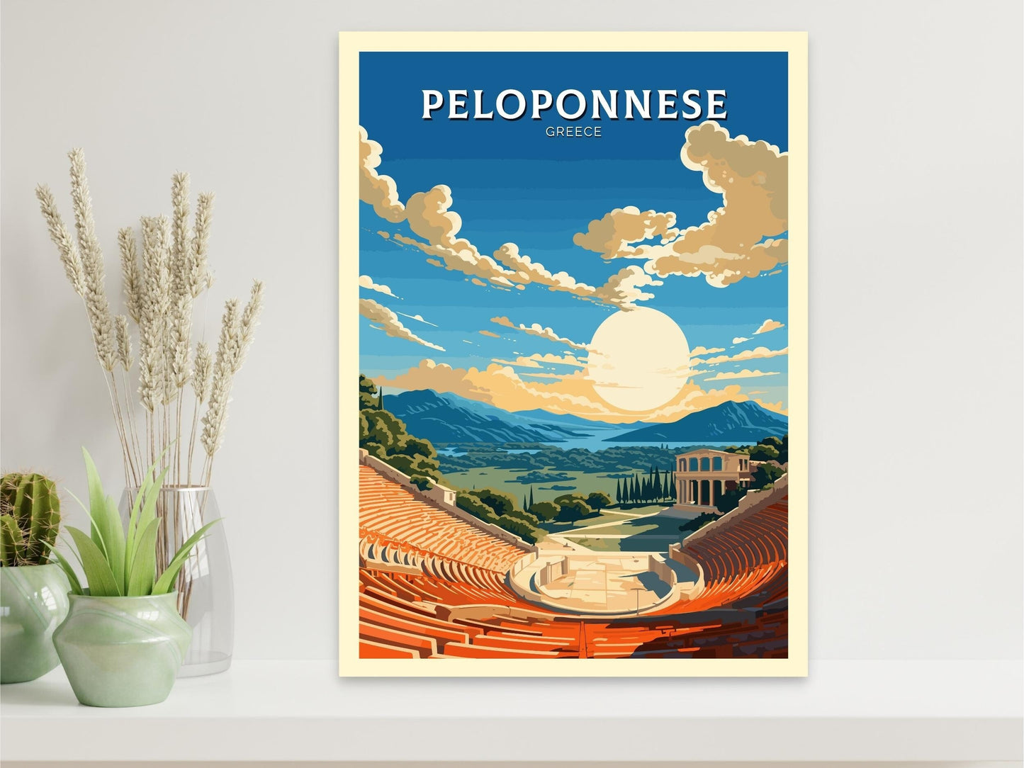 Découvrez le cœur mythique de la Grèce avec cette affiche de voyage du Péloponnèse – Illustration Grèce . Dotée d'un design évocateur inspiré des monuments antiques, des montagnes spectaculaires et des villages côtiers de la péninsule, cette affiche de style vintage capture l'atmosphère intemporelle du sud de la Grèce. Des ruines de Mycènes aux rivages de Nauplie, elle célèbre l'histoire, la nature et la richesse culturelle qui caractérisent le Péloponnèse.