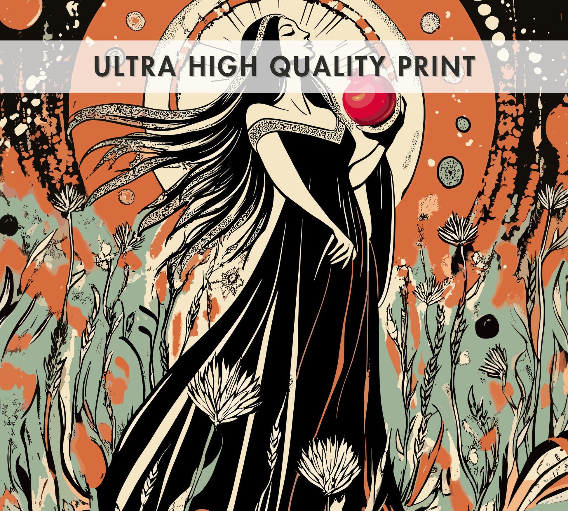 Cette œuvre mêle des verts vibrants et des rouges profonds à la double essence de Perséphone, capturant sa grâce et son mystère dans un style intemporel. Imprimée sur un papier de qualité supérieure, elle offre une vivacité durable et une finition lisse, ce qui en fait un cadeau idéal pour les passionnés d'histoire ou de mythologie. Ce poster Perséphone apporte une touche d'élégance antique à n'importe quel mur.