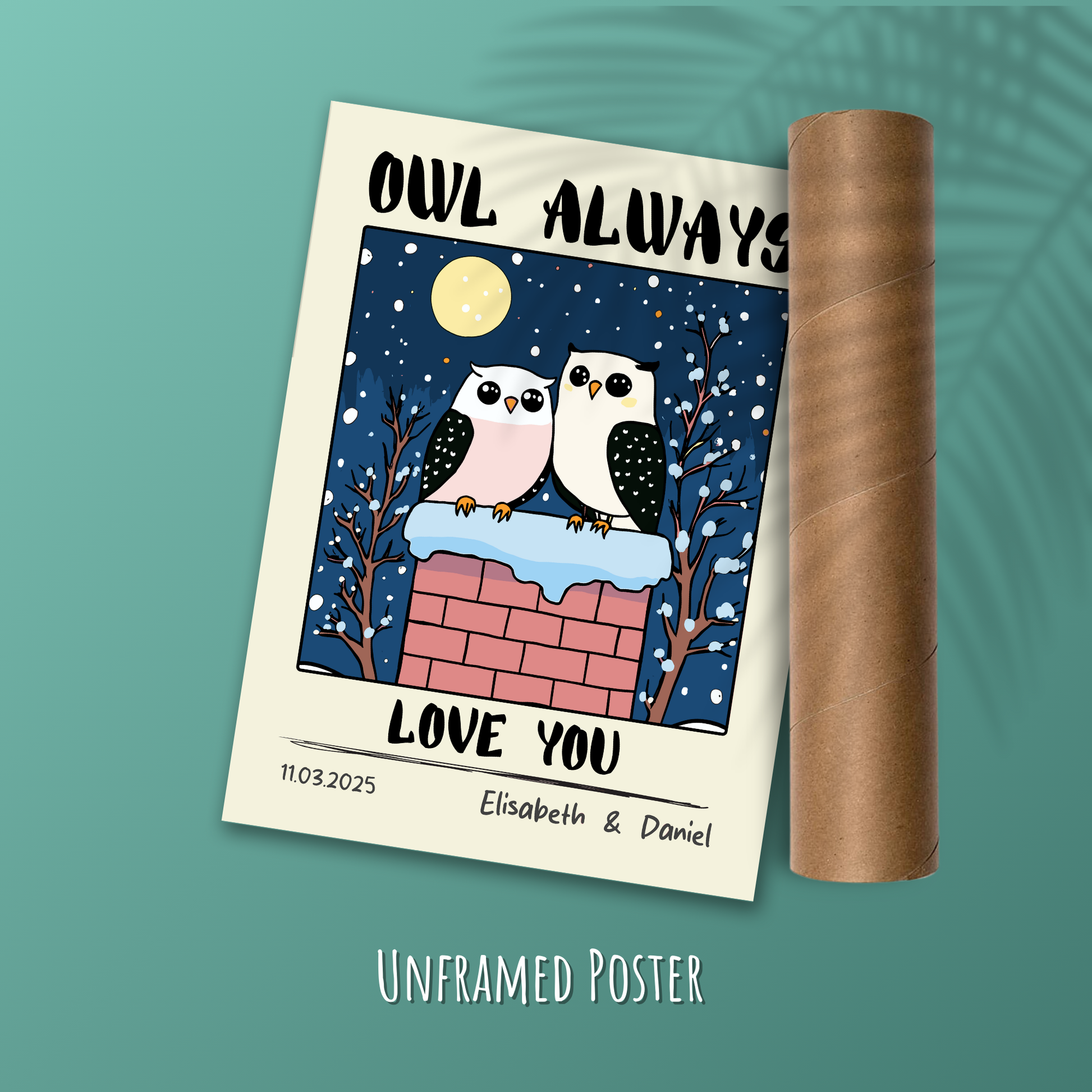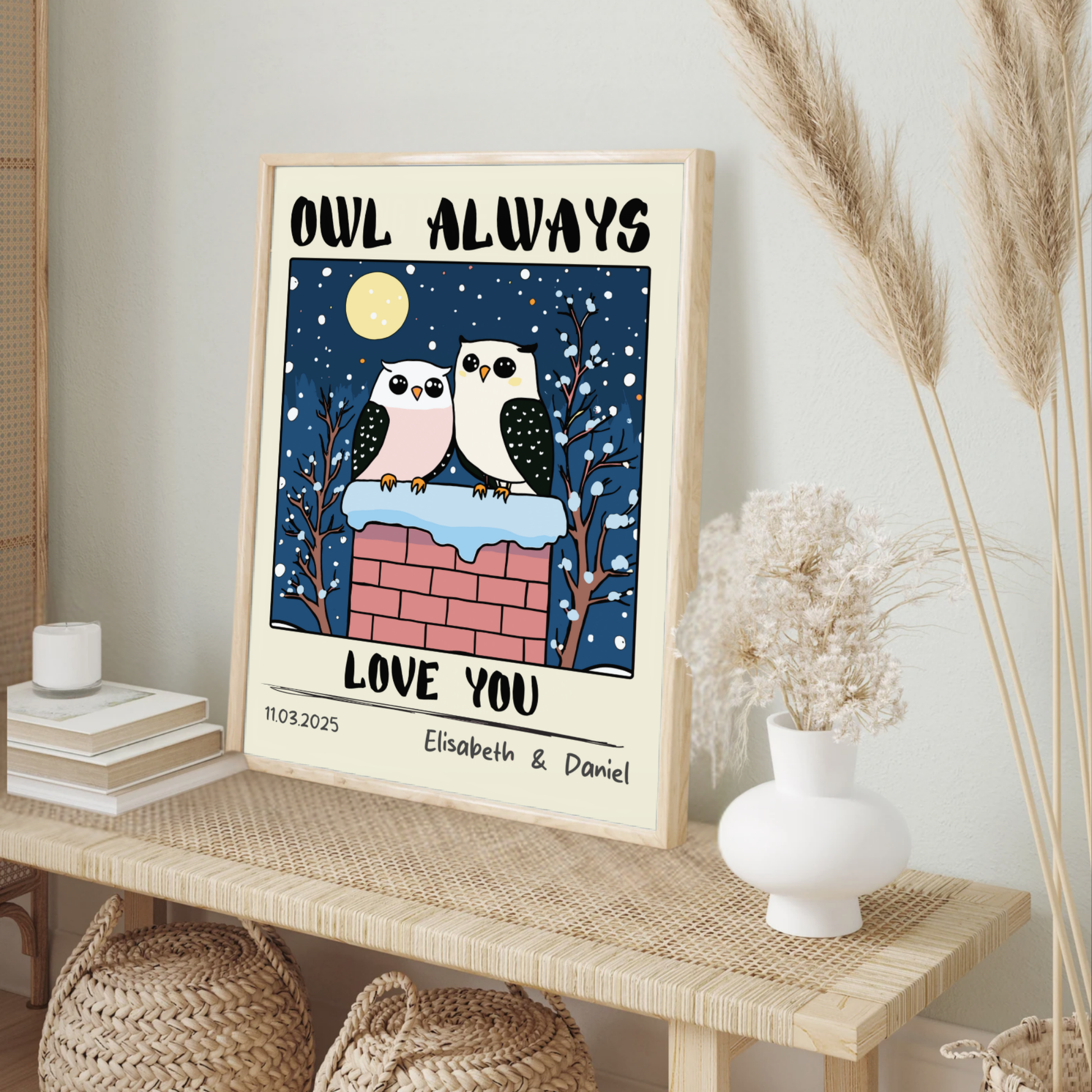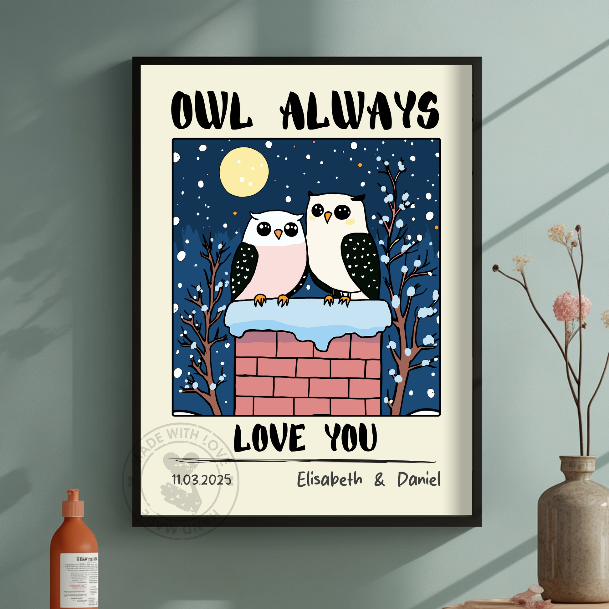 Imprimée sur un papier de haute qualité aux couleurs vibrantes et aux détails raffinés, cette reproduction d'art de hibou personnalisée peut être personnalisée pour vous représenter, vous et votre partenaire, avec créativité. Qu'elle soit exposée dans une chambre, un salon ou une galerie murale, cette œuvre unique apportera une touche de joie et de charme inspirée de la nature à votre intérieur.