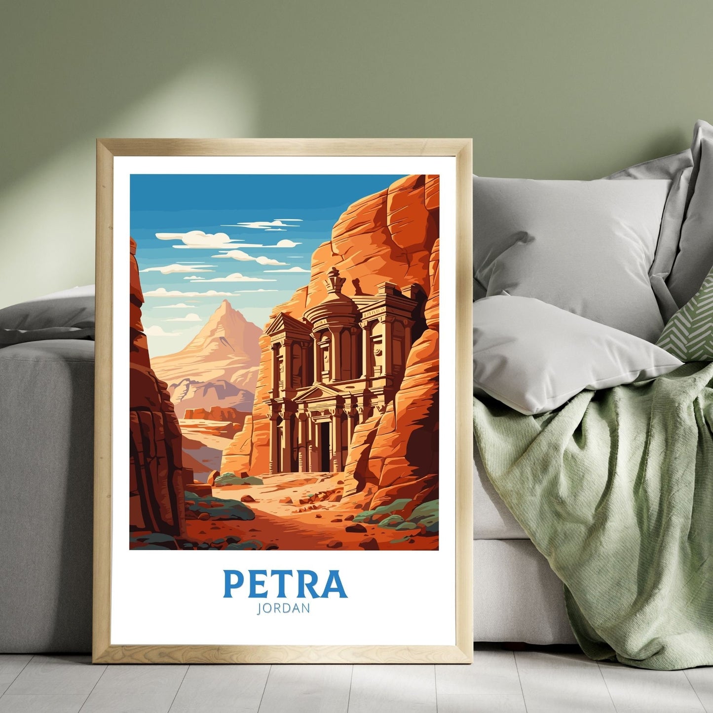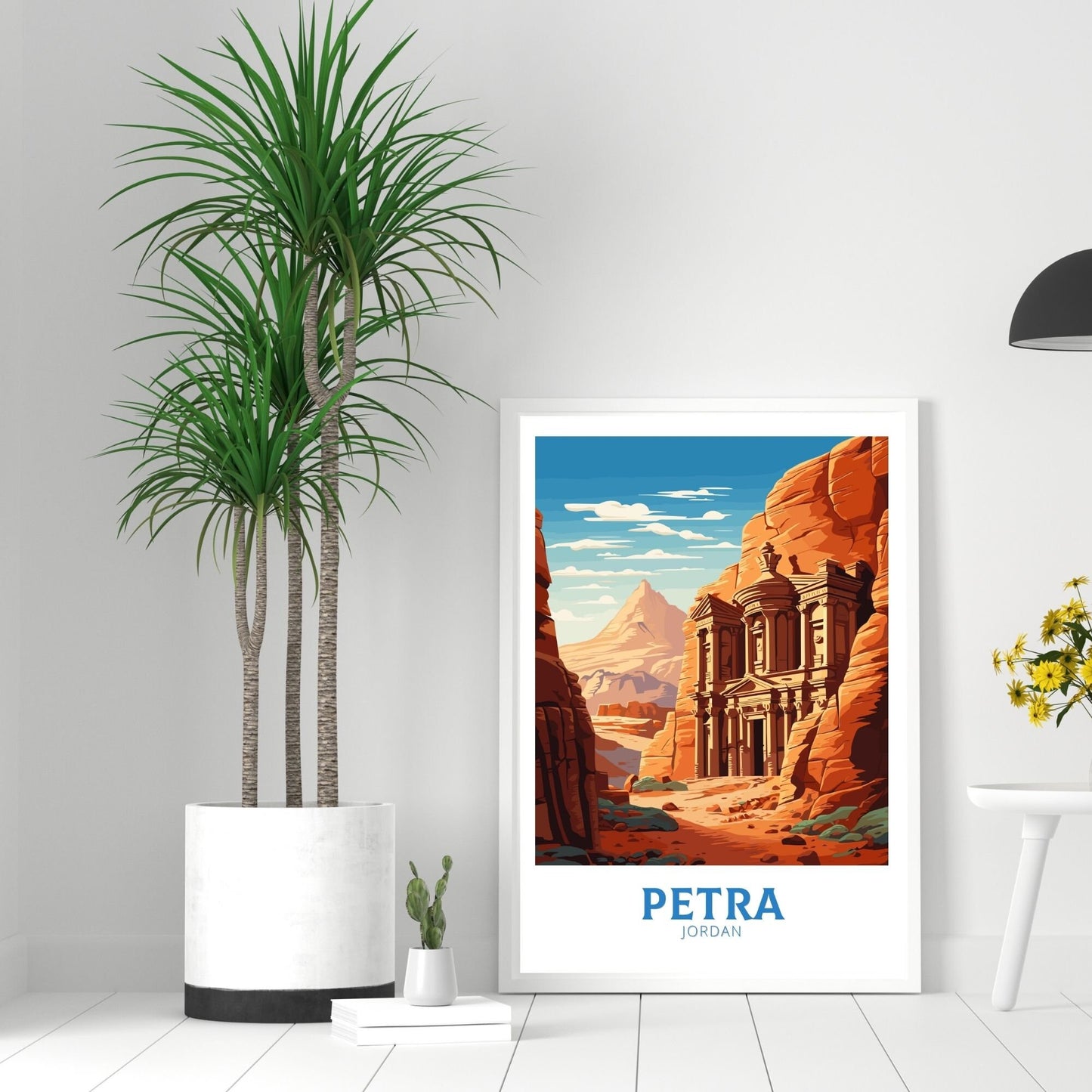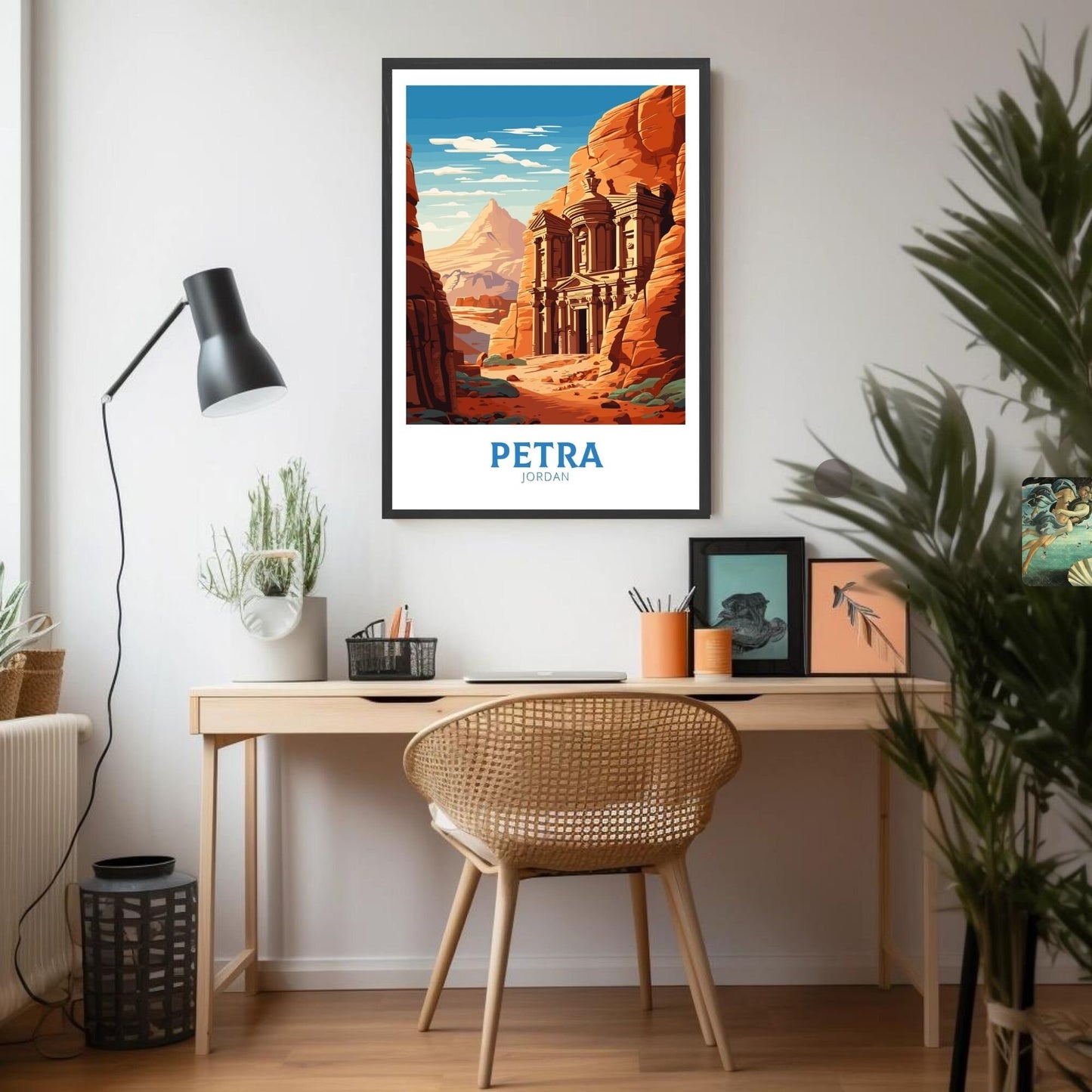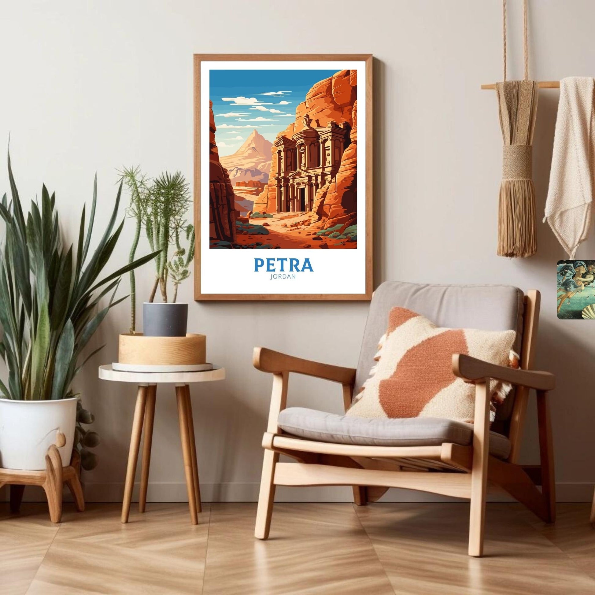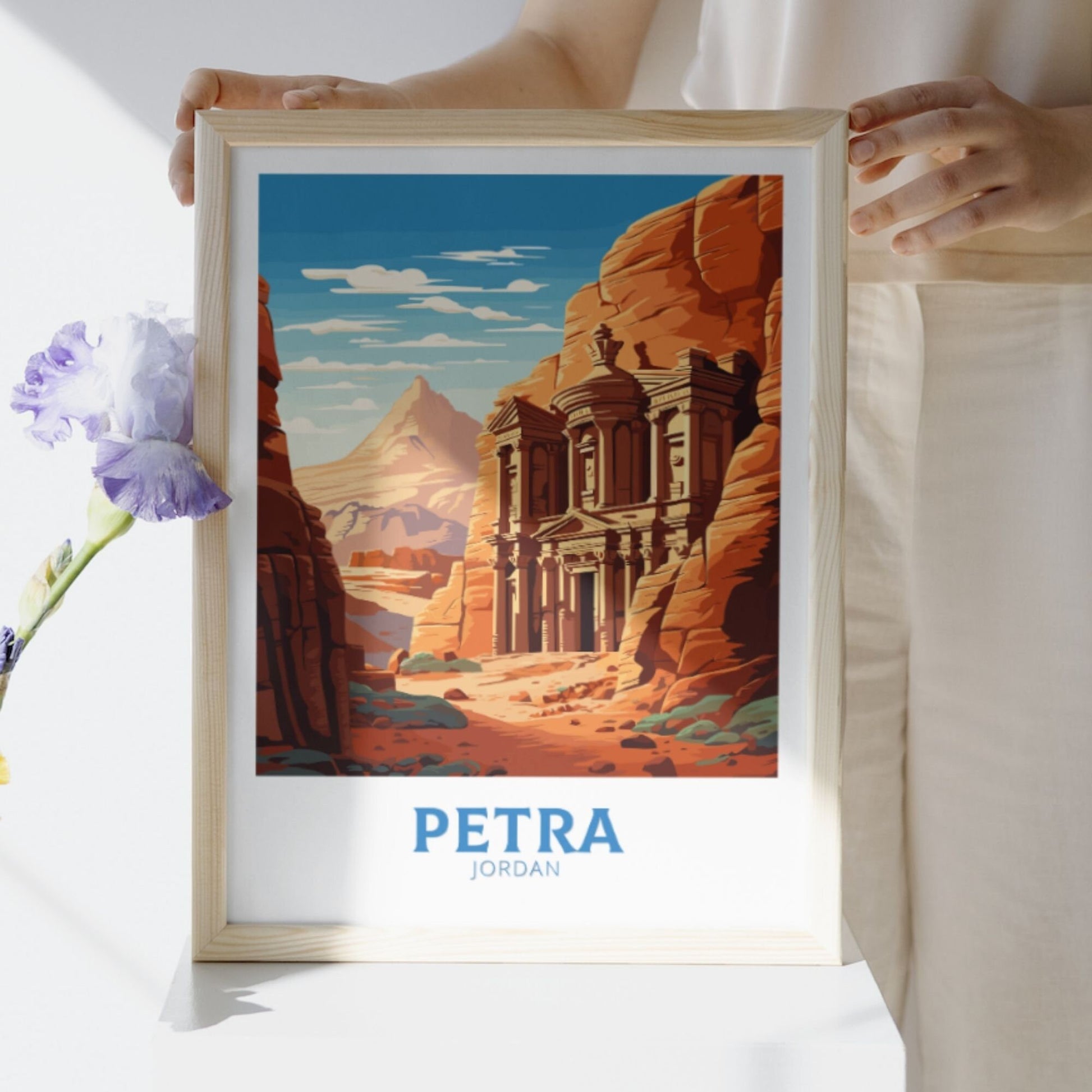 Notre affiche Petra – Art rétro jordanien – plonge votre intérieur dans le mystère antique de la Jordanie grâce à son design nostalgique. Idéale pour les passionnés de voyages et les amateurs d'art rétro, elle capture les façades rose rouge de Pétra et ses canyons désertiques dans un style intemporel. Que vous ayez erré dans ses ruines ou rêvé de son histoire, cette affiche rétro Petra apportera une touche d'élégance à votre décoration.