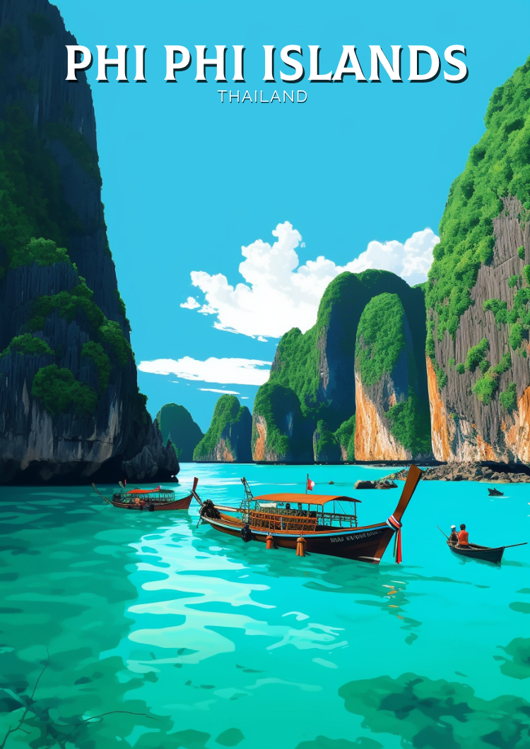 Notre affiche rétro Phi Phi - Art de voyage en Thaïlande plonge votre intérieur dans la splendeur tropicale des îles Phi Phi en Thaïlande grâce à son design nostalgique. Parfaite pour les passionnés de voyages et les amateurs d'art rétro, elle capture les eaux turquoise et les falaises calcaires des îles dans un style intemporel. Que vous ayez profité des plages ou rêvé du paradis, cette affiche Phi Phi Thaïlande sera un ajout magnifique à votre décoration.