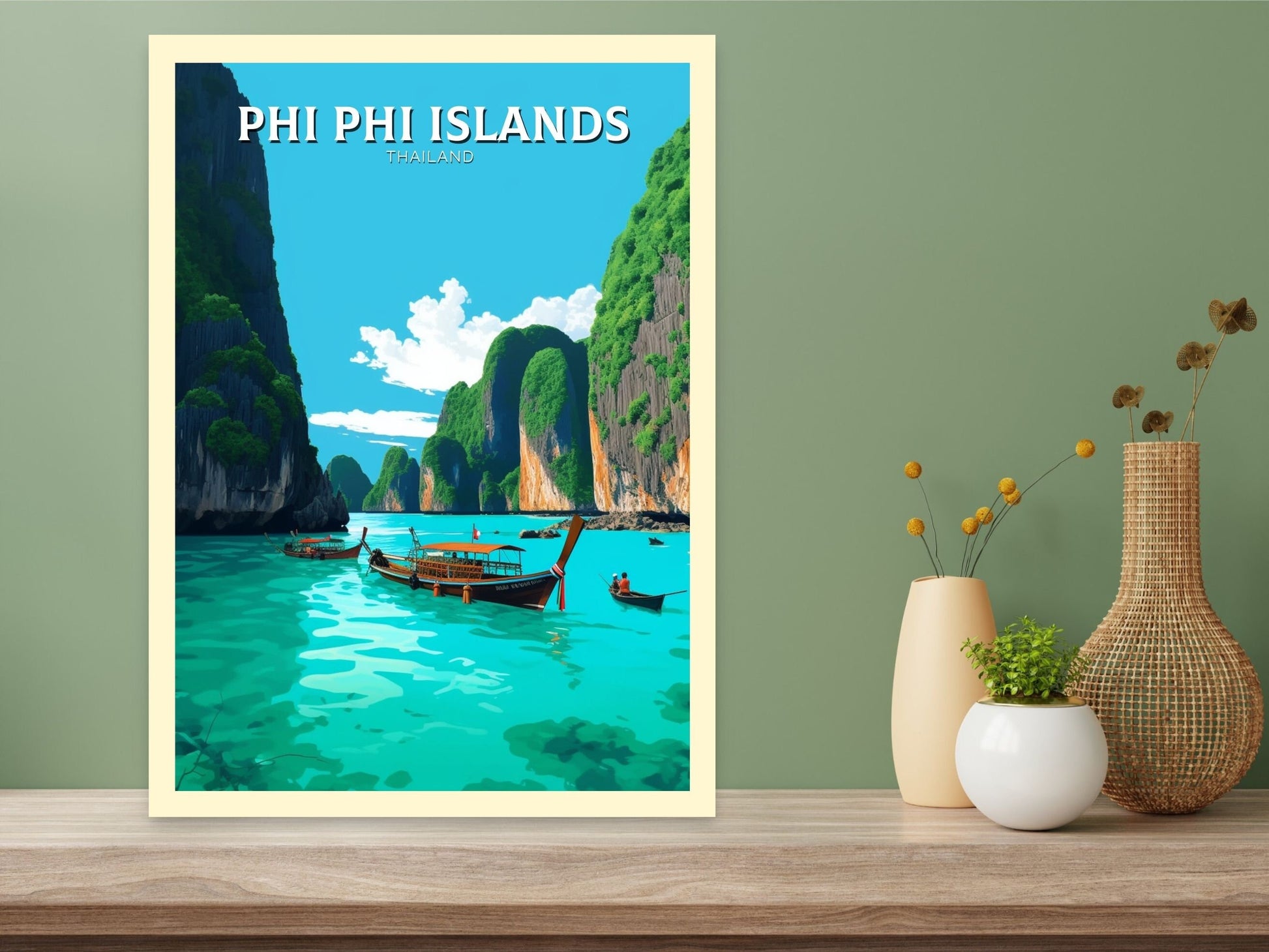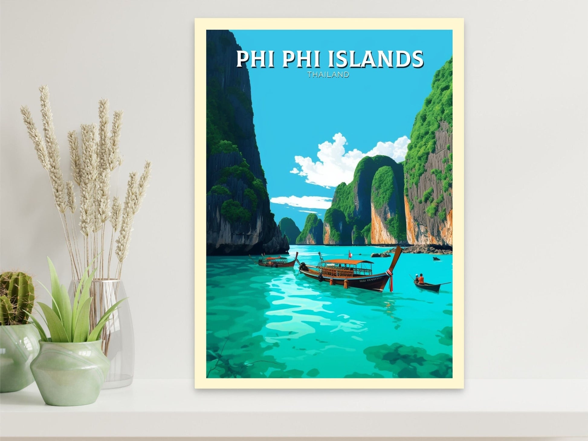 Transformez votre intérieur en un havre de paix des îles Phi Phi grâce à cette œuvre captivante. Idéale pour les salons, les maisons de plage ou les espaces inspirés du voyage, elle s'associe à merveille avec d'autres œuvres d'art rétro. Cette œuvre d'art de voyage en Thaïlande est bien plus qu'un simple objet de décoration : c'est un voyage vers les îles paradisiaques de Thaïlande.
