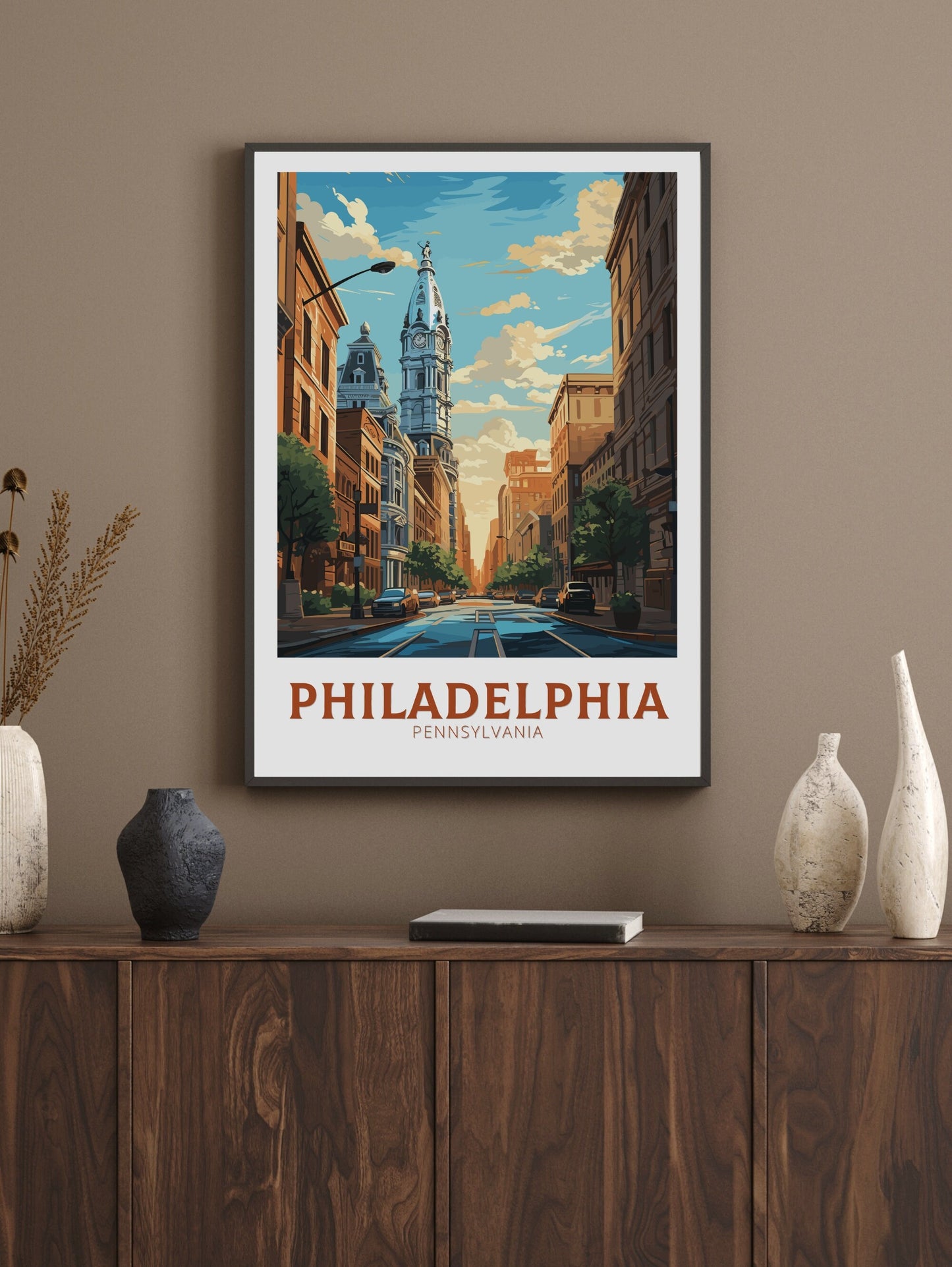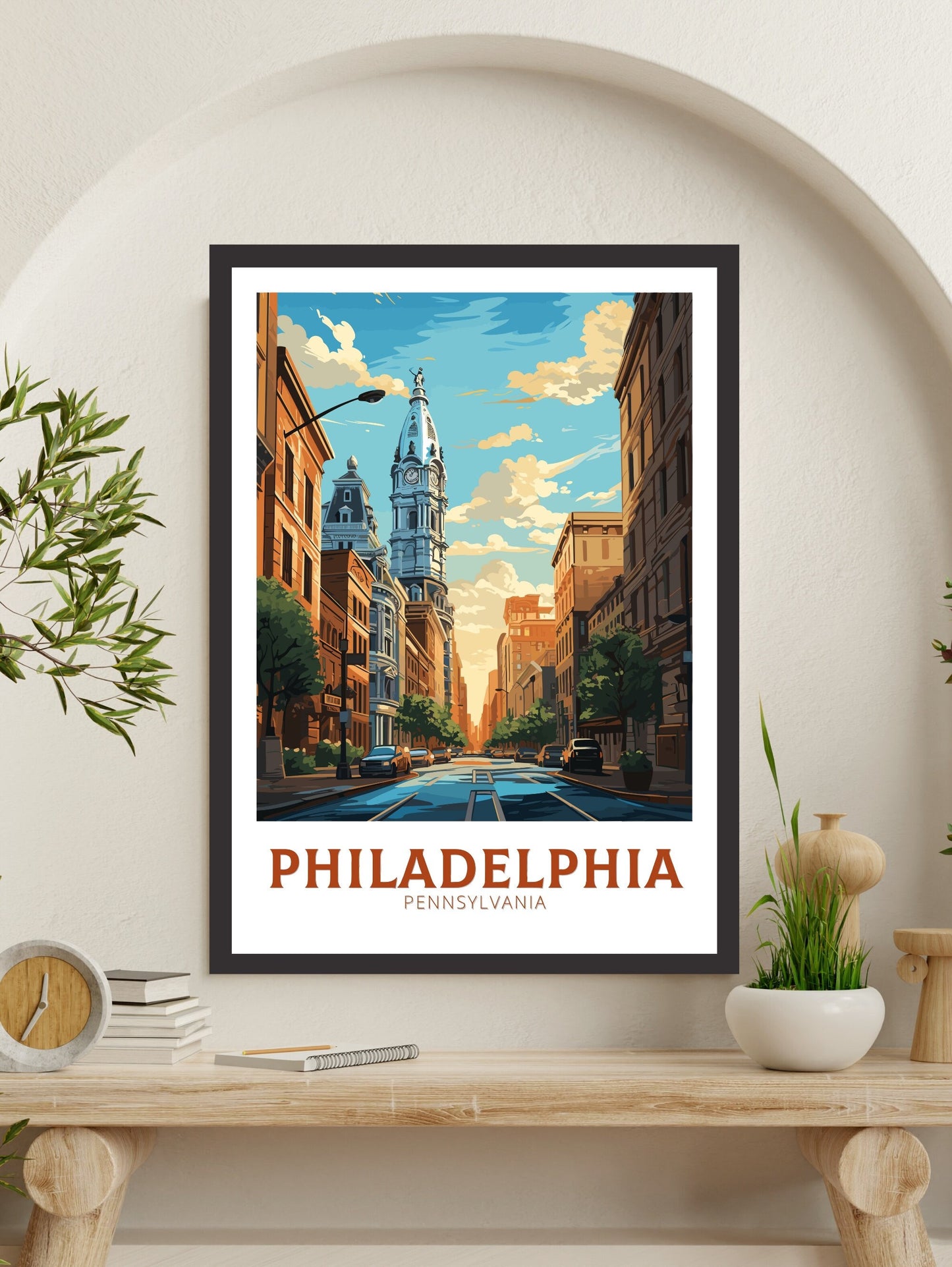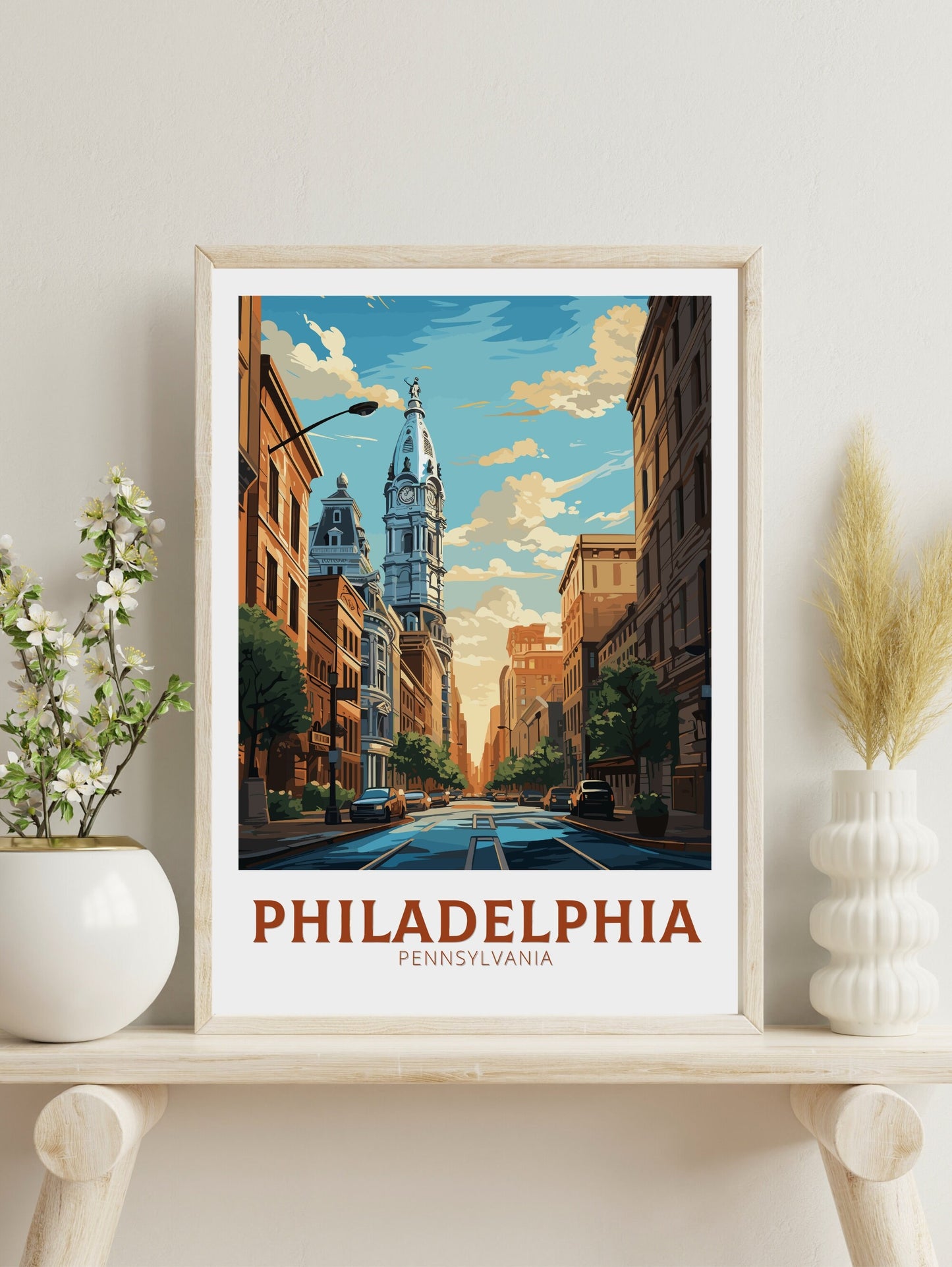 Disponible en téléchargement numérique et en tirage physique premium , cette affiche de voyage de Philadelphie est disponible en plusieurs formats, des formats de série A aux grands formats 76 x 102 cm. Ses couleurs vives et son design détaillé en font un ajout remarquable à votre maison, bureau ou mur de galerie, et un cadeau attentionné pour les admirateurs de la ville la plus historique de Pennsylvanie.