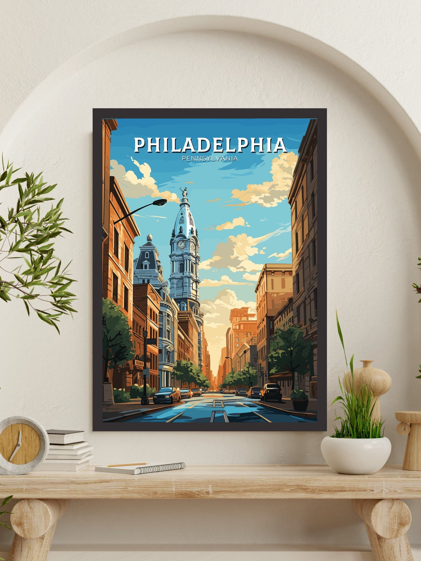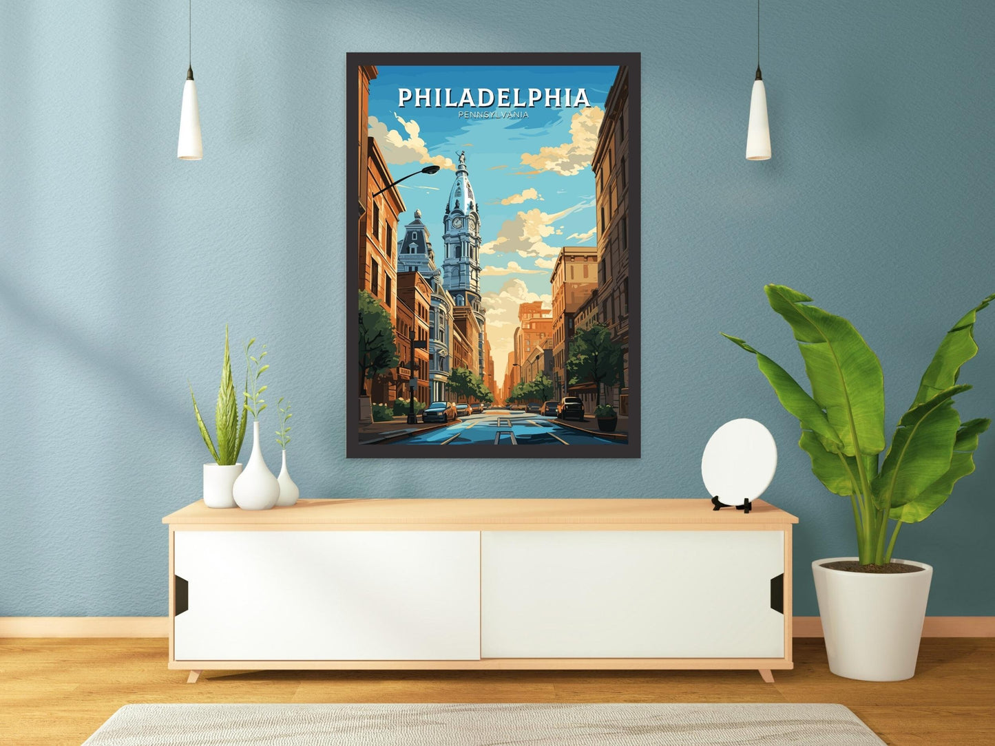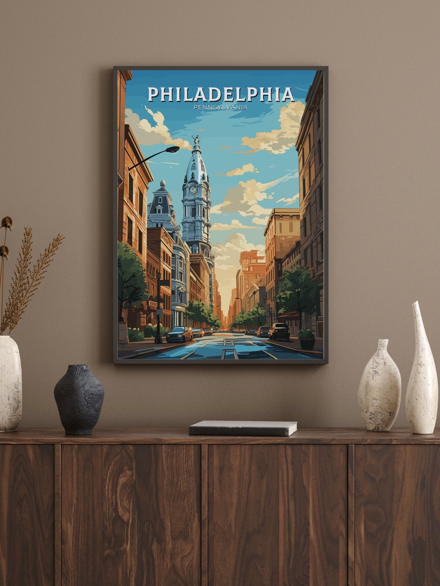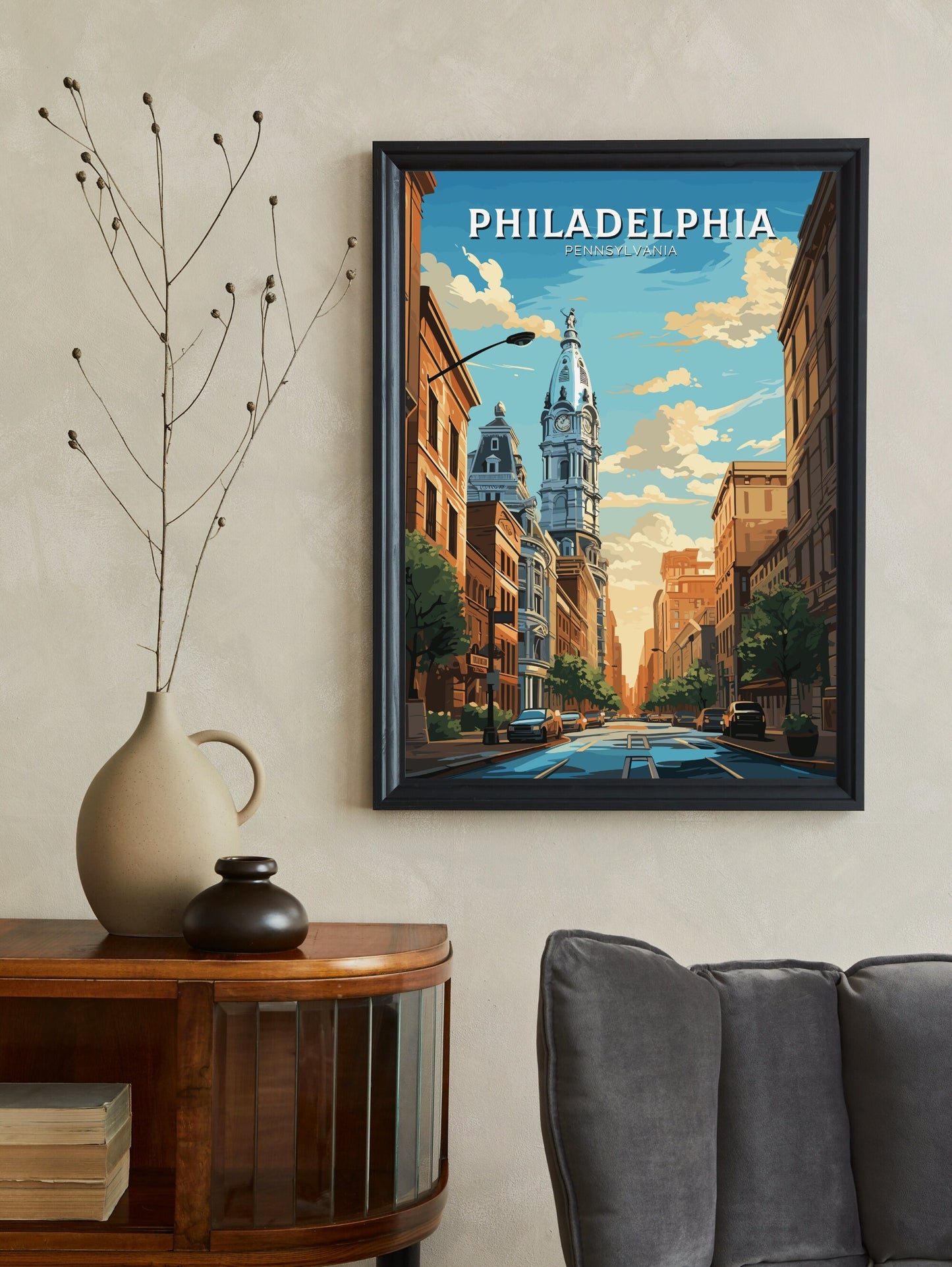 Disponible en téléchargement numérique et en tirage physique premium , cette affiche de voyage de Philadelphie est disponible dans une variété de formats, des formats de série A aux grands formats 30 x 40 pouces. Ses détails éclatants et sa conception de haute qualité en font un ajout remarquable à toute maison, bureau ou mur de galerie, et un cadeau idéal pour quiconque s'inspire du charme historique de la Pennsylvanie.