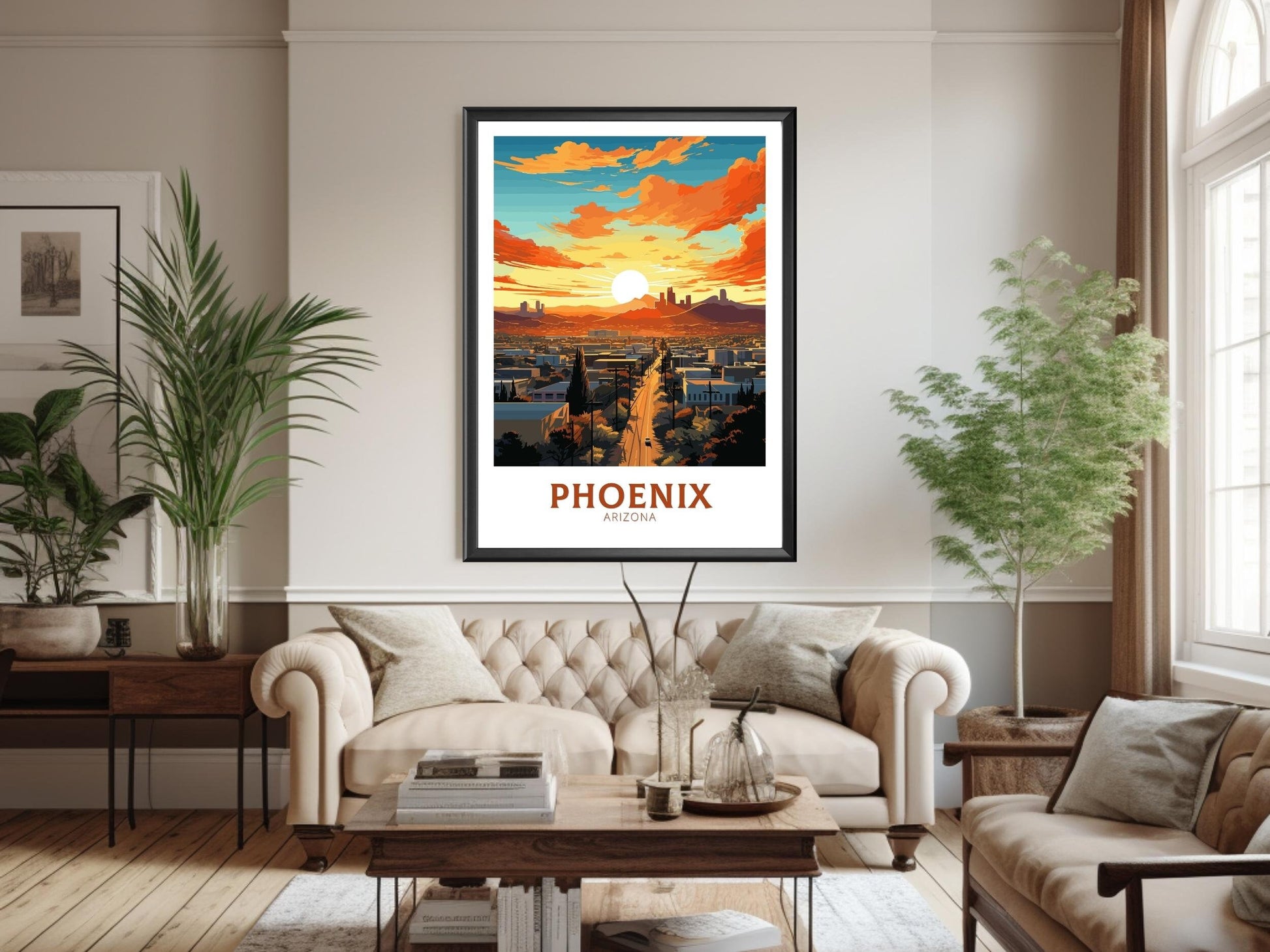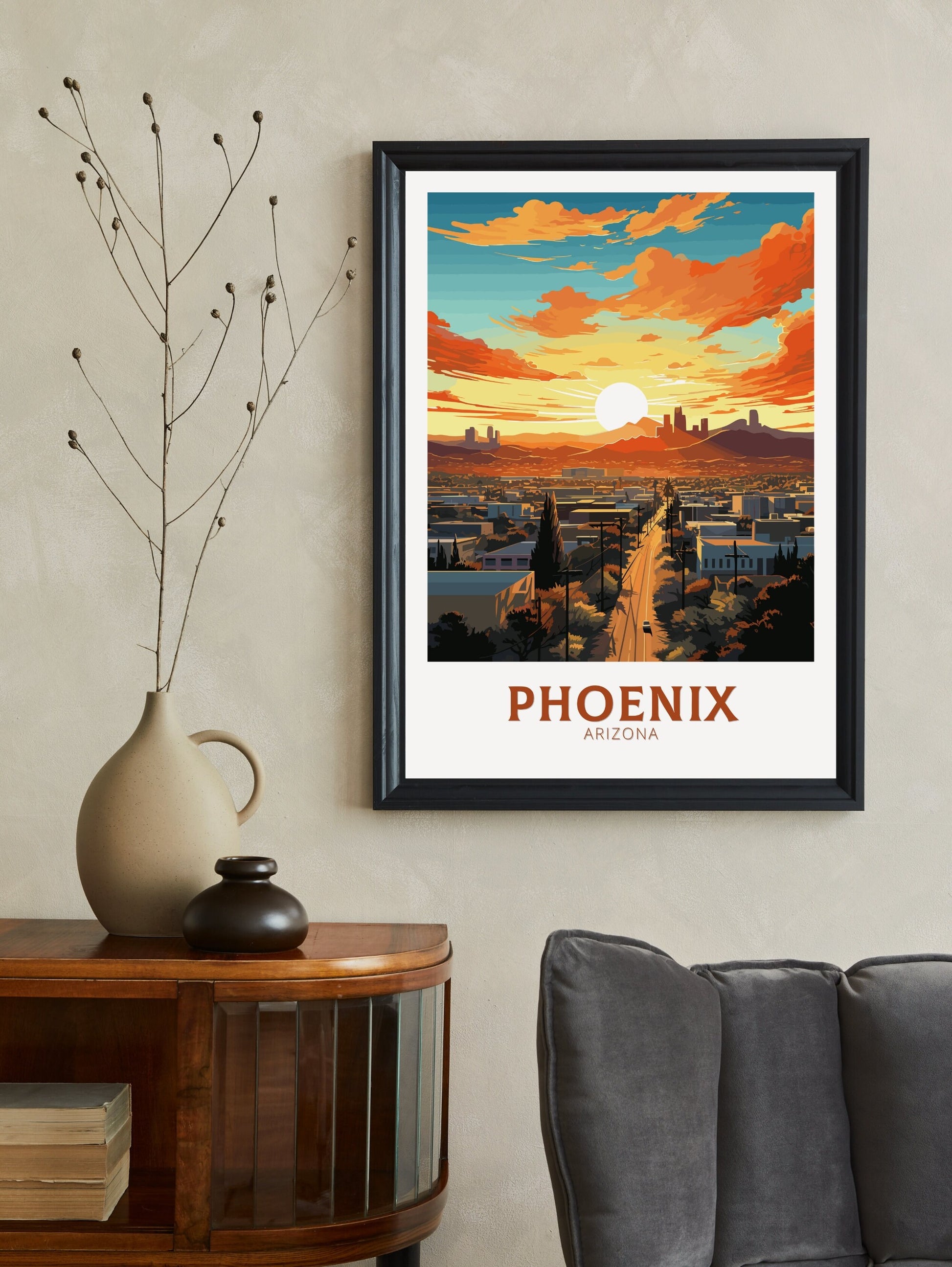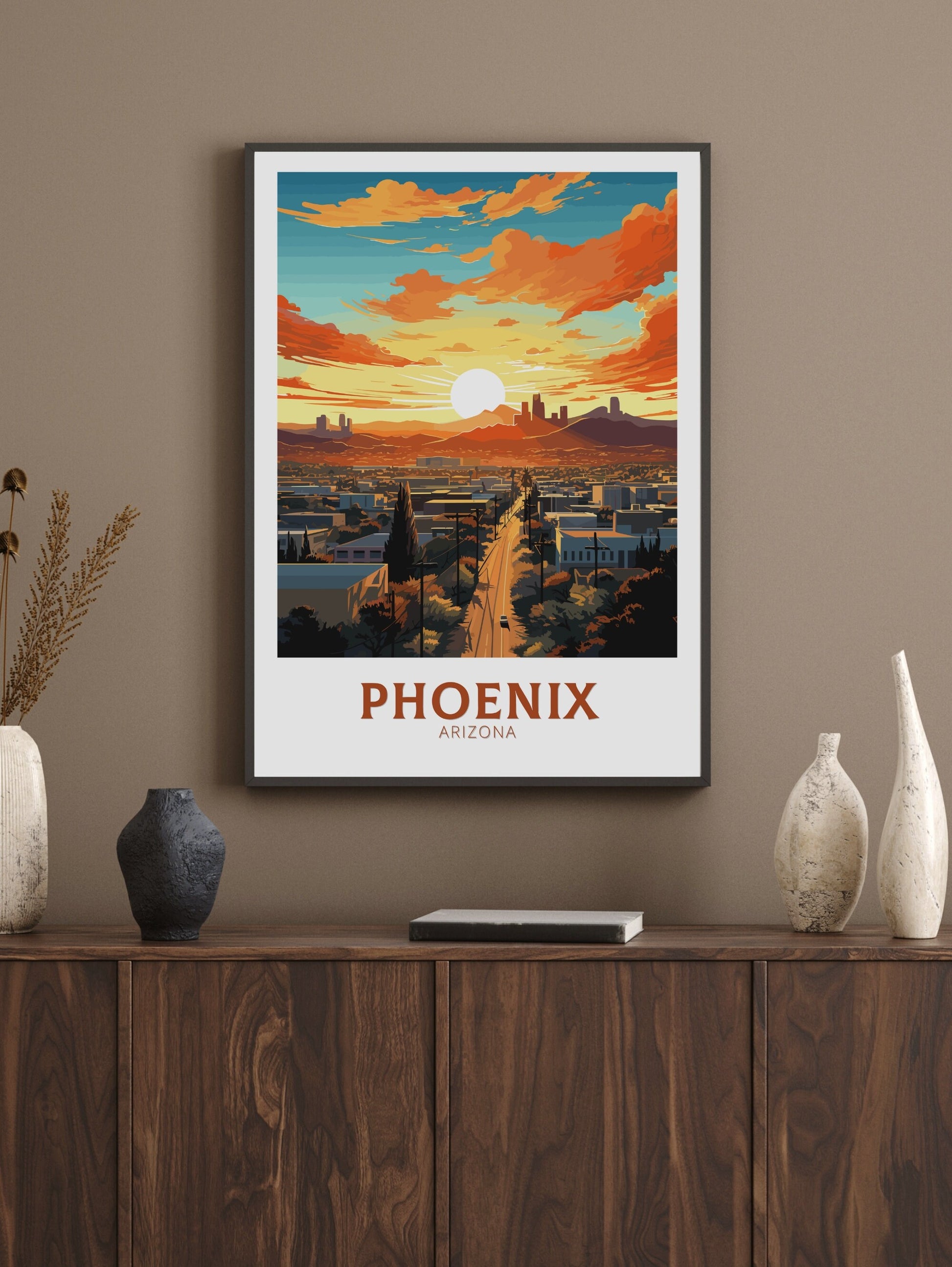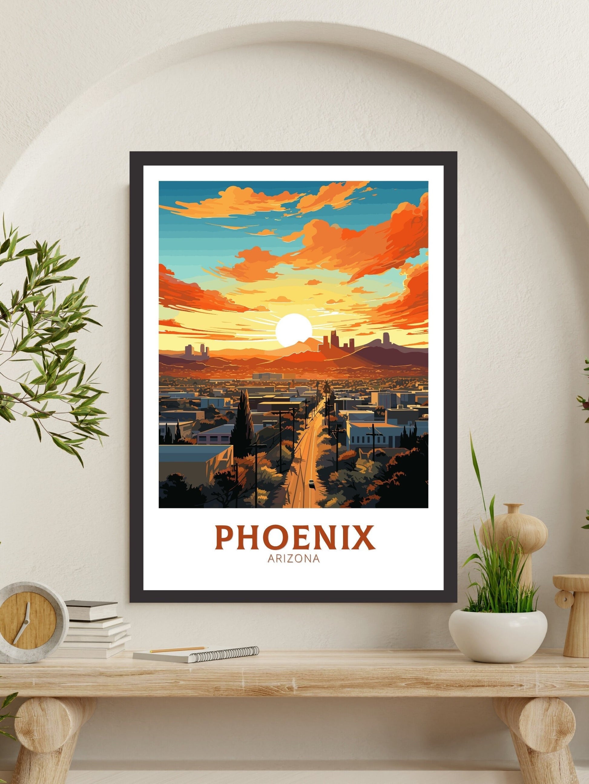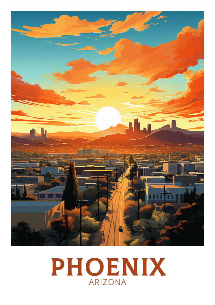 Disponible en téléchargement numérique et en tirage physique premium , cette affiche de voyage de Phoenix est disponible en plusieurs formats, des formats de série A aux grands formats 76 x 102 cm. Ses couleurs vives et son design détaillé en font un ajout attrayant à votre maison, bureau ou mur de galerie, et un cadeau idéal pour les admirateurs du charme unique de l'Arizona.