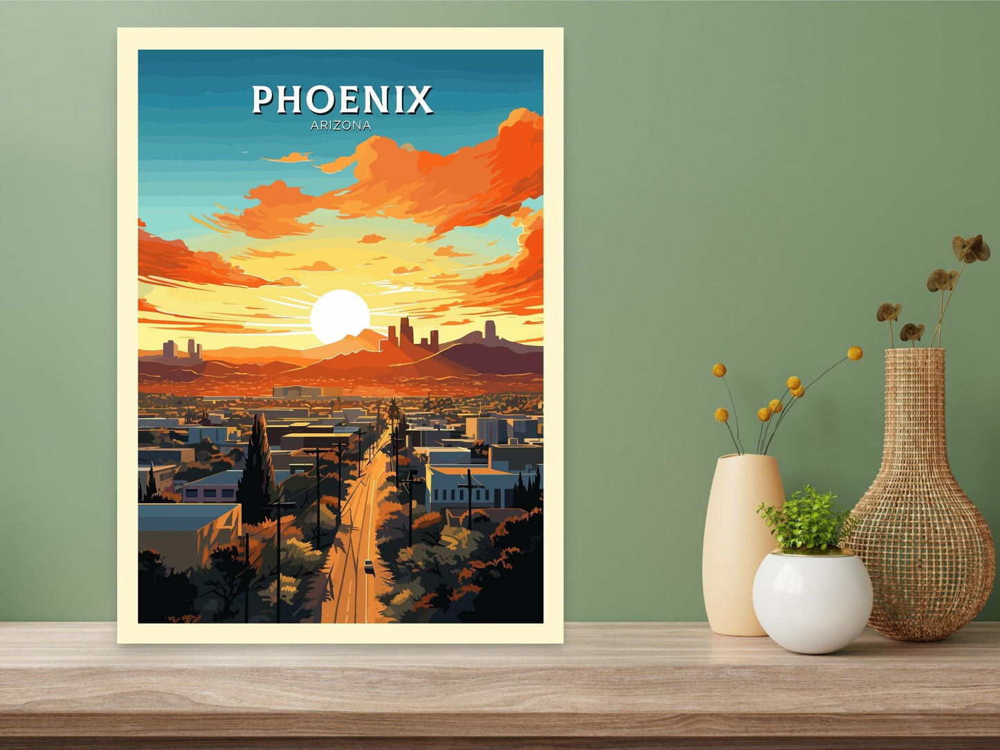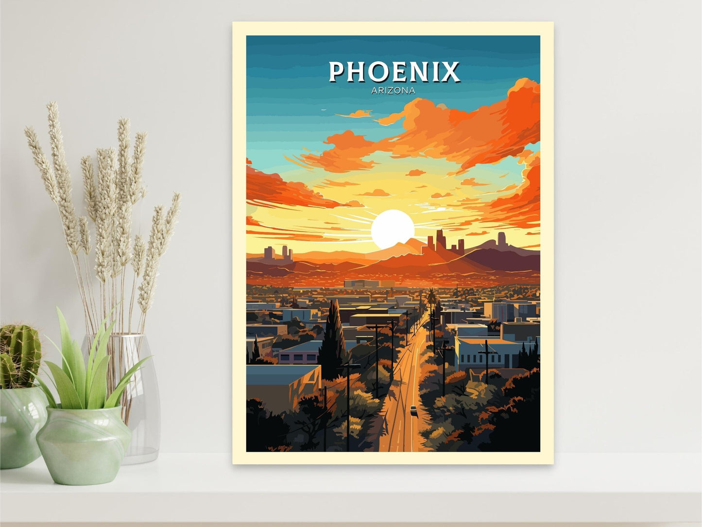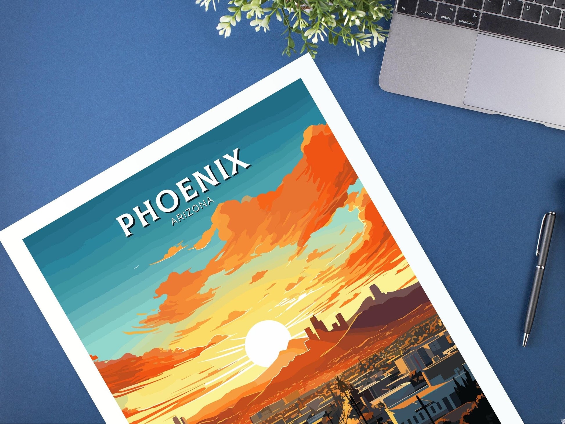 Disponible en téléchargement numérique et en tirage physique premium , cette affiche de voyage de Phoenix est disponible en plusieurs formats, des formats de série A aux grands formats 76 x 102 cm. Ses couleurs vives et ses détails raffinés en font un ajout remarquable à votre maison, bureau ou mur de galerie, et un cadeau attentionné pour les admirateurs de Phoenix et du Sud-Ouest.
