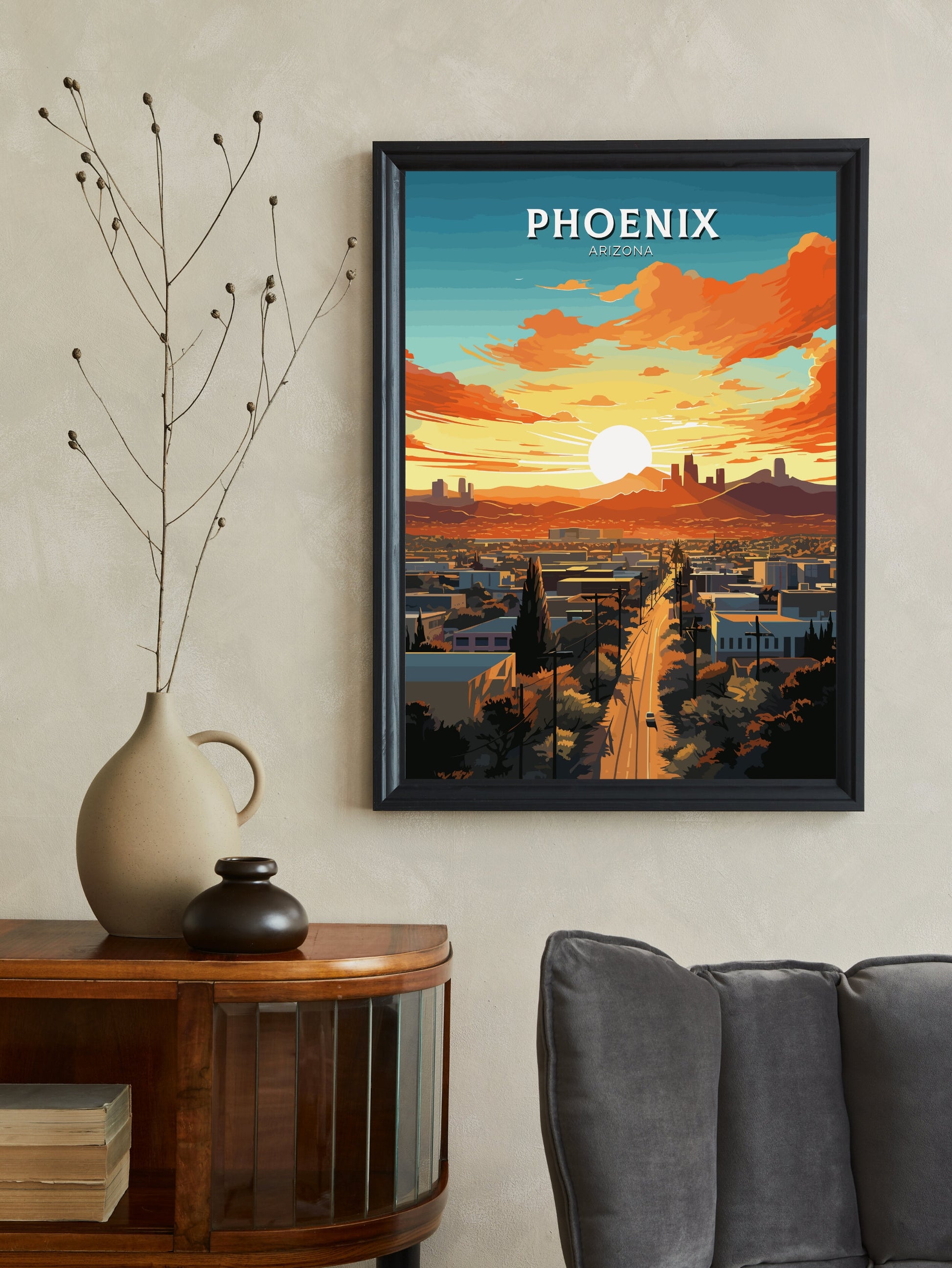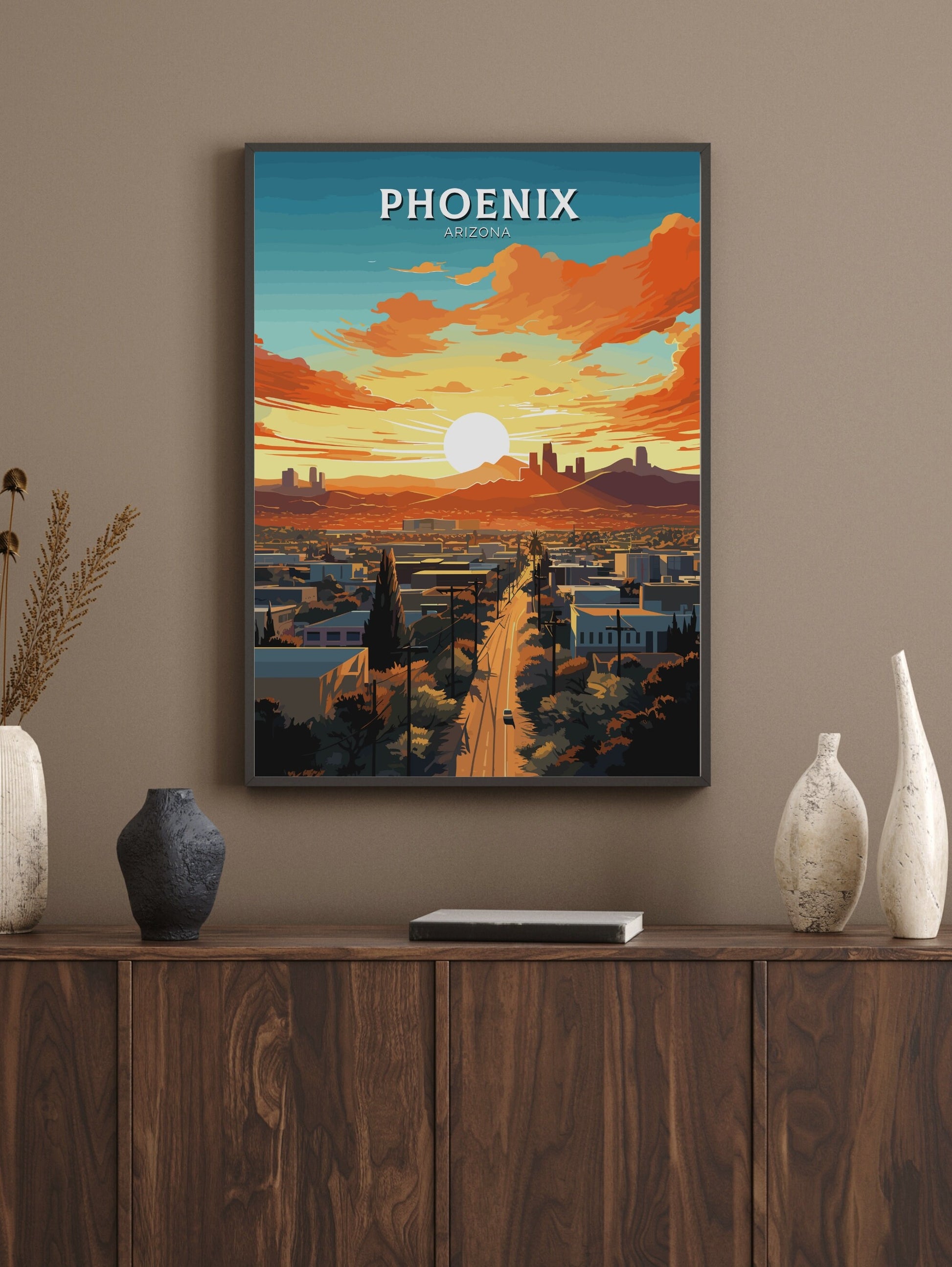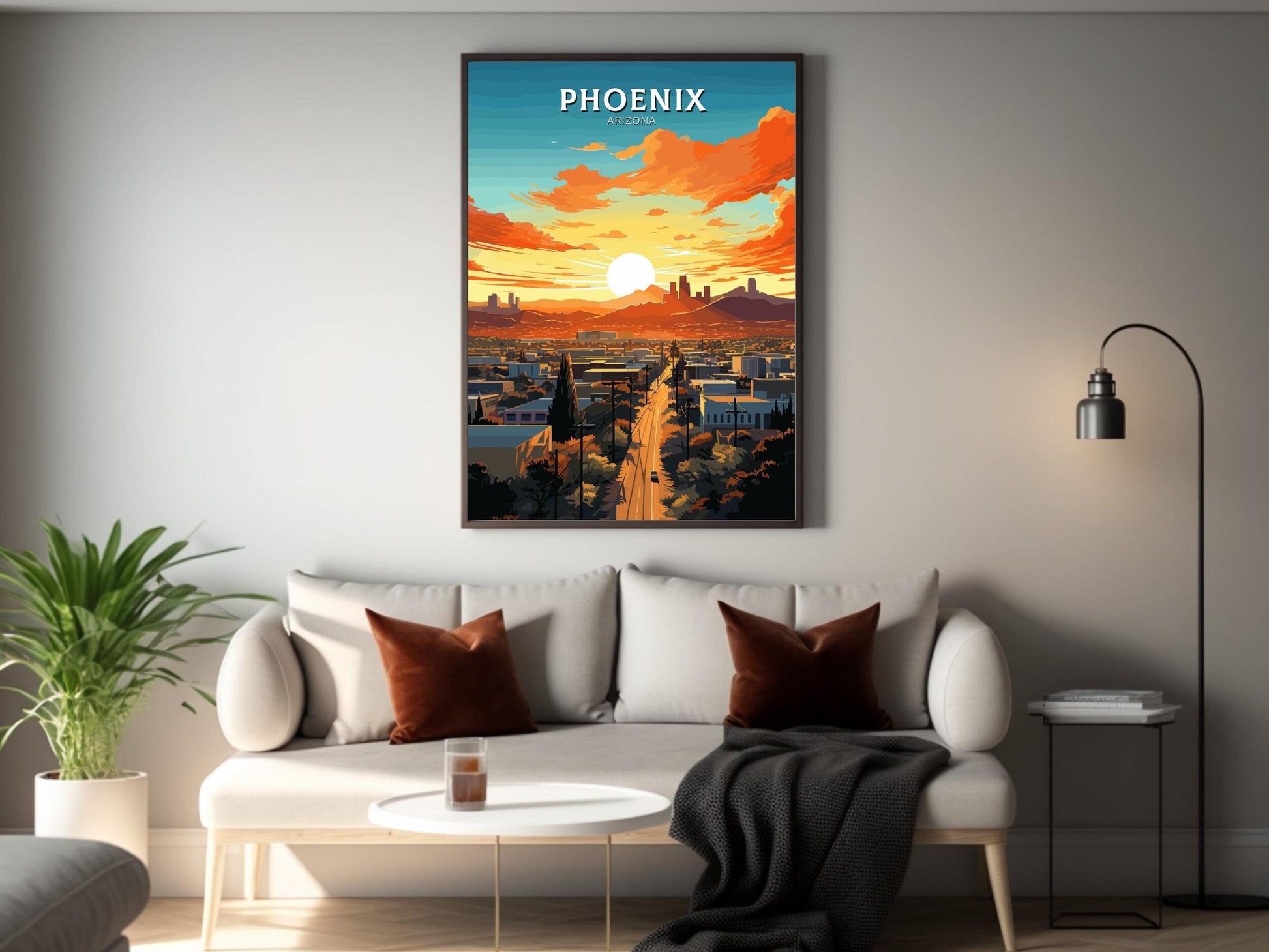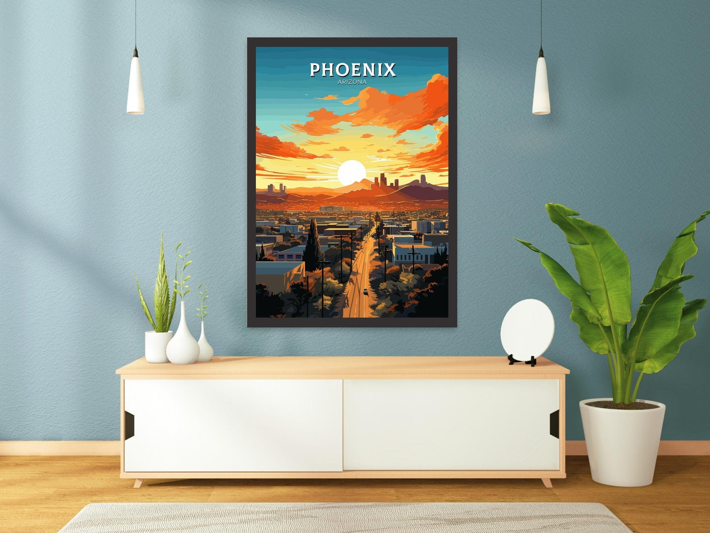 Disponible en téléchargement numérique et en tirage physique premium , cette affiche de voyage de Phoenix est disponible en plusieurs formats, des formats de série A aux grands formats 76 x 102 cm. Ses couleurs vives et ses détails raffinés en font un ajout remarquable à votre maison, bureau ou mur de galerie, et un cadeau attentionné pour les admirateurs de Phoenix et du Sud-Ouest.