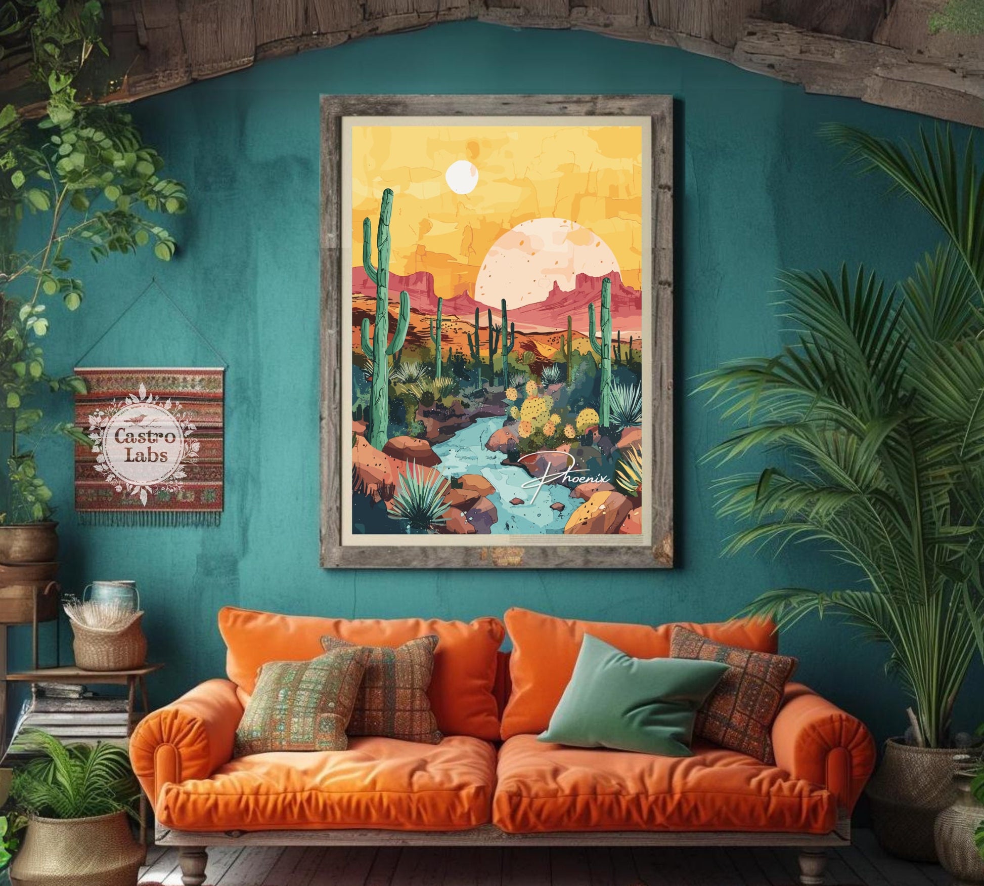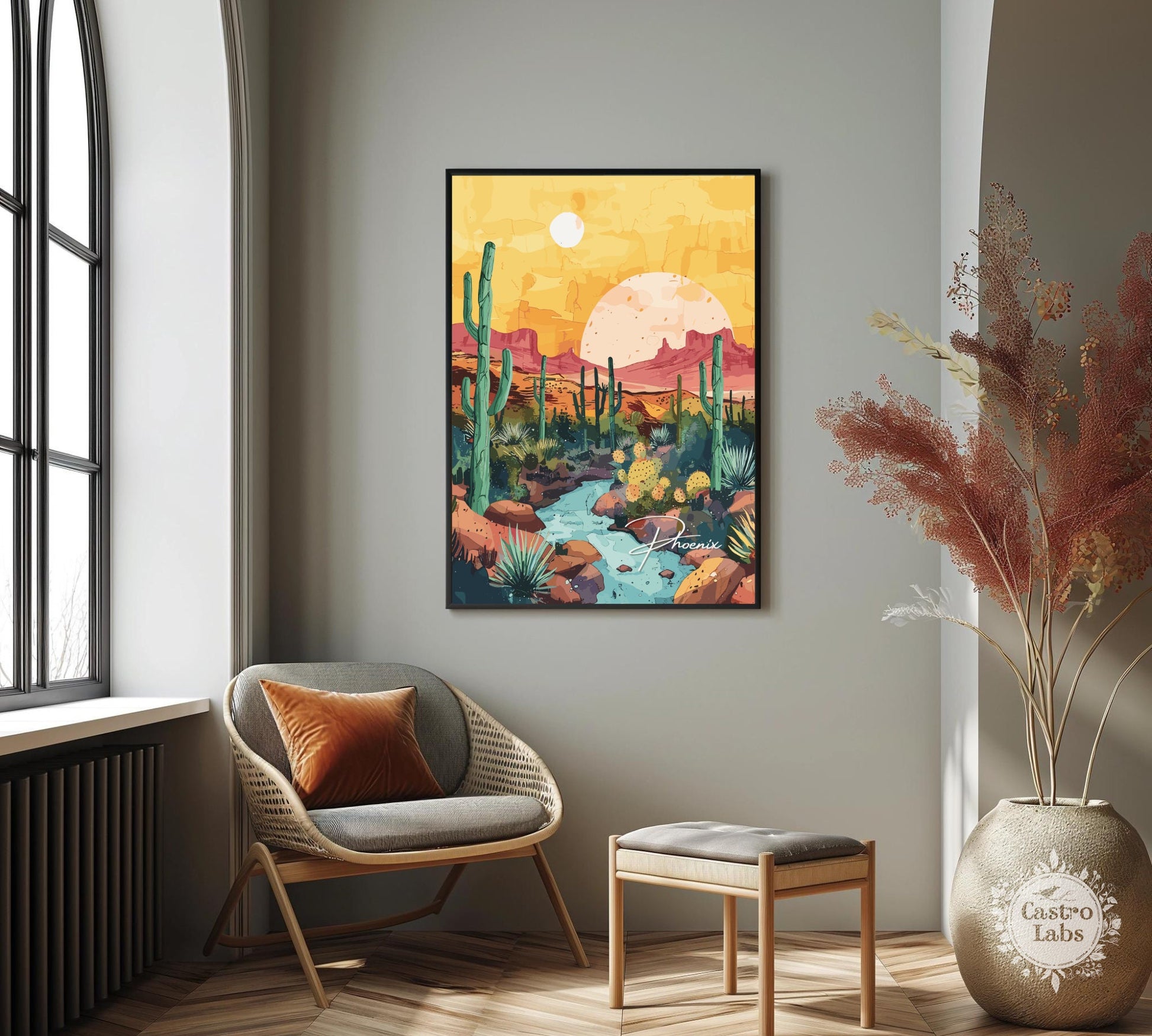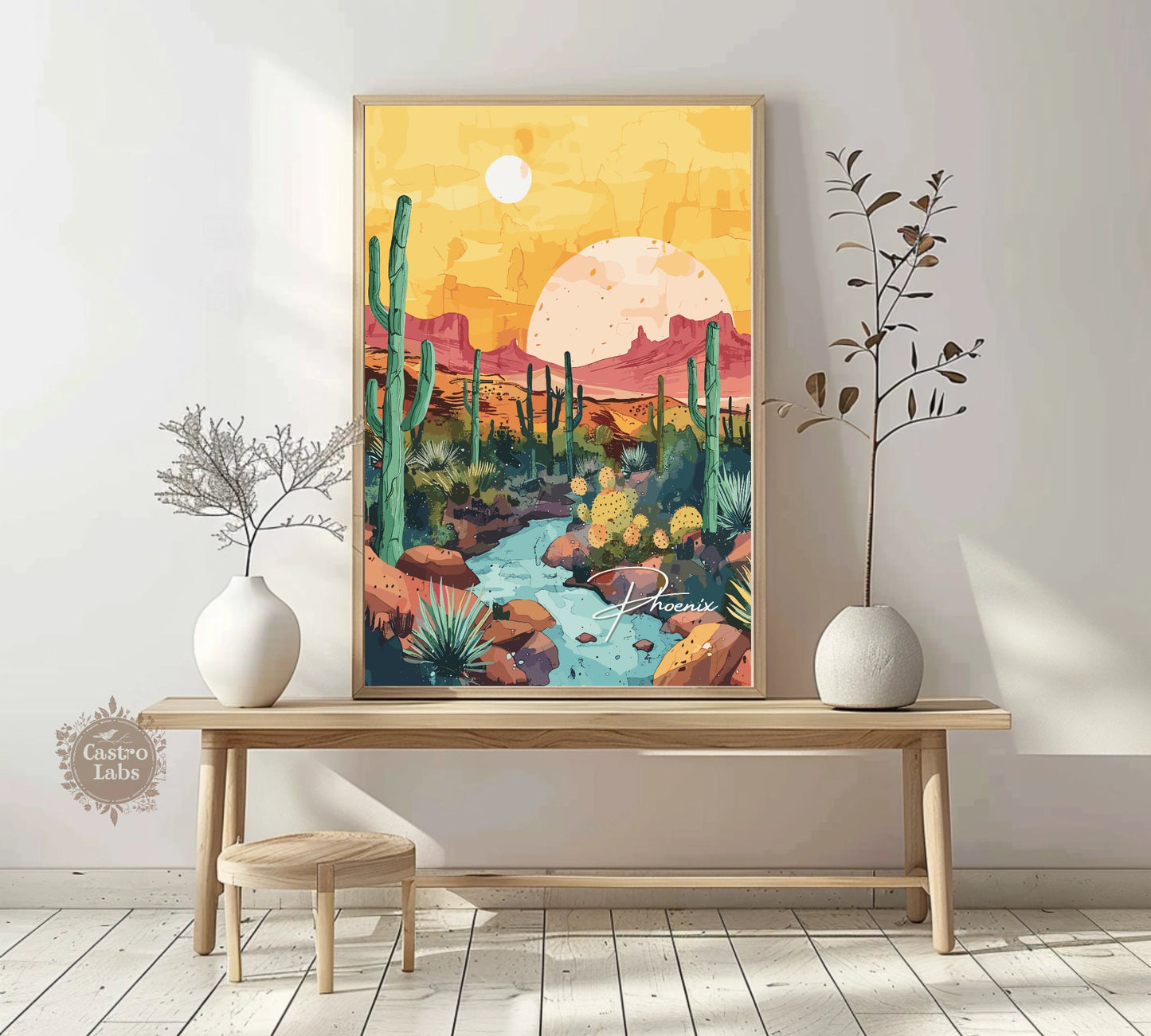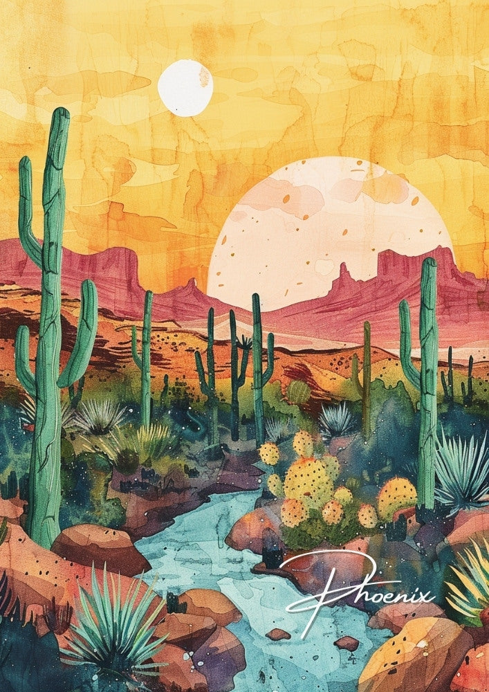 Disponible en téléchargement numérique et en tirage physique premium , cette affiche de voyage aquarelle de Phoenix est disponible en plusieurs formats, des formats de série A aux grands formats 76 x 102 cm. Ses tons aquarelle délicats et ses détails raffinés en font un ajout remarquable à votre maison, bureau ou mur de galerie, et un cadeau idéal pour les admirateurs de Phoenix et du Sud-Ouest.