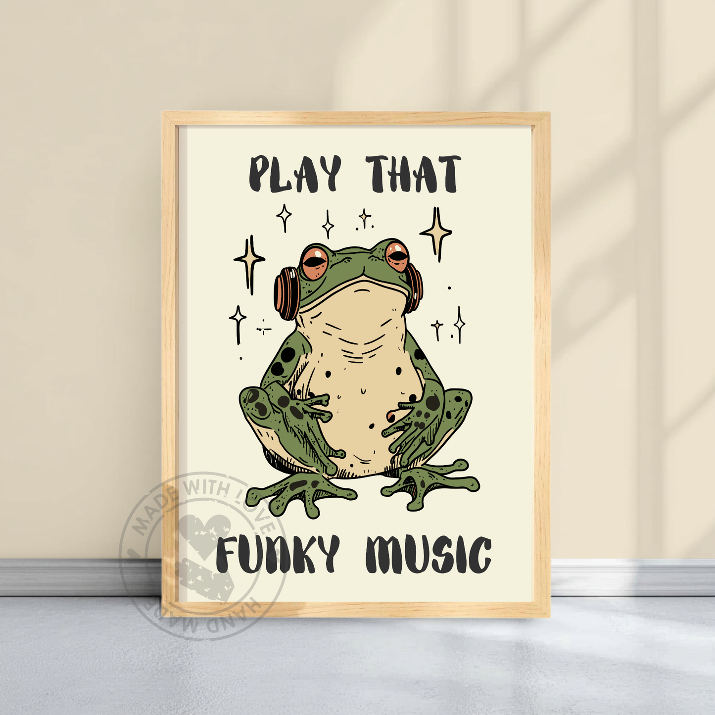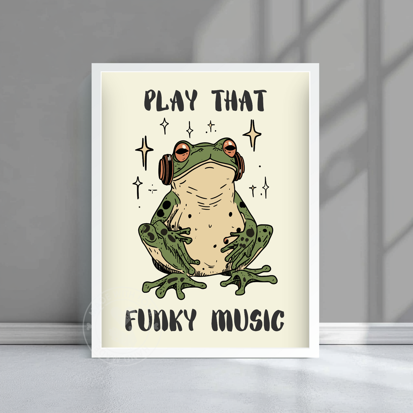 Cette affiche « Play That Funky Music » met en scène une grenouille décontractée avec un casque audio, dansant au rythme. On y voit un hipster vert qui vibre, les jambes croisées, absorbé par des mélodies funky.