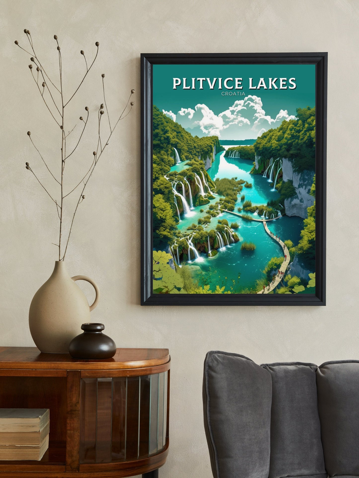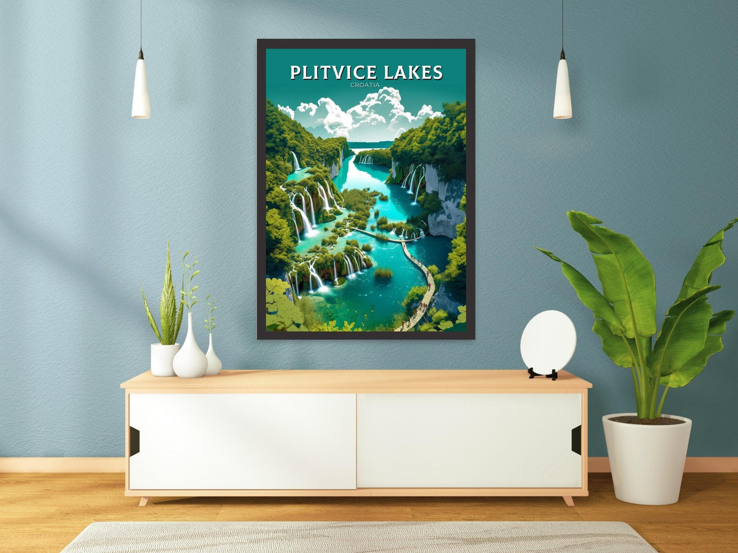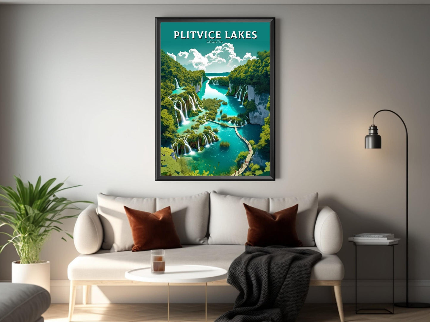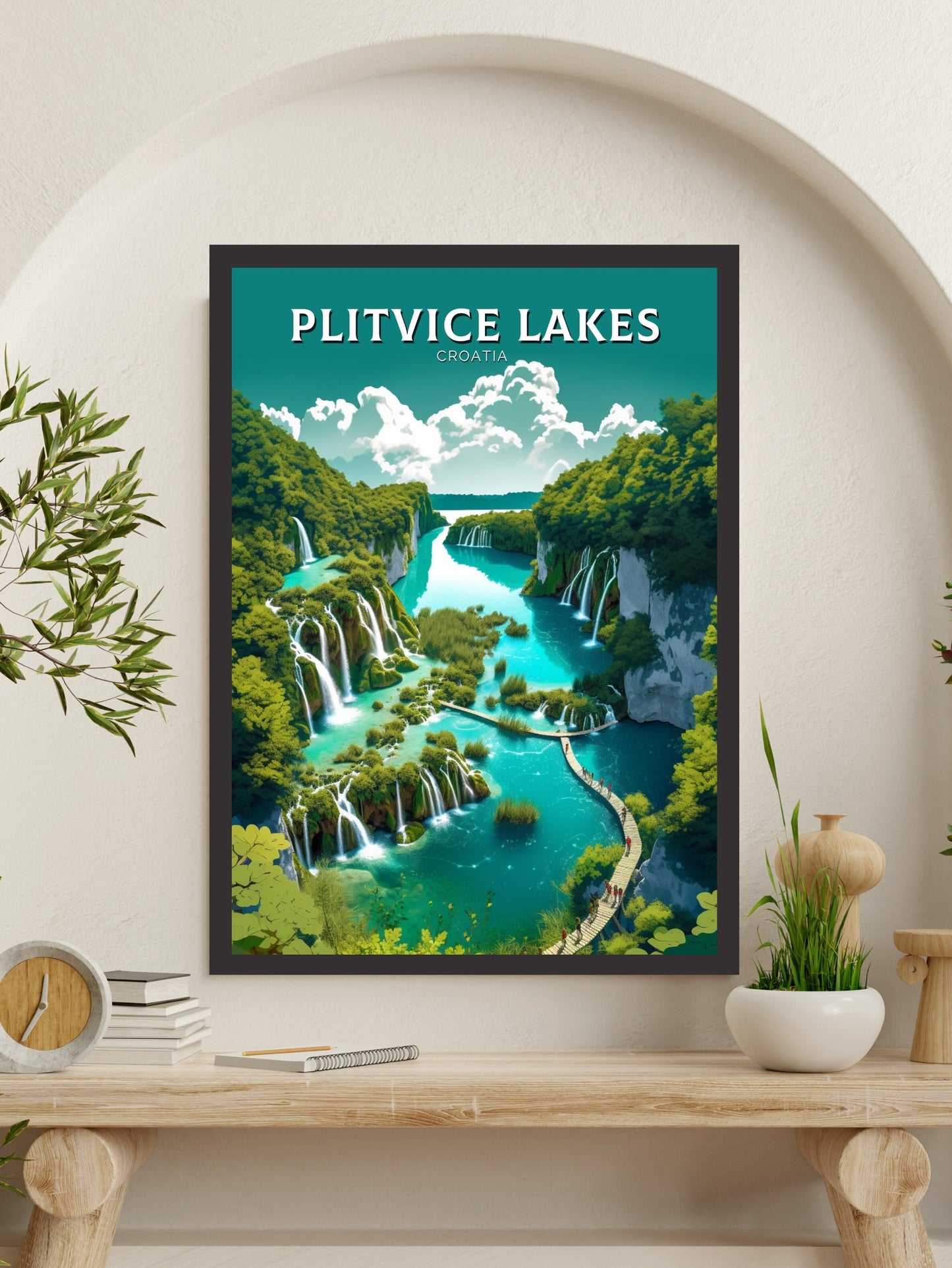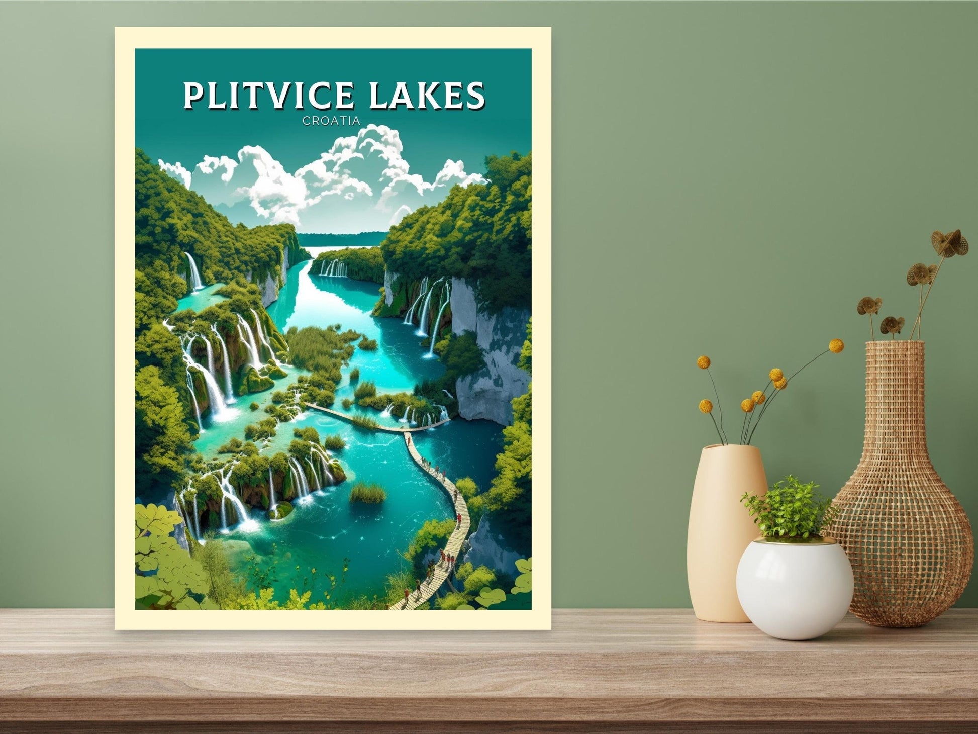 Intégrez la magie sereine du parc national le plus emblématique de Croatie à votre intérieur grâce à cette affiche de voyage des lacs de Plitvice . Connue pour ses cascades, ses lacs turquoise aux eaux cristallines et ses passerelles en bois serpentant à travers des forêts denses, Plitvice est une véritable merveille naturelle. Cette affiche capture la beauté complexe du parc dans un design riche et stylisé qui évoque une évasion paisible au cœur d'une nature intacte.