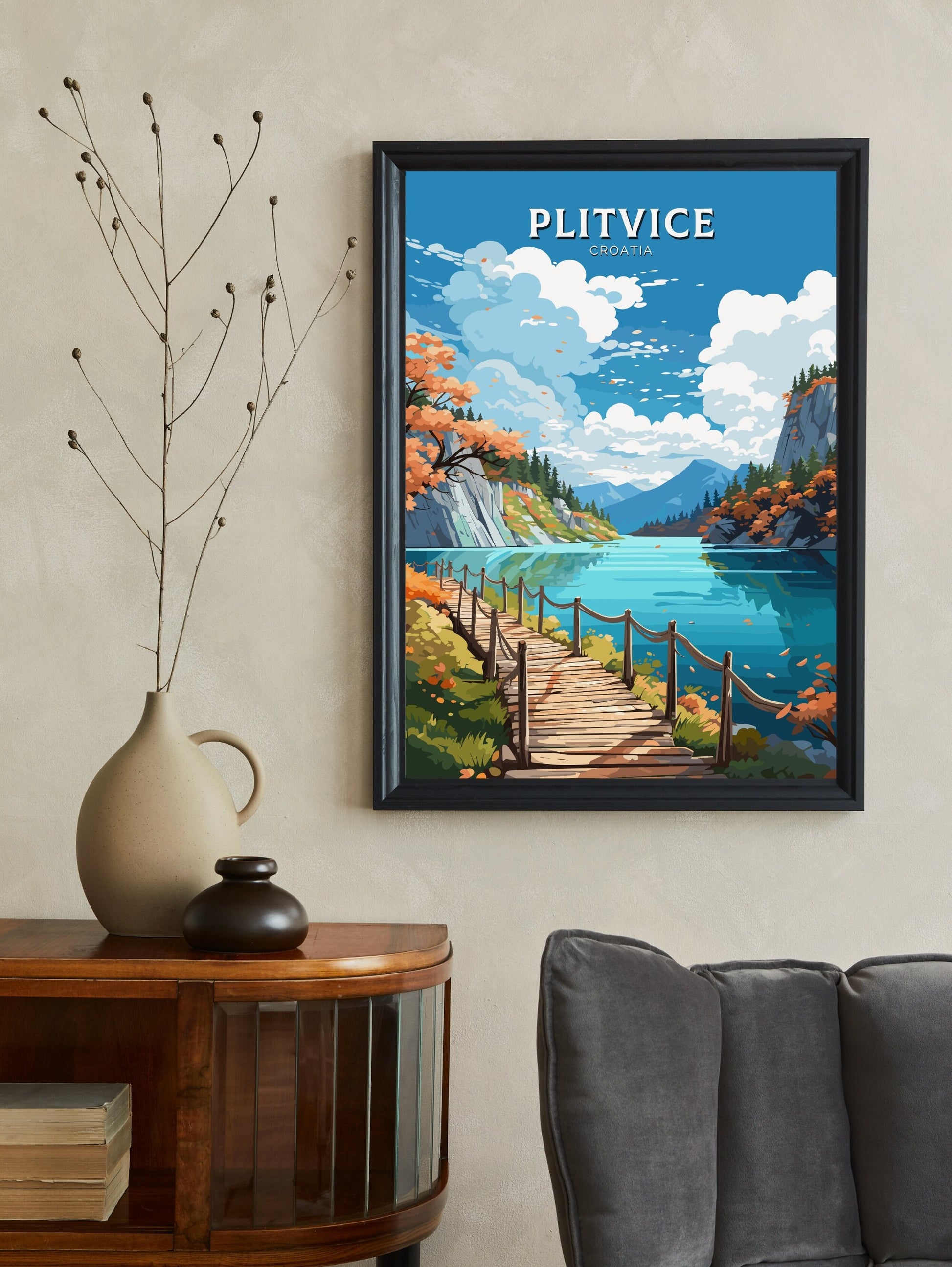 Imprimée sur du papier d'archive de qualité supérieure, cette affiche de voyage de Plitvice est disponible en plusieurs formats pour s'adapter parfaitement à votre espace. Son design intemporel et sa palette apaisante en font un choix idéal pour les bureaux, les coins lecture ou les salons. Laissez l'esprit des eaux vives et des forêts luxuriantes de Plitvice imprégner vos murs.