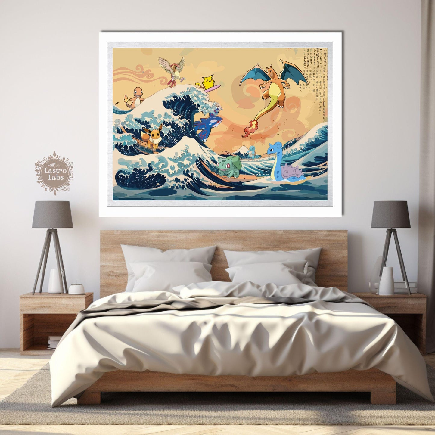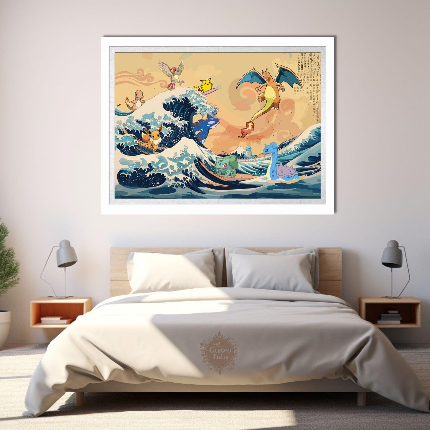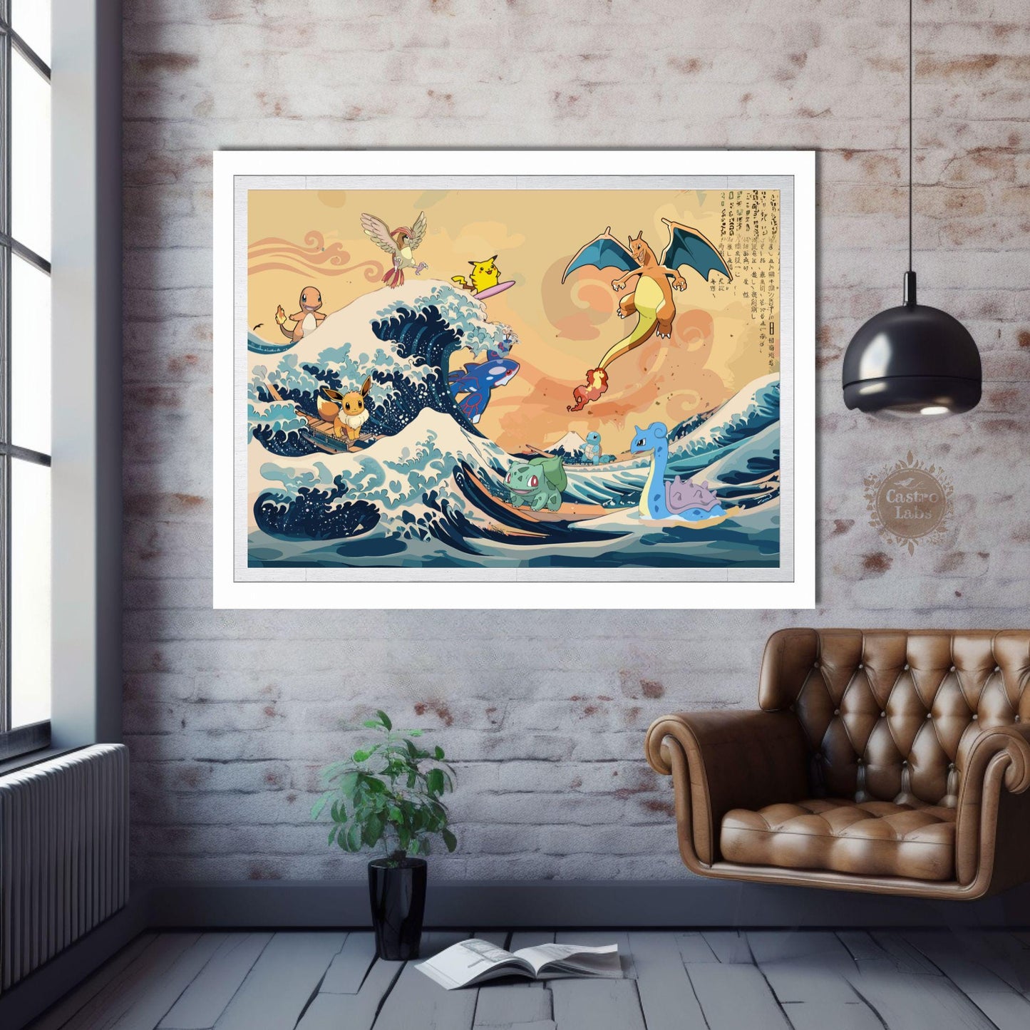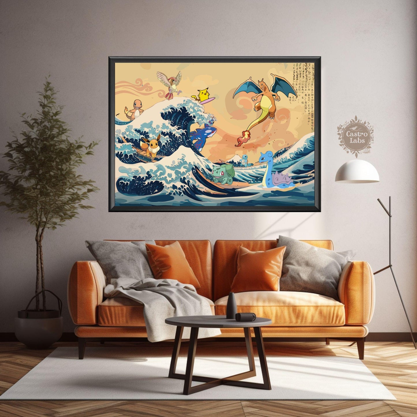 Découvrez la fusion de l'art japonais classique et de Pokémon avec cette affiche Pokémon sur la Grande Vague de Kanagawa . Inspirée du chef-d'œuvre emblématique d'Hokusai, cette affiche met en scène des Pokémon adorés chevauchant les vagues spectaculaires, créant un mélange saisissant de style ukiyo-e traditionnel et de charme moderne des animes. Idéale pour les chambres, les salons ou les espaces de jeux, elle apporte une touche artistique unique à toute décoration sur le thème Pokémon.