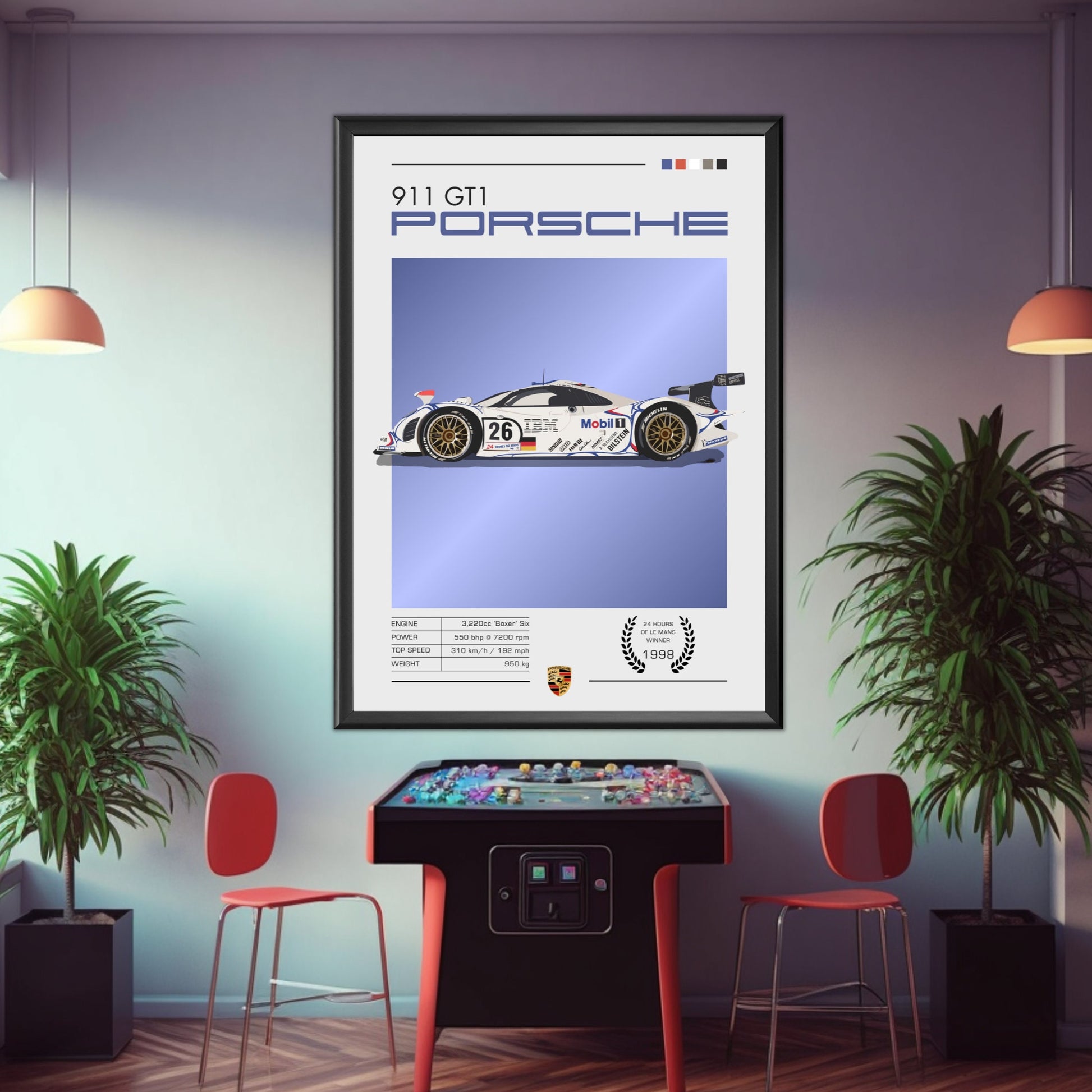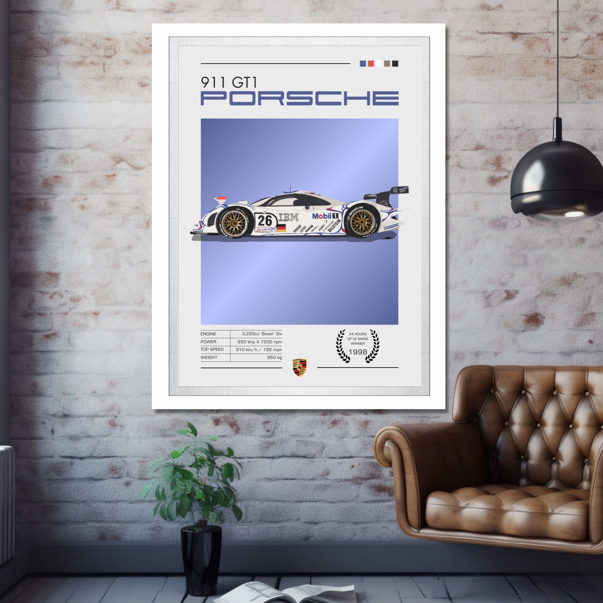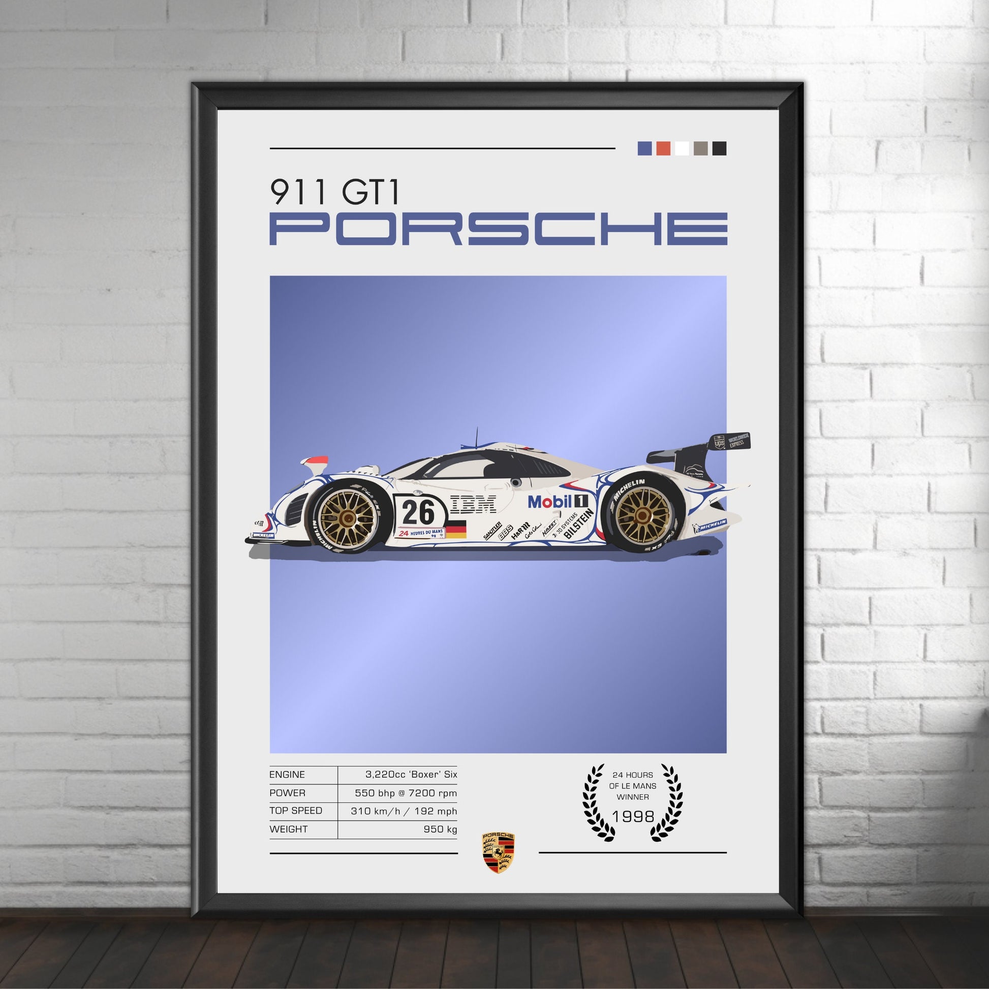 Célébrez la légendaire Porsche 911 GT1 avec l' affiche Porsche 911 GT1 – Décoration murale emblématique des 24 Heures du Mans . Célèbre pour sa domination en endurance à la fin des années 1990, la 911 GT1 incarne la maîtrise technique de Porsche, ses victoires au Mans et son héritage en sport automobile . Ce poster est idéal pour les passionnés de course, les fans de Porsche et les collectionneurs d'art automobile haute performance .