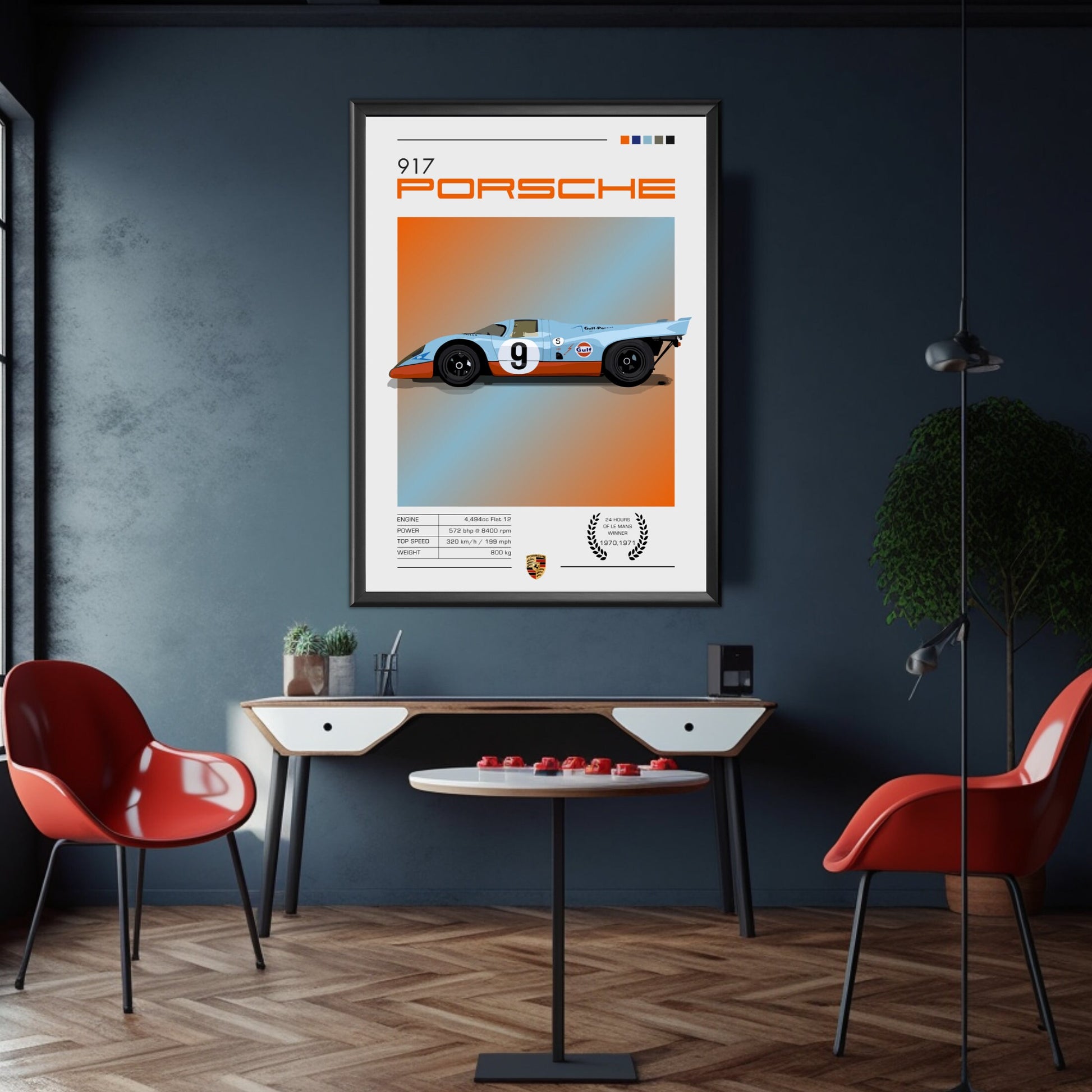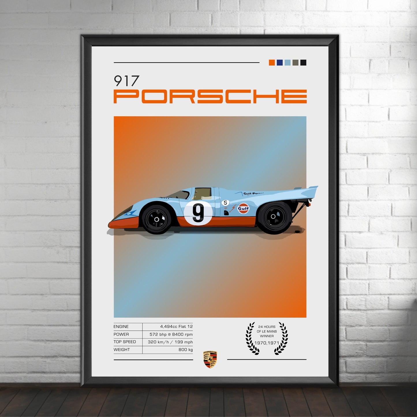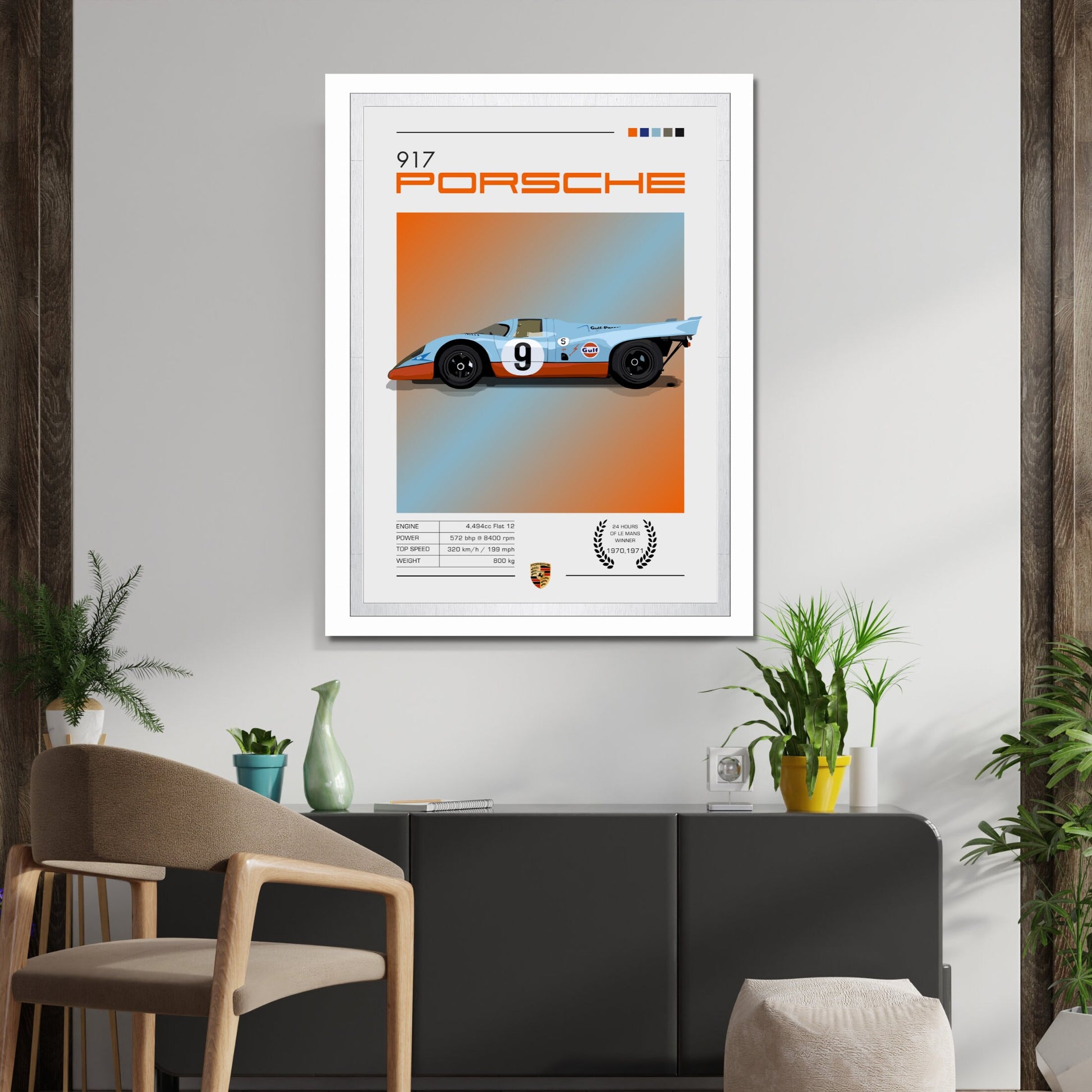 Plus qu'une simple décoration murale, l' affiche Porsche 917 rend hommage à l'héritage de Porsche au Mans. Cadeau idéal pour les collectionneurs de voitures, les passionnés de sport automobile et d'endurance , elle transforme n'importe quel mur en une galerie d'histoire de la course.