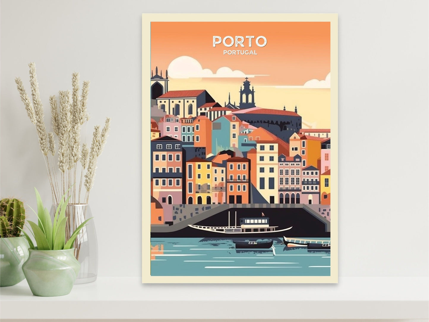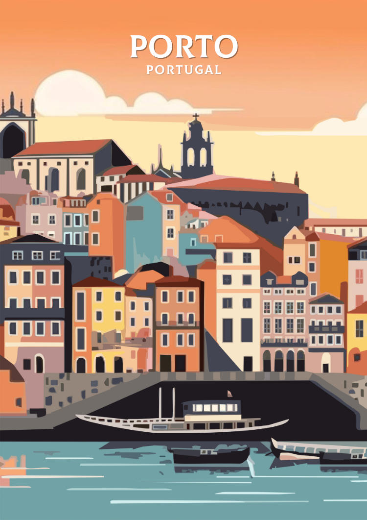 Mettant en scène des éléments clés tels que les immeubles animés du quartier de Ribeira, les arches vertigineuses du pont Dom Luís Ier et les traditionnels rabelos qui transportaient autrefois les barriques de porto sur le Douro, cette illustration donne vie à l'essence même de Porto avec une touche chaleureuse et artistique. La palette de couleurs à la fois douces et riches renforce l'atmosphère nostalgique, invitant le spectateur à imaginer la ville telle qu'elle aurait pu être à une époque révolue, pleine de charme et d'aventure.