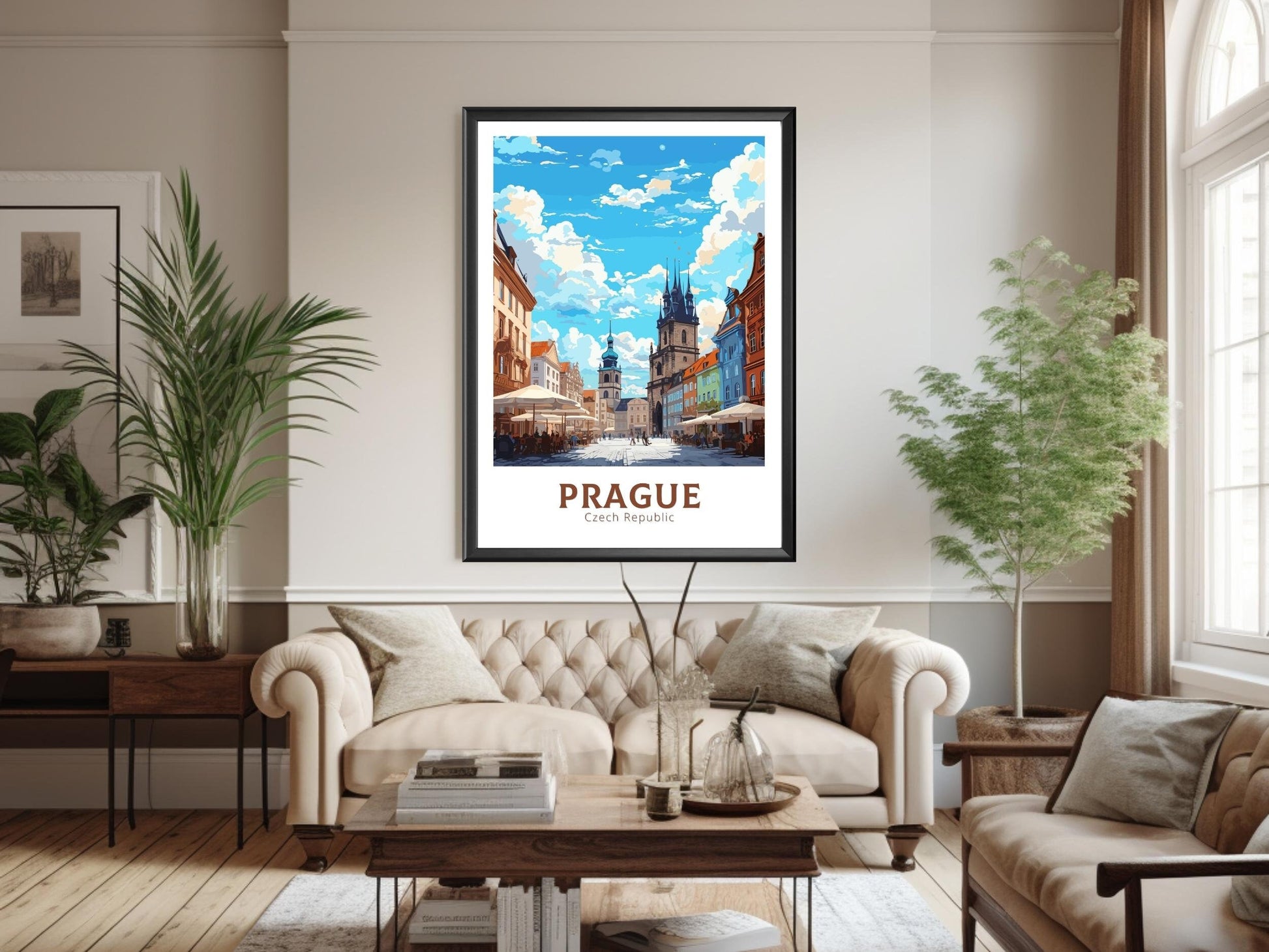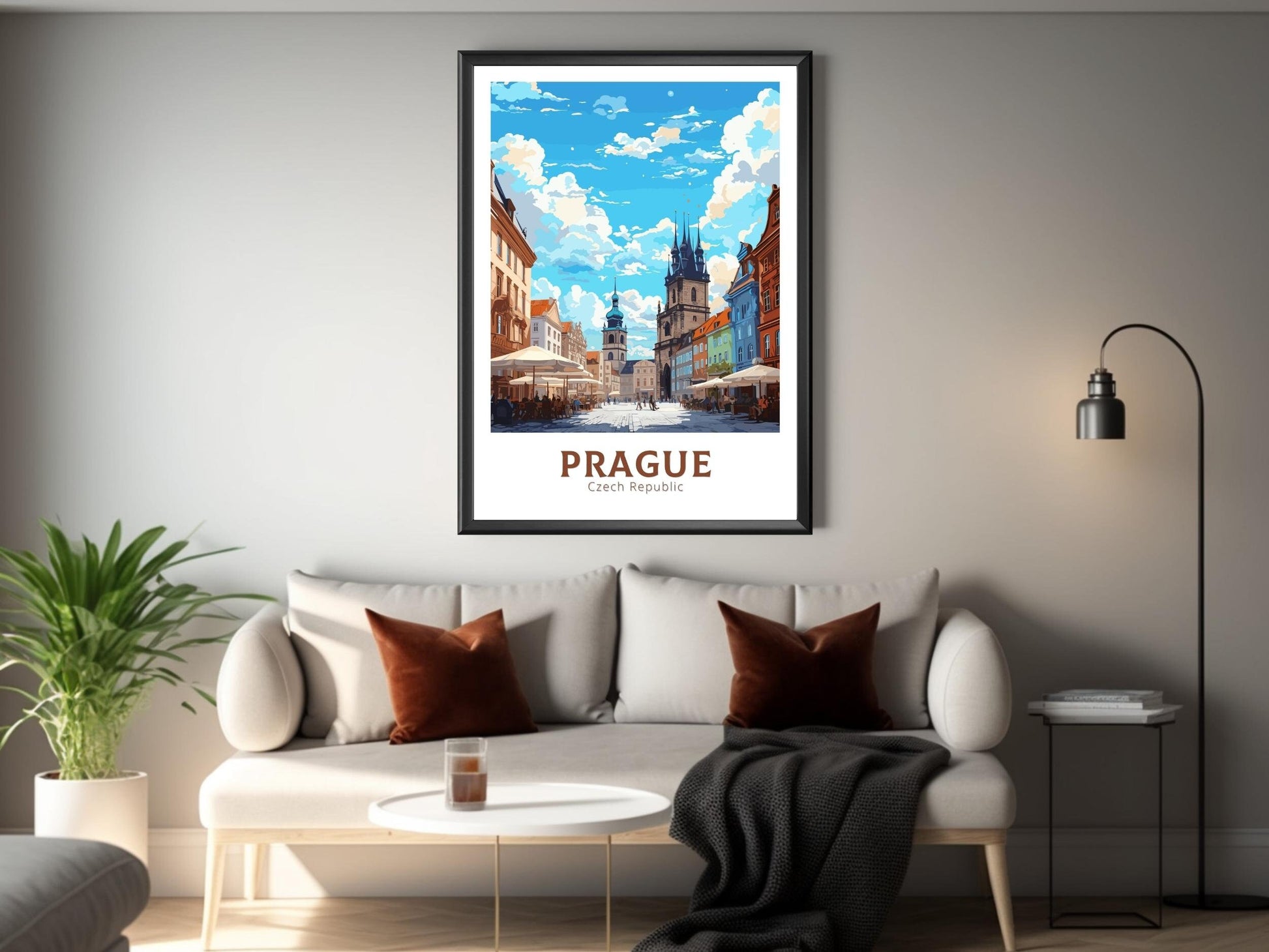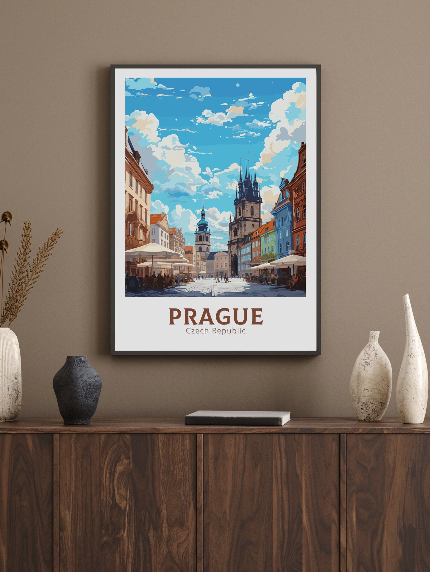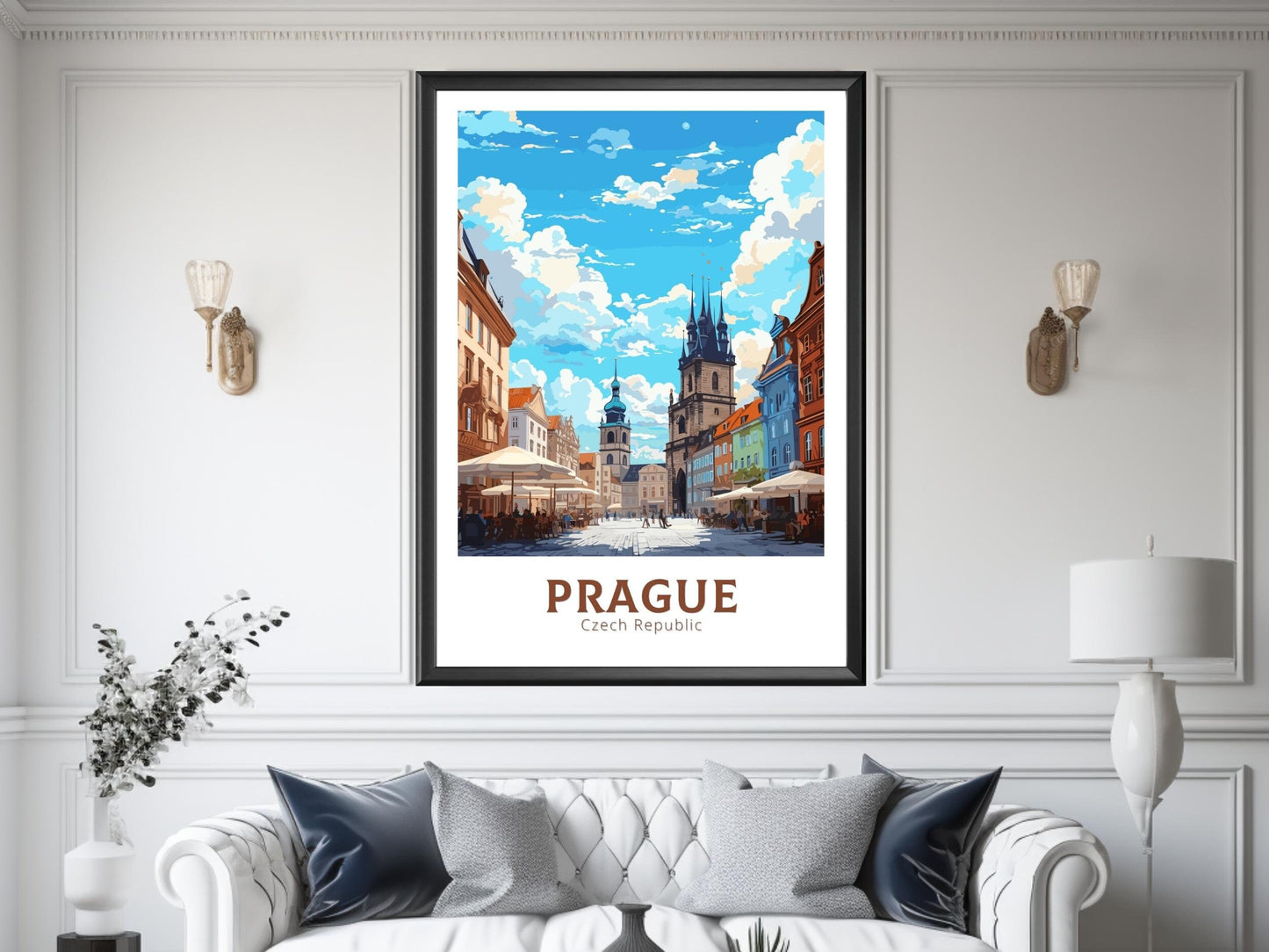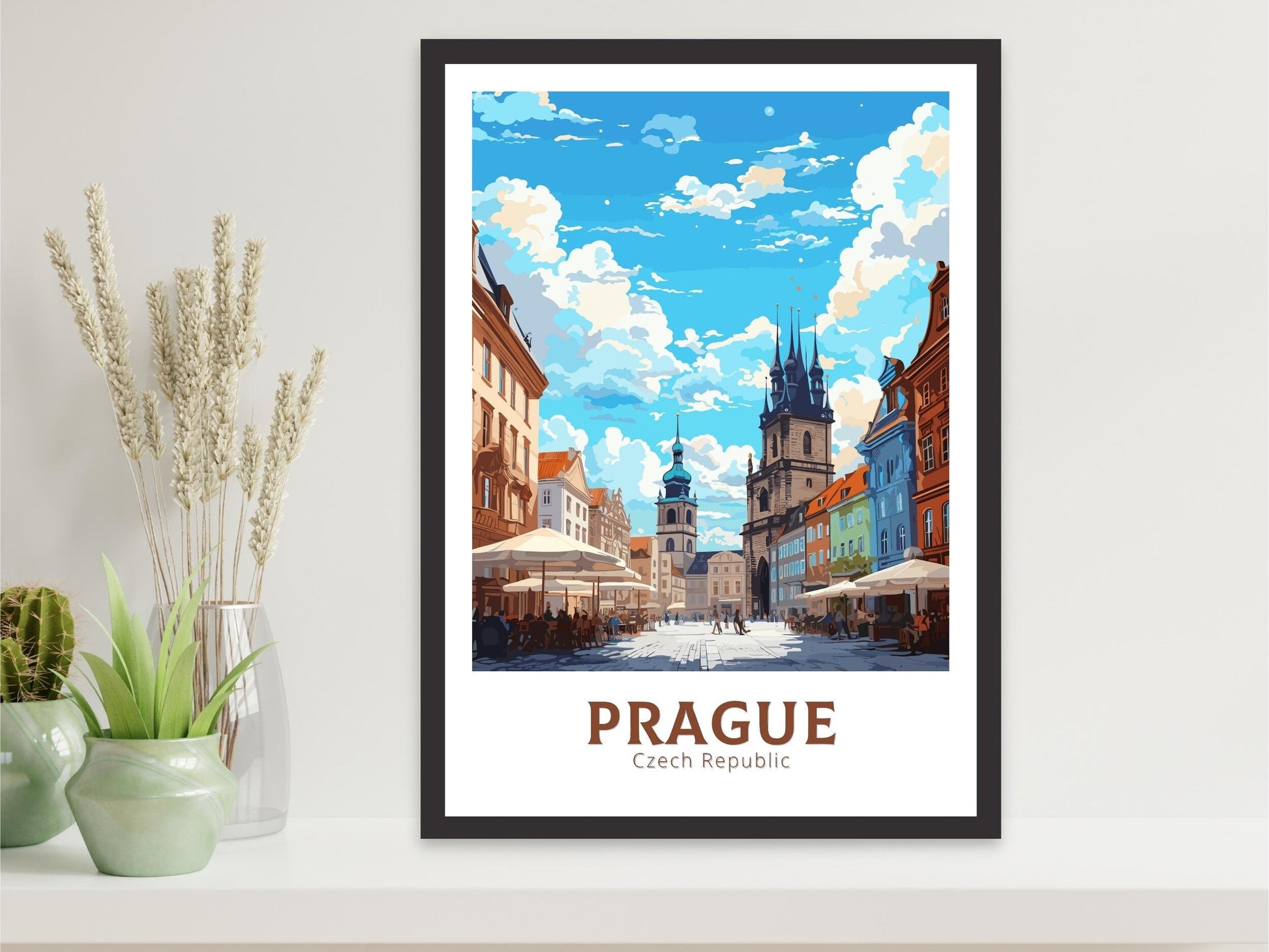 Plus qu'un simple souvenir de voyage, cette affiche célèbre le cœur culturel de Prague, un lieu où l'histoire côtoie la vie contemporaine. Elle vous invite à revivre vos flâneries dans les rues sinueuses, à savourer la cuisine tchèque traditionnelle en terrasse ou simplement à vous imprégner de l'atmosphère d'une ville qui allie parfaitement tradition et innovation. Cette œuvre est idéale pour les amateurs d'art, les passionnés d'histoire ou tous ceux qui souhaitent apporter une touche d'élégance européenne à leur intérieur.
