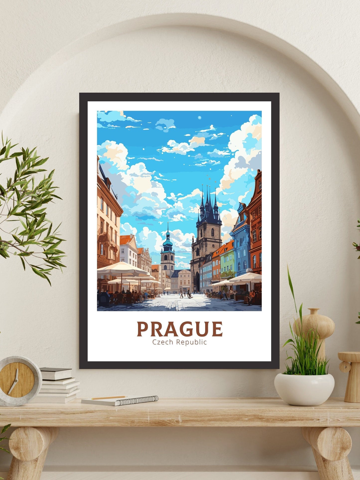 Le style artistique de l'affiche allie avec brio couleurs vives et lignes élégantes, mettant en valeur les façades complexes de la place, ses flèches gothiques et ses statues baroques. La lumière chaude du soleil projette des ombres douces sur les pavés, évoquant une matinée paisible ou un après-midi animé dans ce centre historique. Qu'il s'agisse des détails de l'église Notre-Dame-du-Týn ou de la foule animée qui s'y presse, l'œuvre vous plonge dans le mélange unique de grandeur d'antan et de dynamisme moderne de Prague.