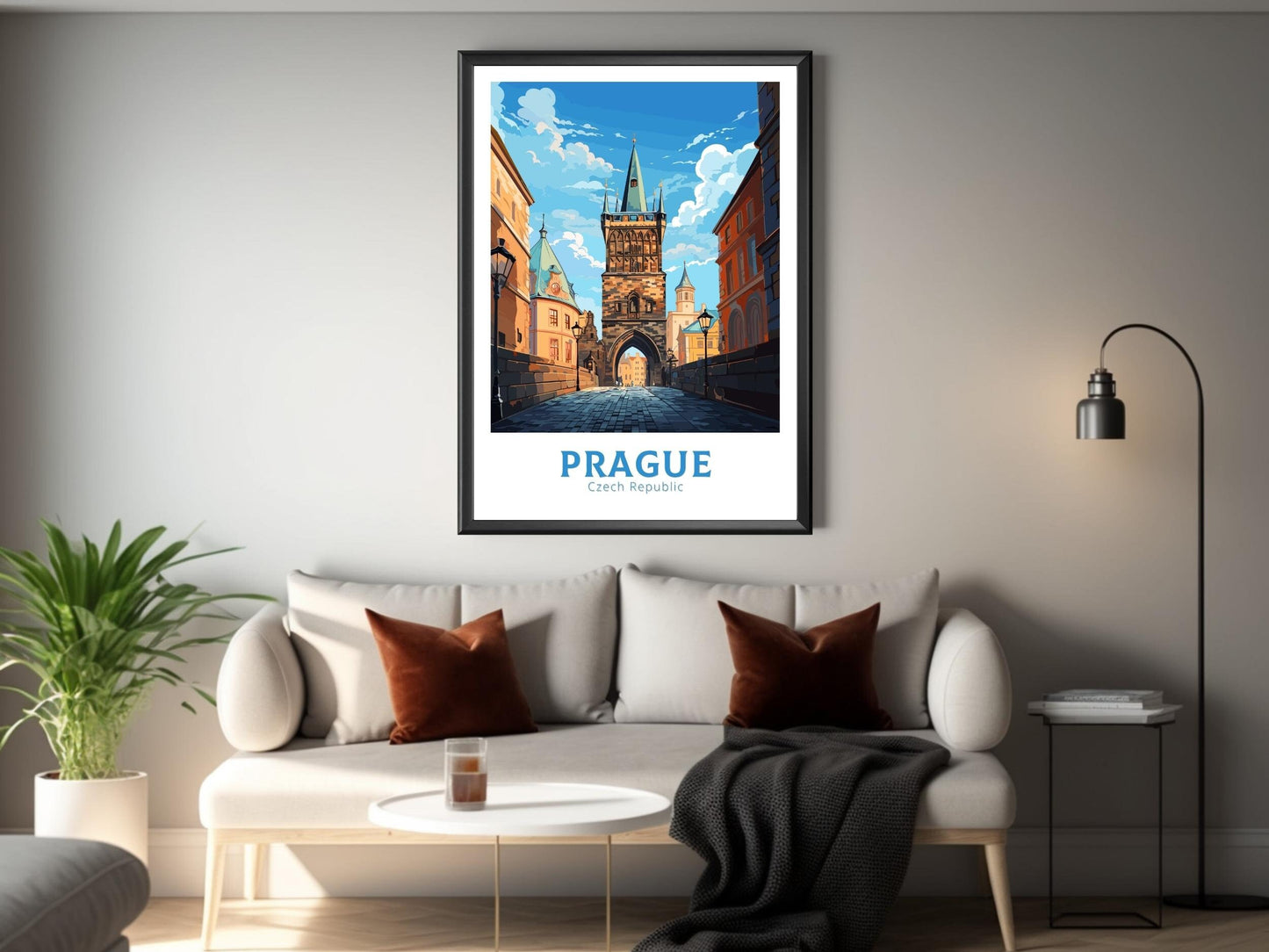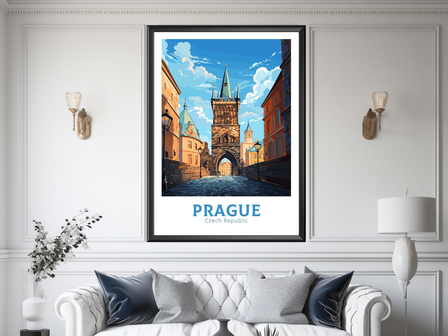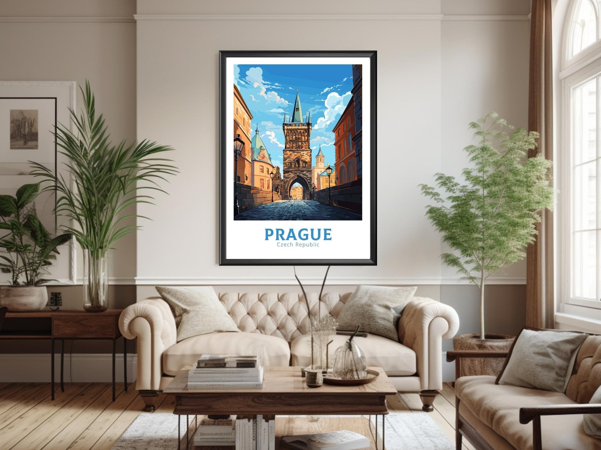 Conçue pour sublimer n'importe quelle pièce, cette décoration murale est imprimée sur des matériaux de haute qualité garantissant des couleurs éclatantes et des détails précis. Qu'elle soit exposée dans un salon chaleureux, un bureau élégant ou une galerie murale inspirée du voyage, elle crée une atmosphère à la fois sophistiquée et chaleureuse, inspirant des rêves de flânerie dans les rues historiques de Prague.