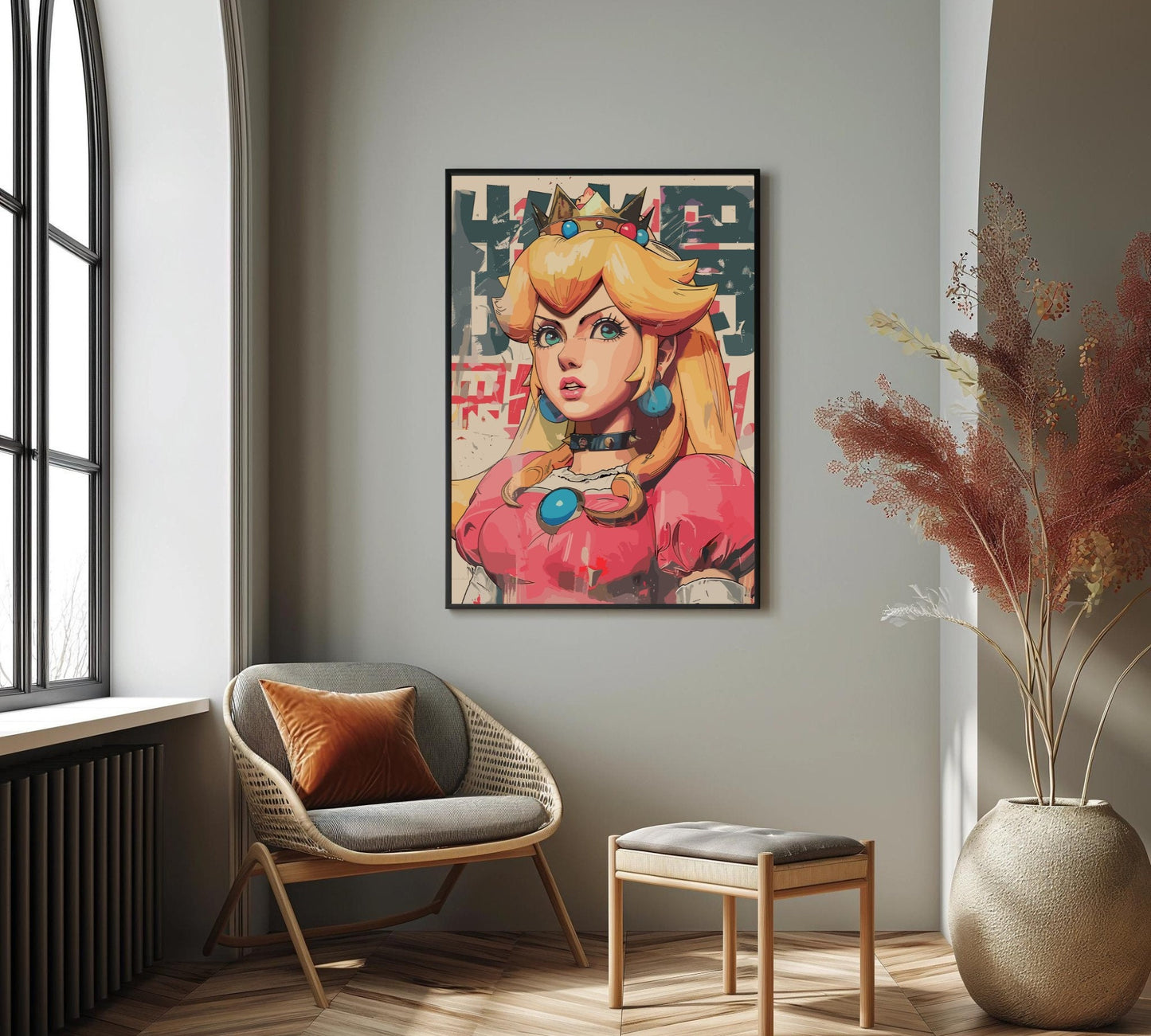 Imprimée sur un papier durable de haute qualité, l' affiche Princesse Peach offre des détails nets et des couleurs vives qui en font une pièce remarquable pour les fans de jeux vidéo rétro, d'animation japonaise et les collectionneurs. Exposez-la seule ou dans une galerie murale pour un impact visuel maximal.