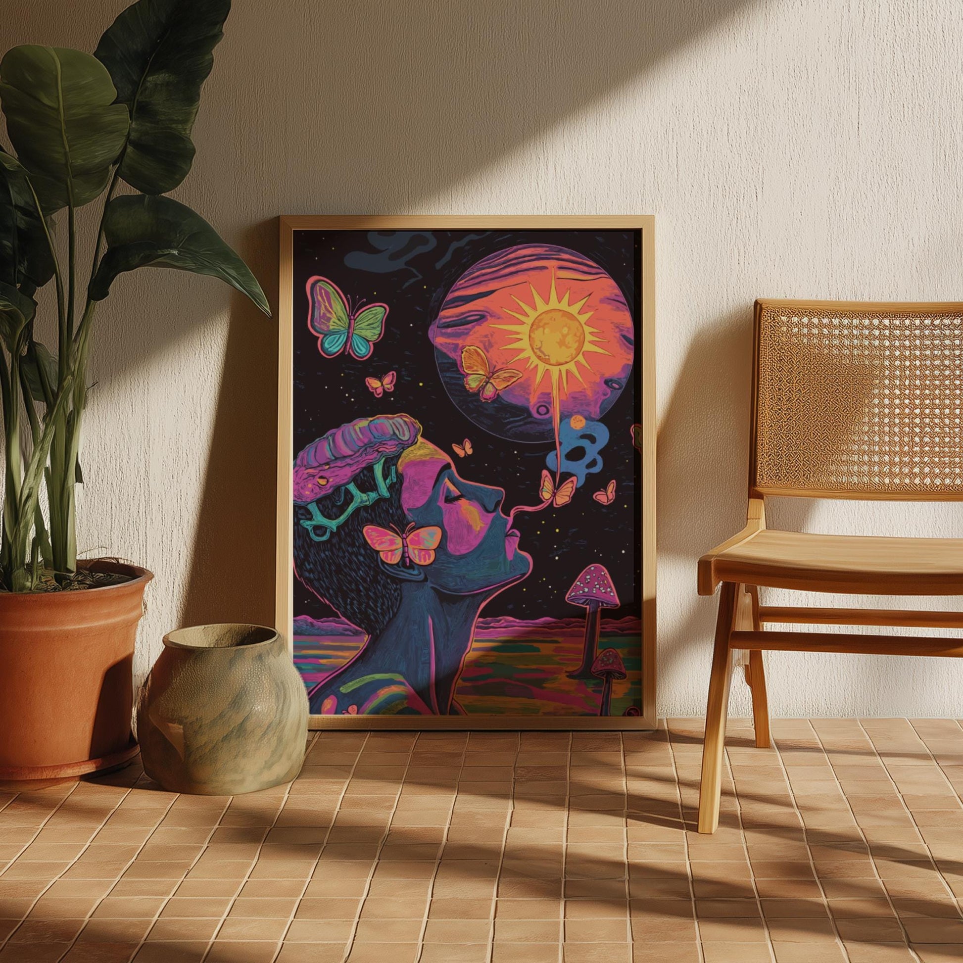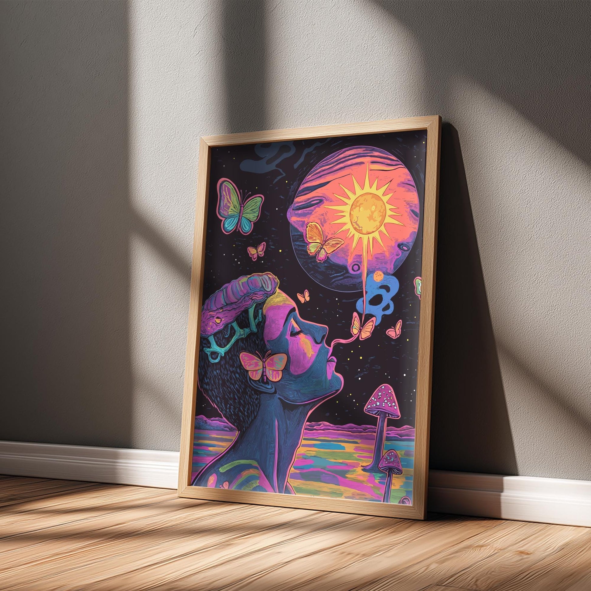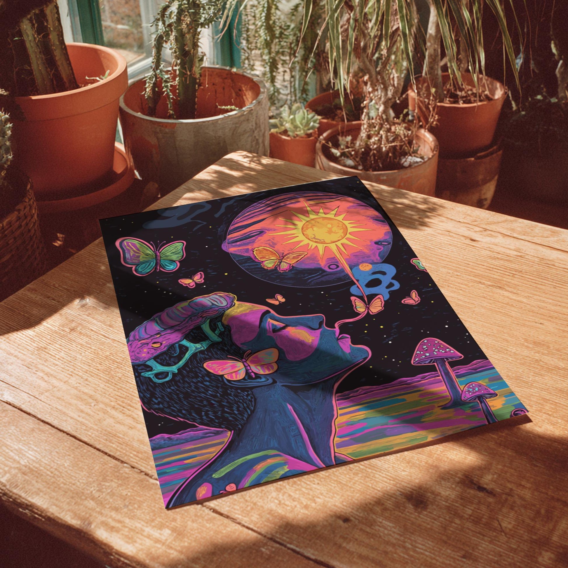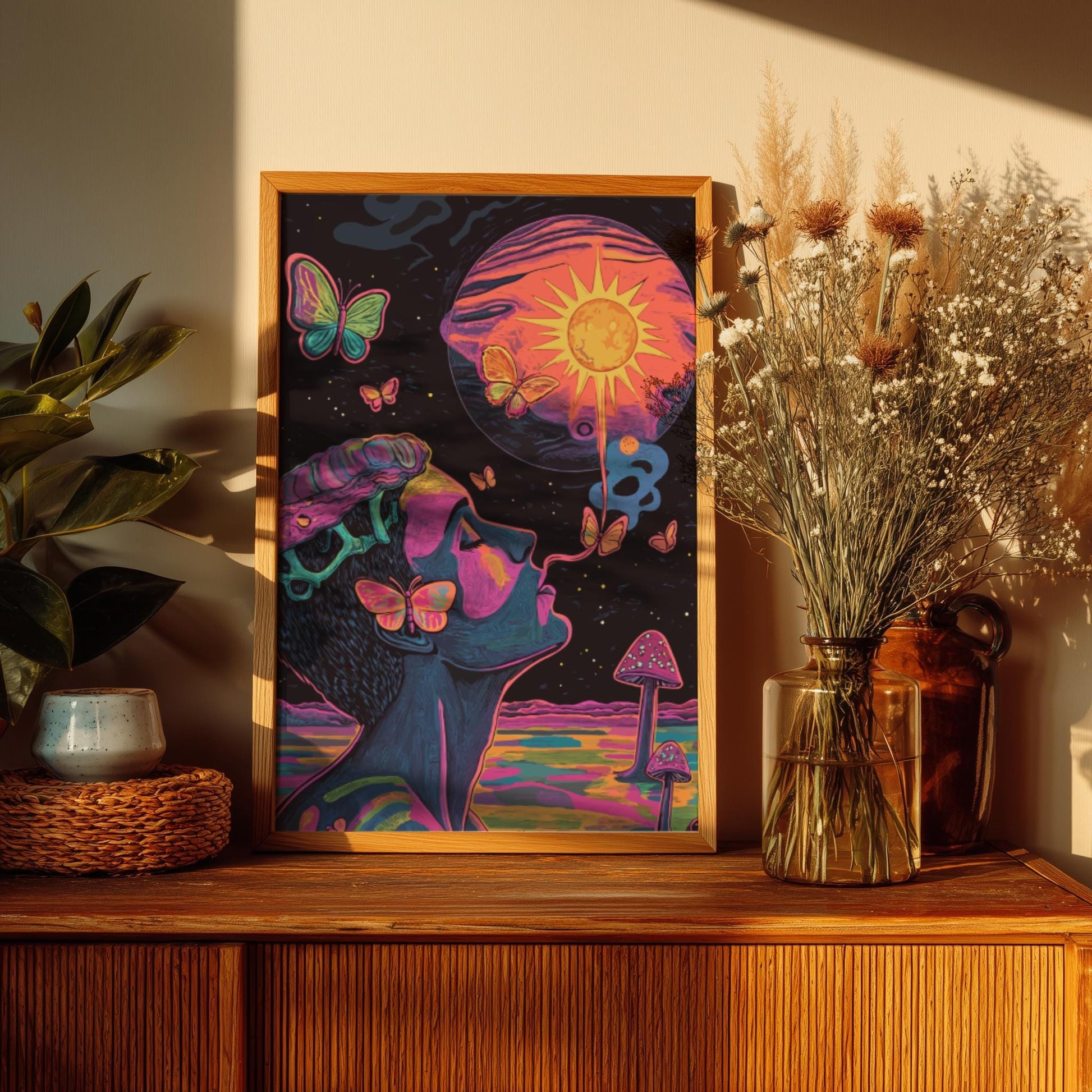 Donnez vie à la mythologie avec une touche psychédélique grâce à l' affiche Méduse psychédélique – Décoration murale mythologique et trippante . Avec sa représentation surréaliste de Méduse inspirée du néon, cette œuvre est parfaite pour les amateurs d' art trippant, d'imprimés mythologiques et de décoration bohème éclectique .