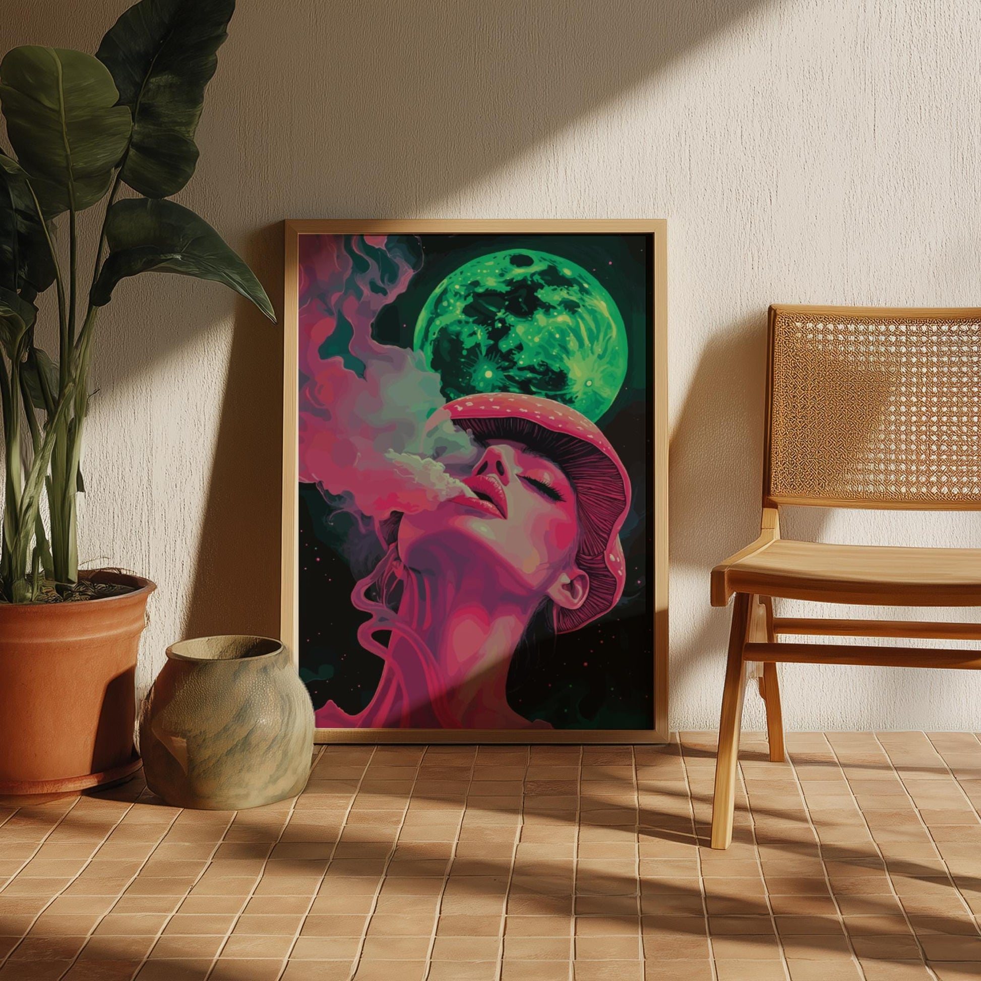 Imprimée sur des matériaux de haute qualité, l' affiche « Fille Champignon » offre des couleurs vives et des détails précis, ce qui en fait un ajout remarquable aux chambres, salons, bureaux ou studios de création . Son esthétique audacieuse et psychédélique s'intègre parfaitement aux intérieurs bohèmes, éclectiques ou surréalistes .