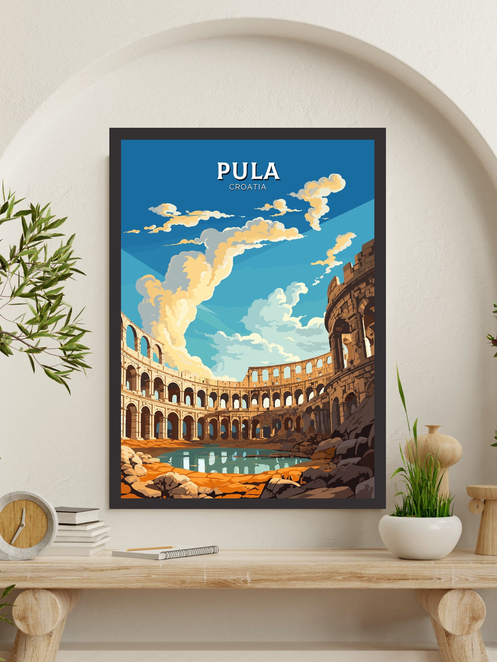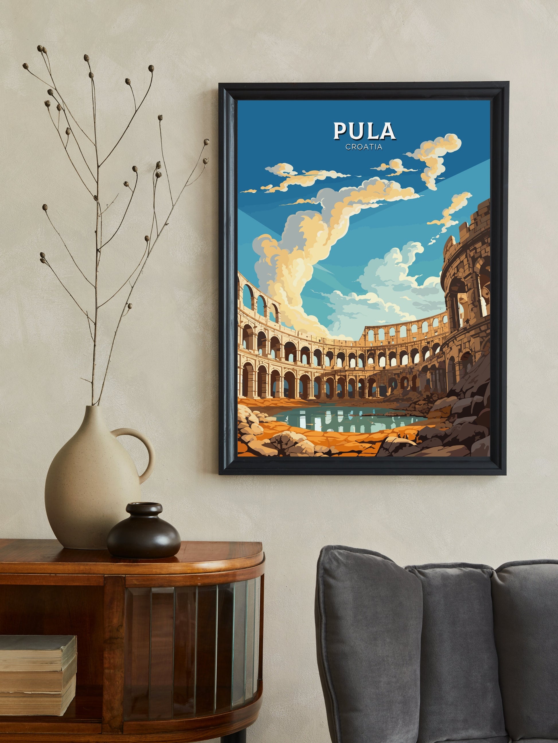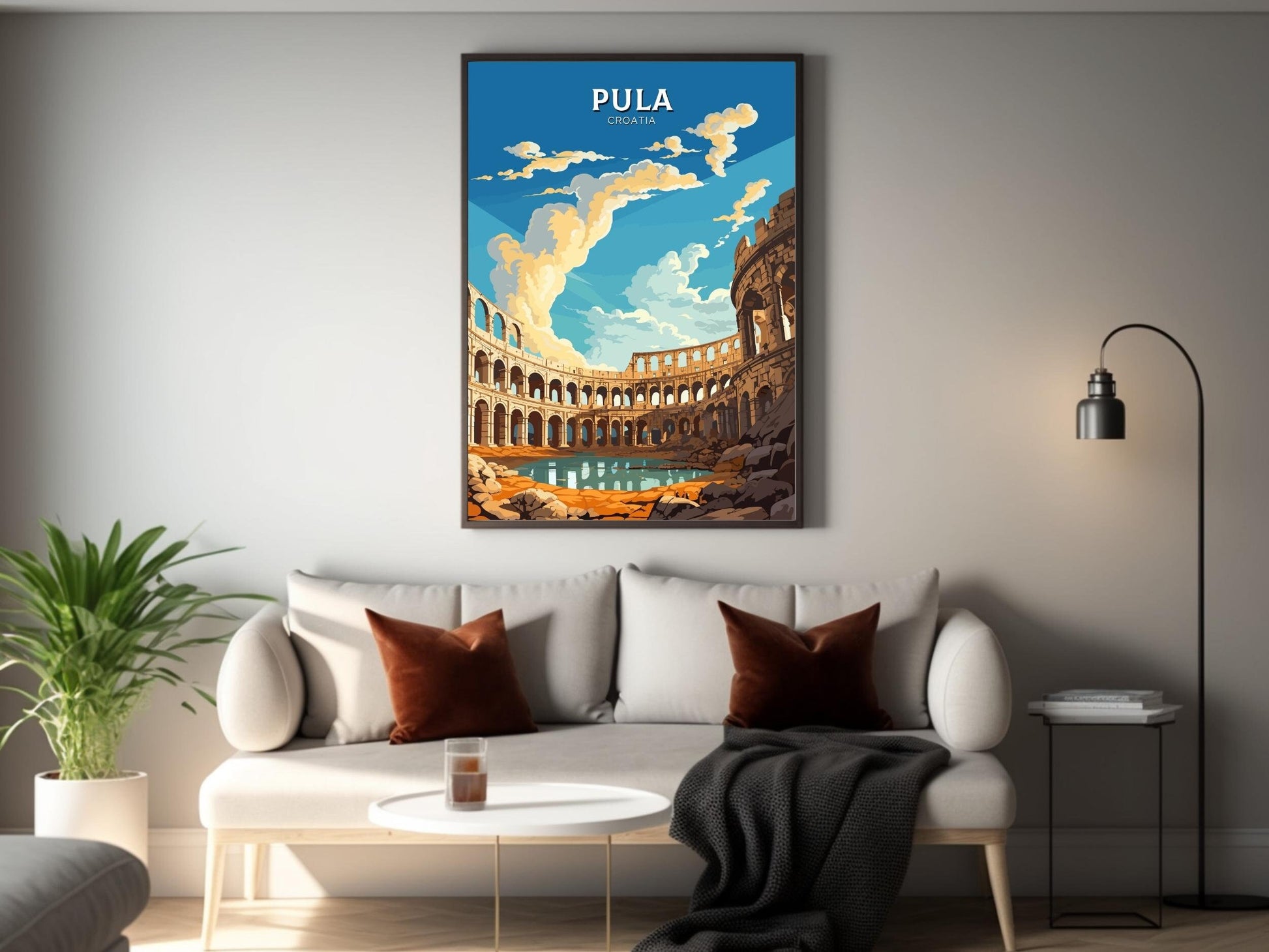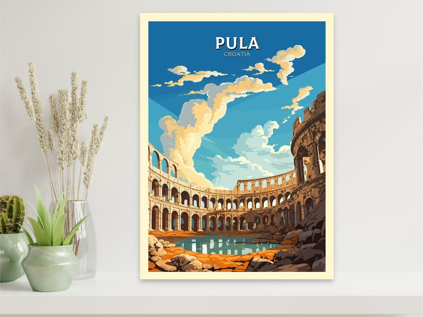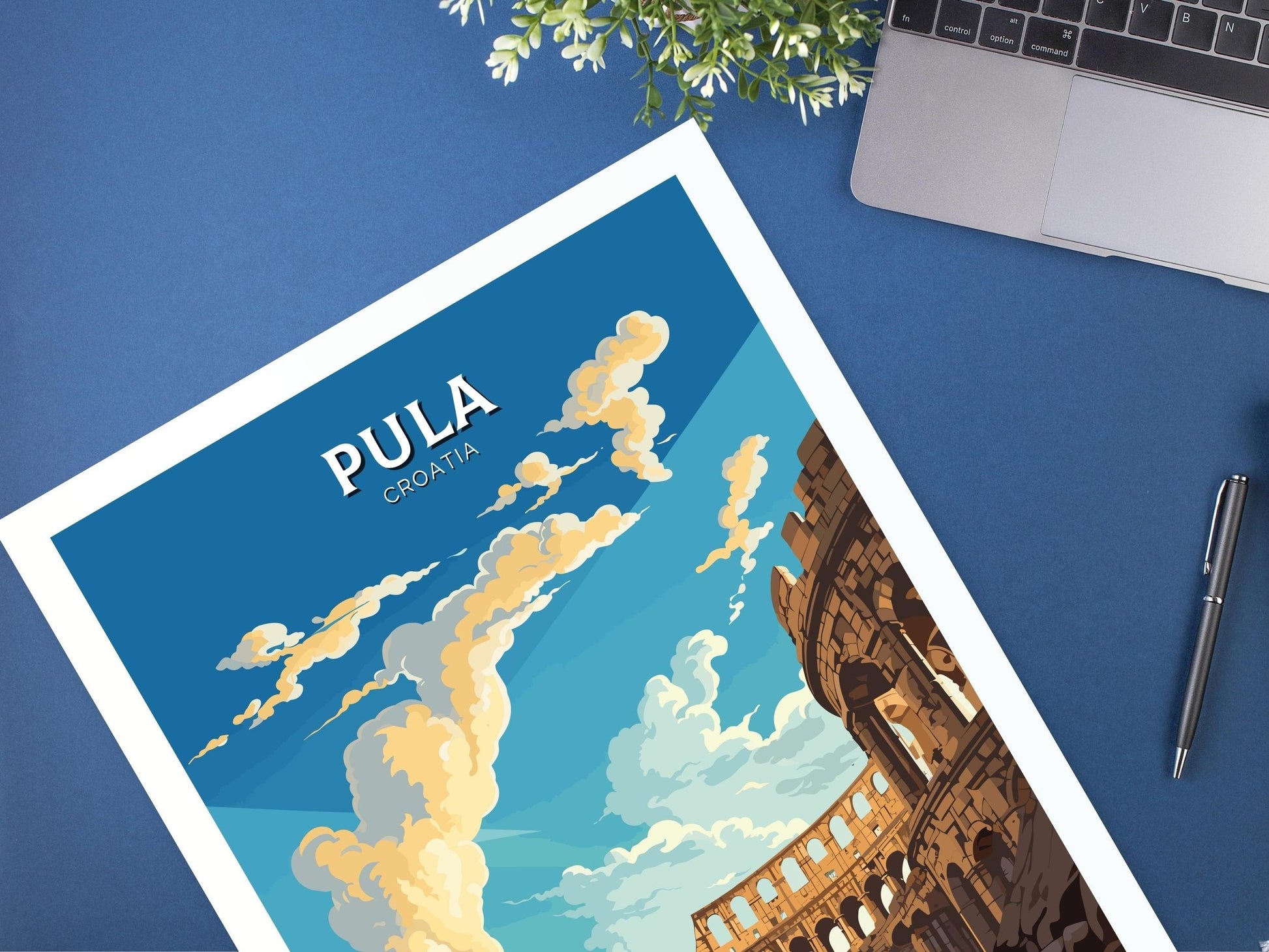 Idéale pour les passionnés d'histoire, de voyages et de culture européenne, l' affiche de voyage Pula – Croatie apportera une touche d'élégance à n'importe quelle pièce. Encadrez-la pour votre entrée, votre mur de galerie ou votre bureau et apportez un peu de la côte adriatique à votre quotidien.