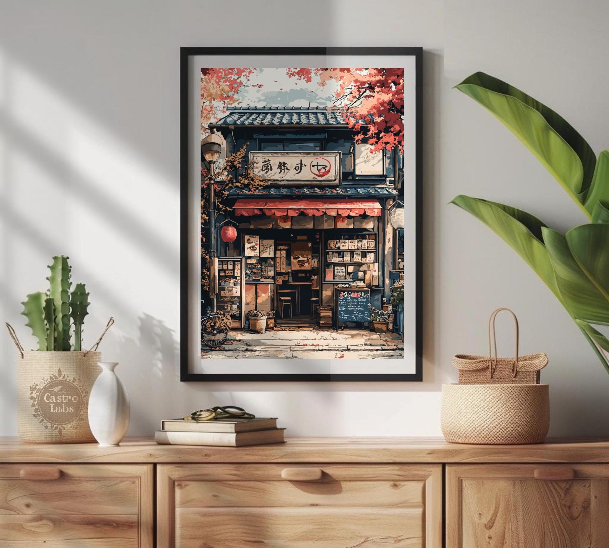 Réalisée sur un papier durable et de haute qualité, cette œuvre d'art représentant un restaurant de ramen japonais évoque l'essence même d'un paradis des nouilles. Idéale pour les gourmets ou les amateurs de saveurs orientales en quête d'une décoration murale savoureuse, elle offre une vision imprégnée de bouillon.