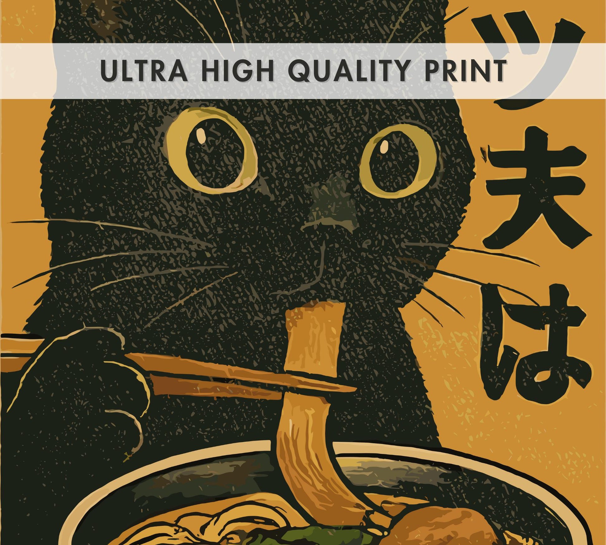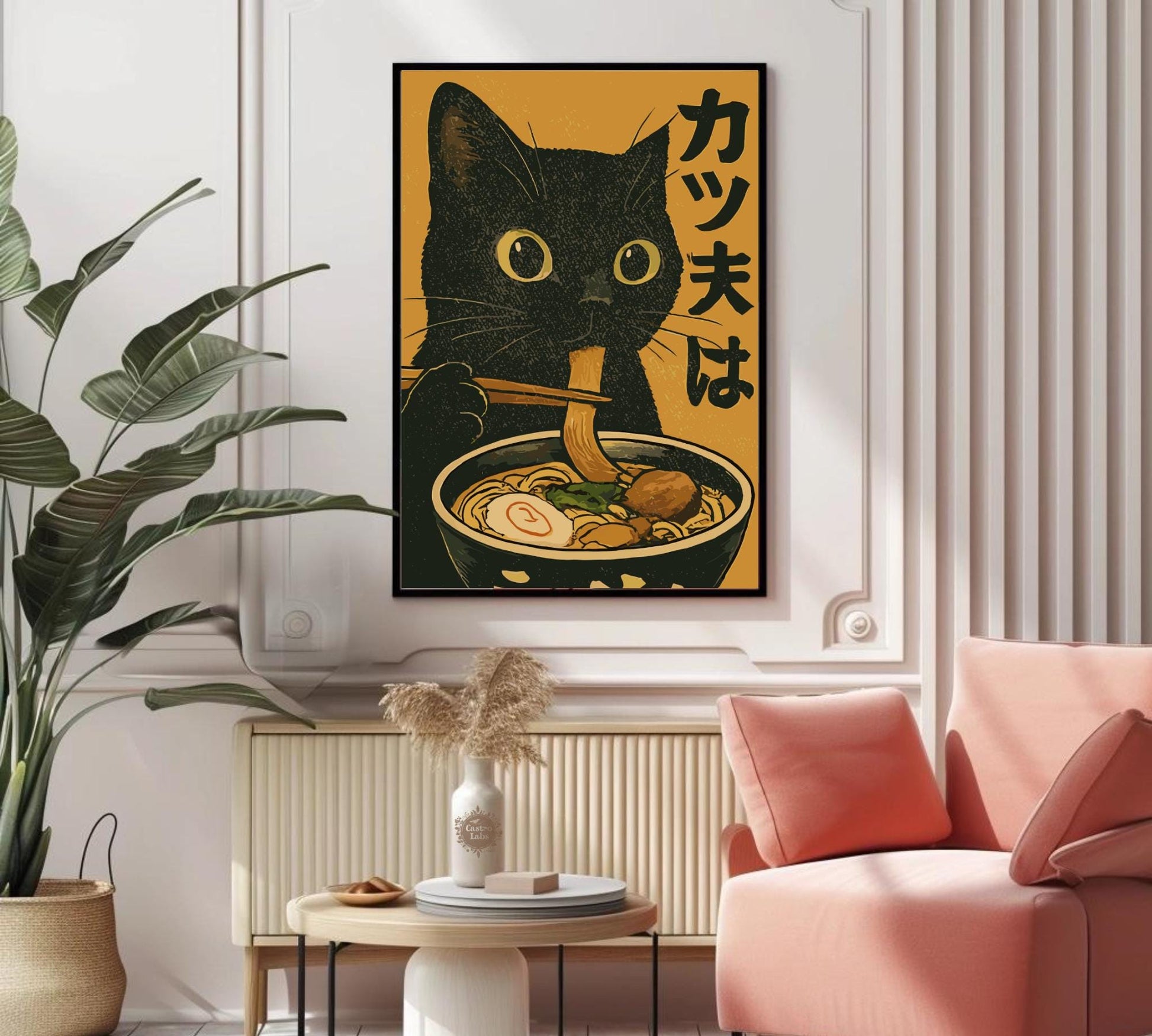 Imprimée sur un papier premium et résistant, l' affiche rétro « Chat Ramen » garantit des détails nets et une qualité durable. Les amoureux des chats, les amateurs de ramen et les amateurs d'art décalé d'inspiration kawaii adoreront cette décoration murale unique. Son design léger est parfait comme œuvre d'art individuelle ou pour compléter une galerie murale thématique.