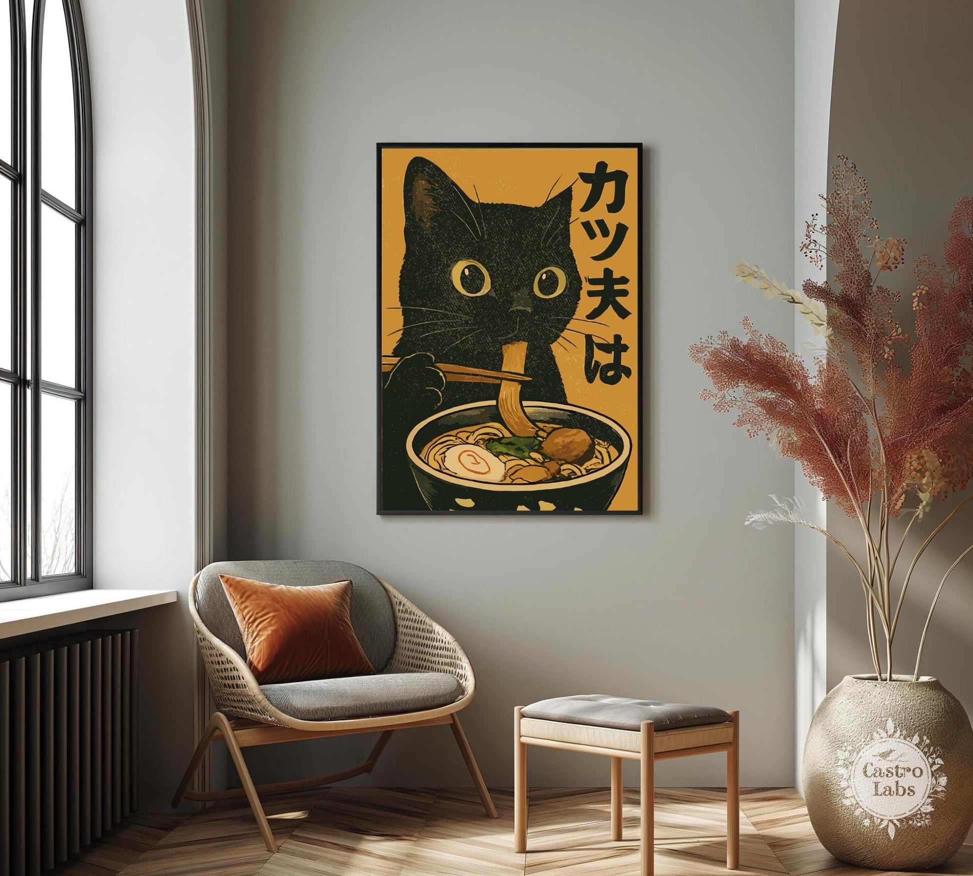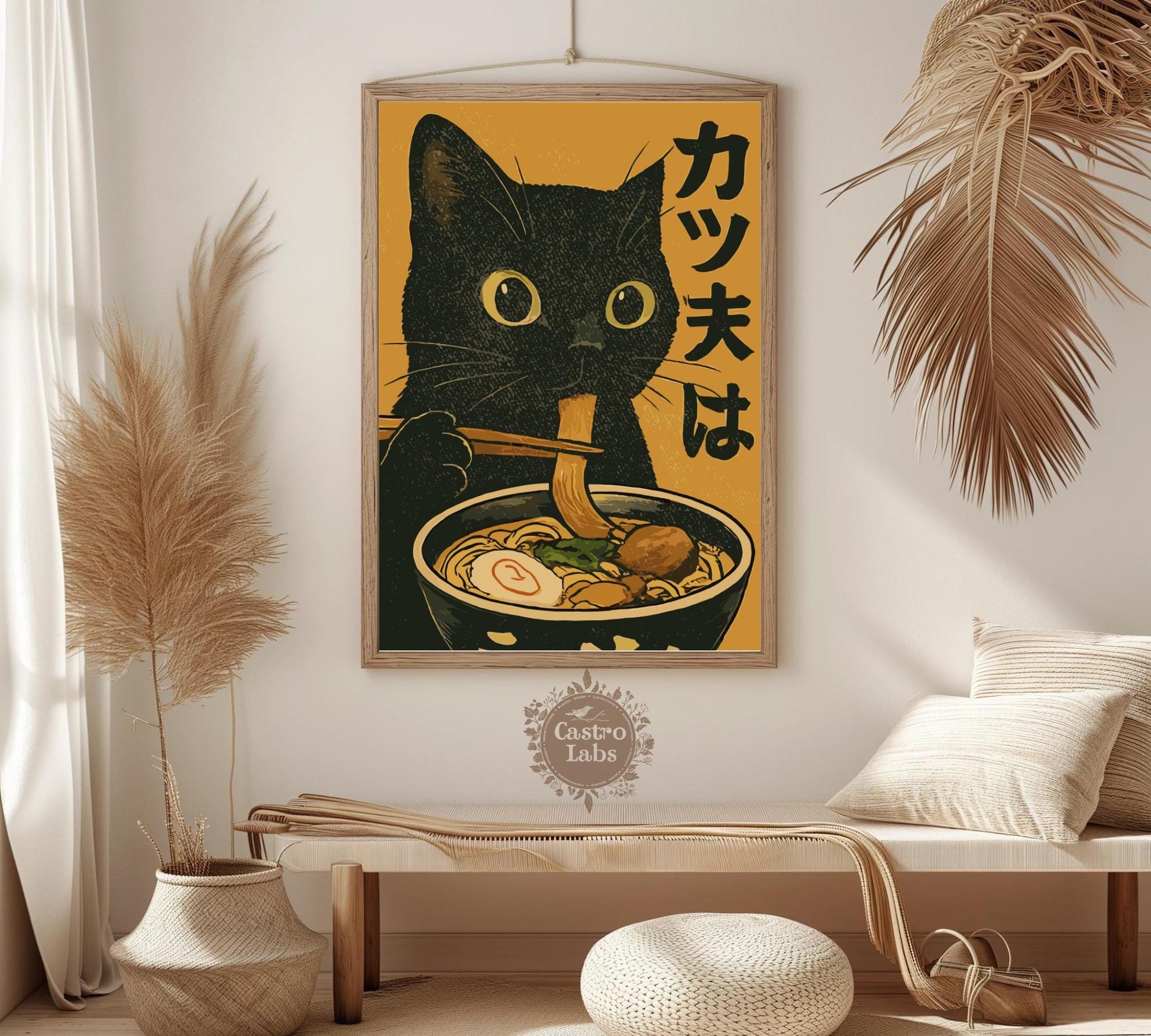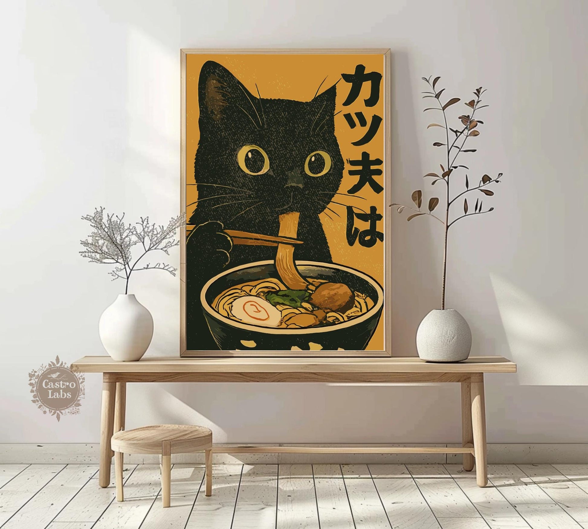 Affiche rétro de chat ramen – Impression drôle de chat mangeant des nouilles