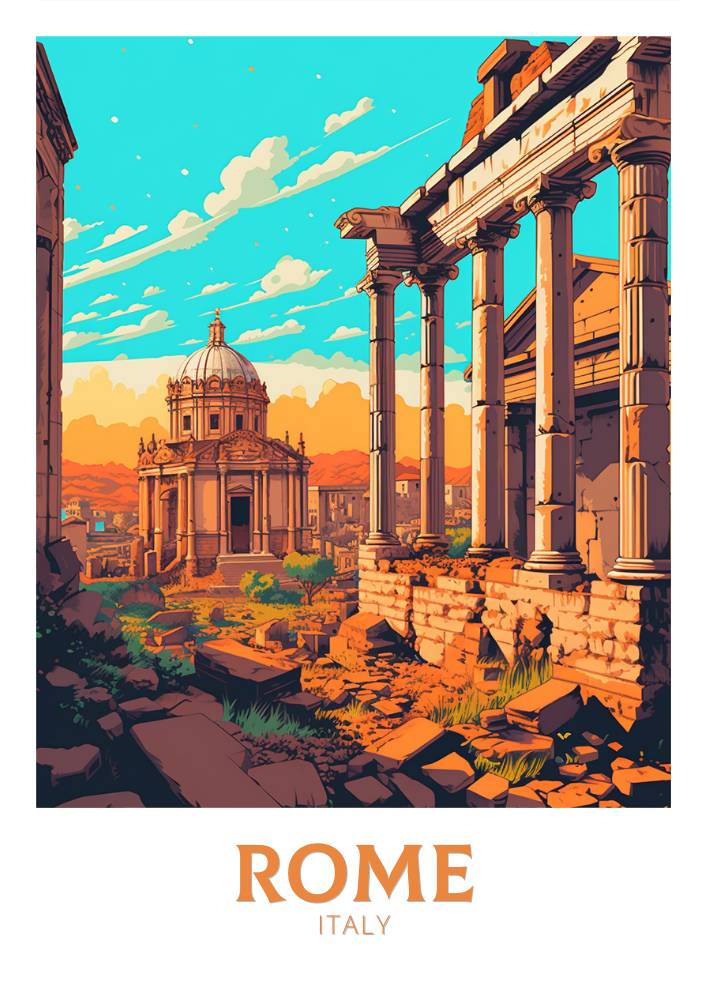 Plongez au cœur de la Rome antique avec cette captivante affiche de voyage du Forum romain – Italie . Cette magnifique affiche met en valeur les vastes ruines du Forum romain, autrefois le centre dynamique de la vie politique, commerciale et sociale de l'Empire romain. L'œuvre met magistralement en valeur des monuments emblématiques tels que le temple de Saturne, l'arc de Septime Sévère et la basilique de Maxence, le tout encadré dans une palette chaleureuse et naturelle qui évoque la beauté intemporelle de ces ruines historiques.